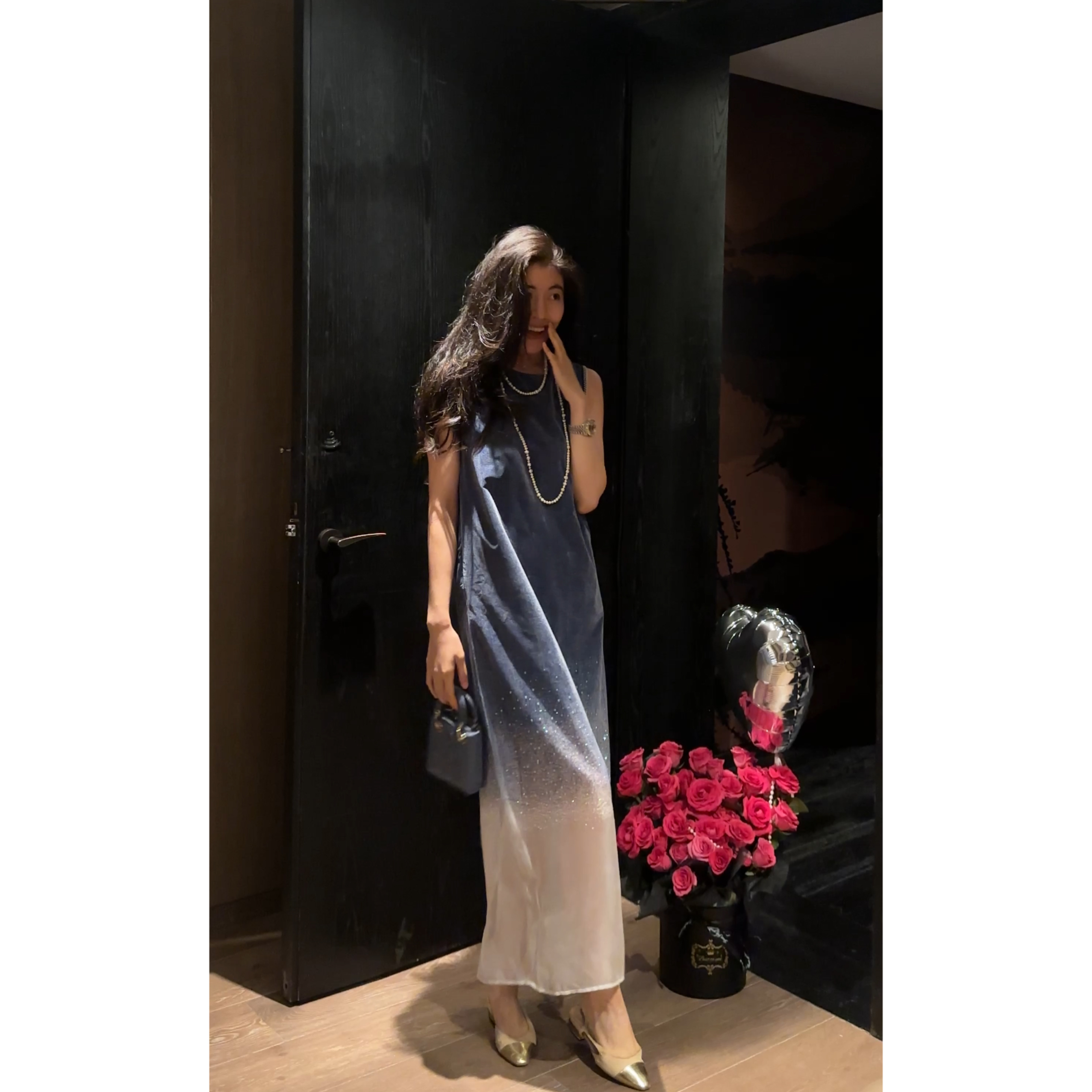 N.Cou 25 Summer New Fashionable Gradient Rhinestone Denim Color Sleeveless Long Dress for Women