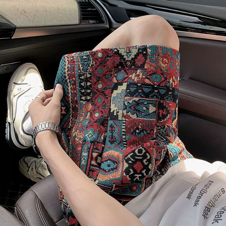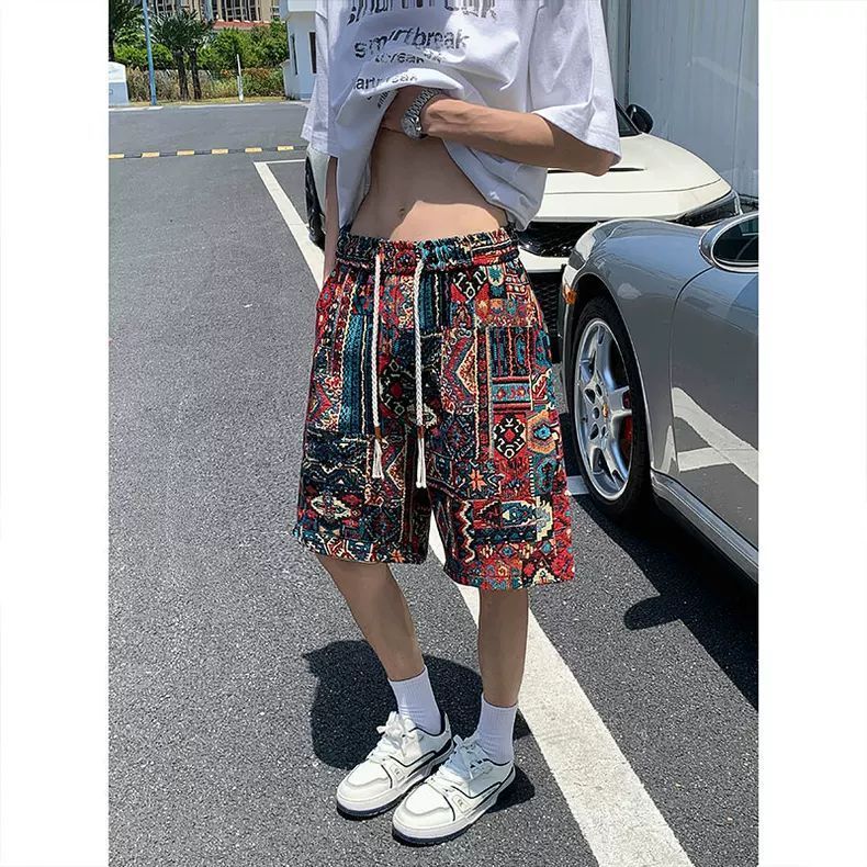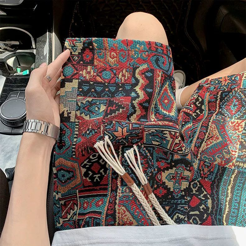 Ethnic Style Woven Shorts for Men, Summer Printed Design, Five-Point Pants, Vintage Casual Beach Shorts
