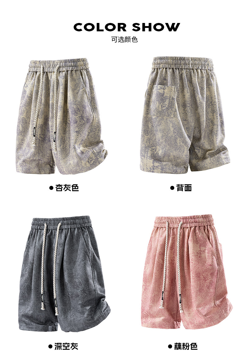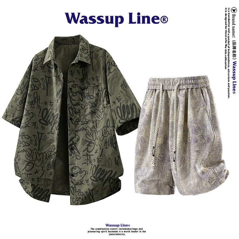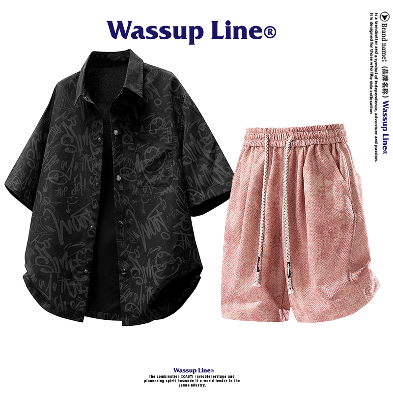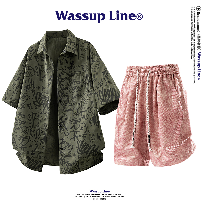 Wassup Line Trendy Summer Casual Suit for Men, Short-Sleeved Shirt, Tie-Dye Shorts, Sports Versatile Two-Piece Set