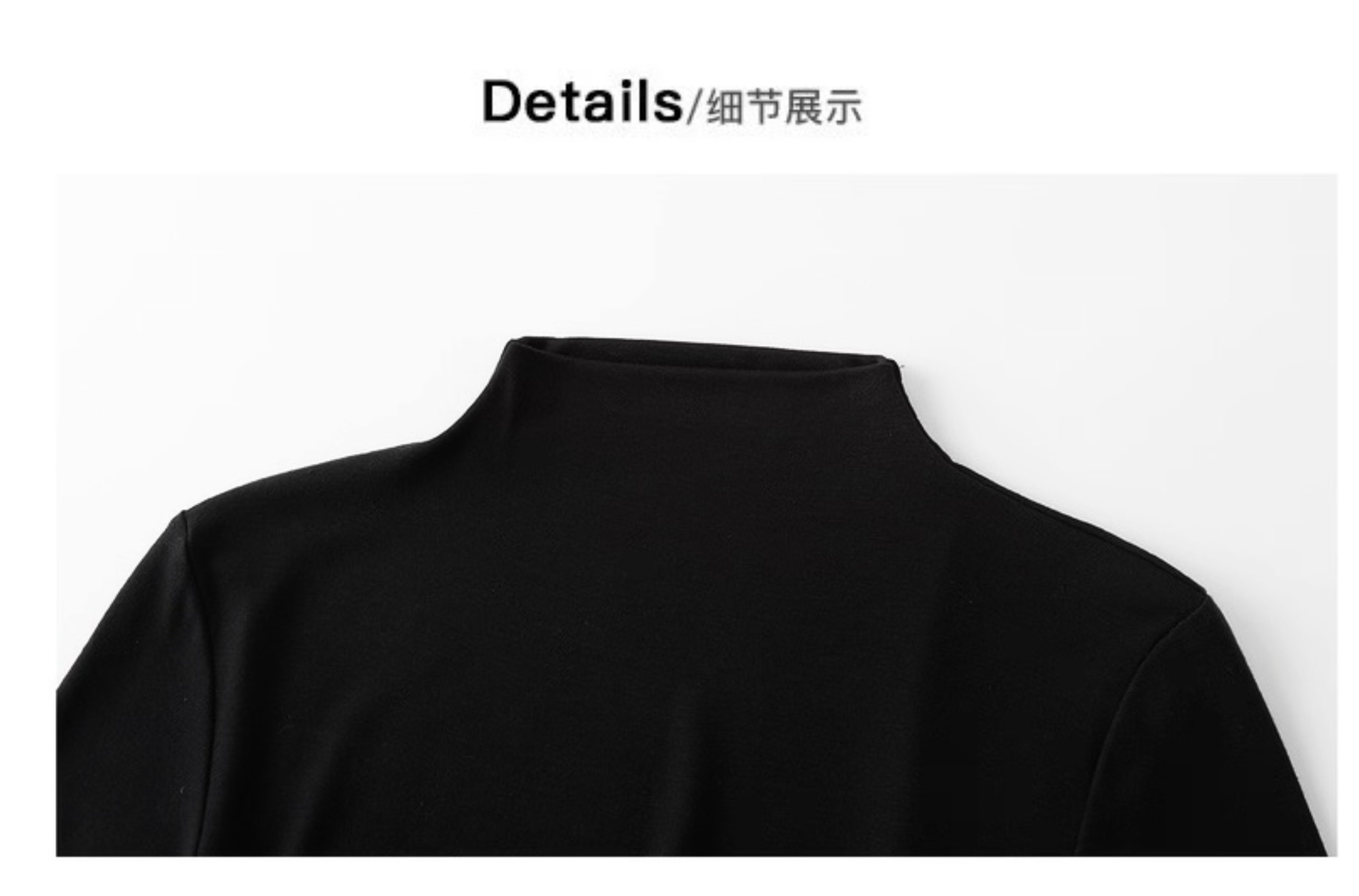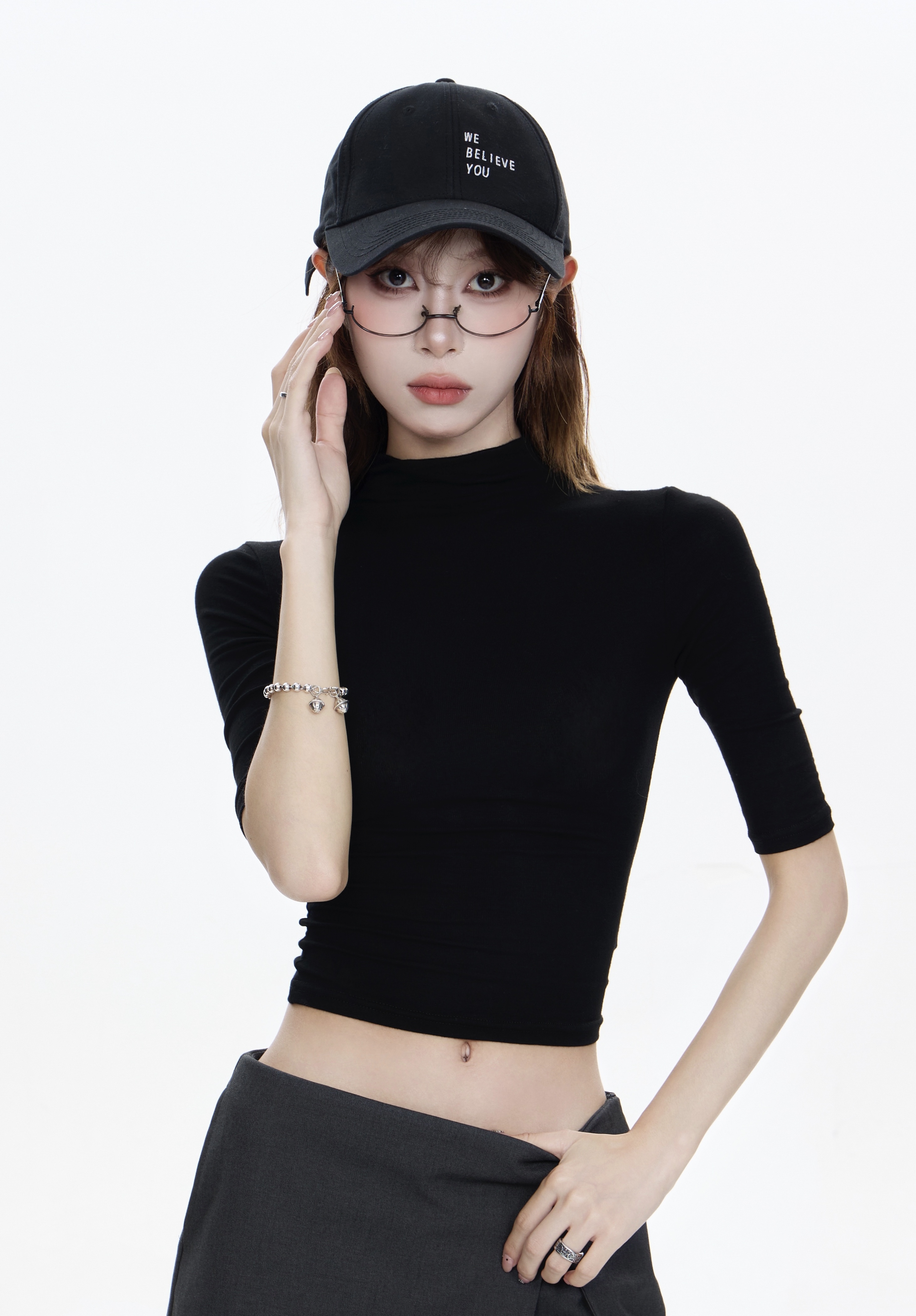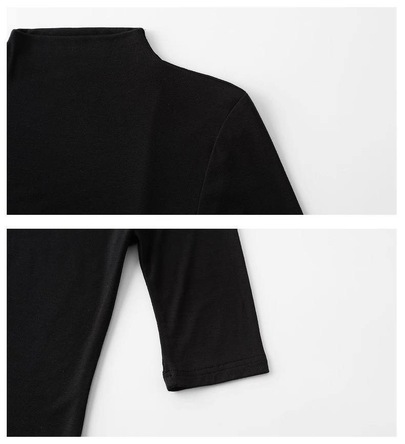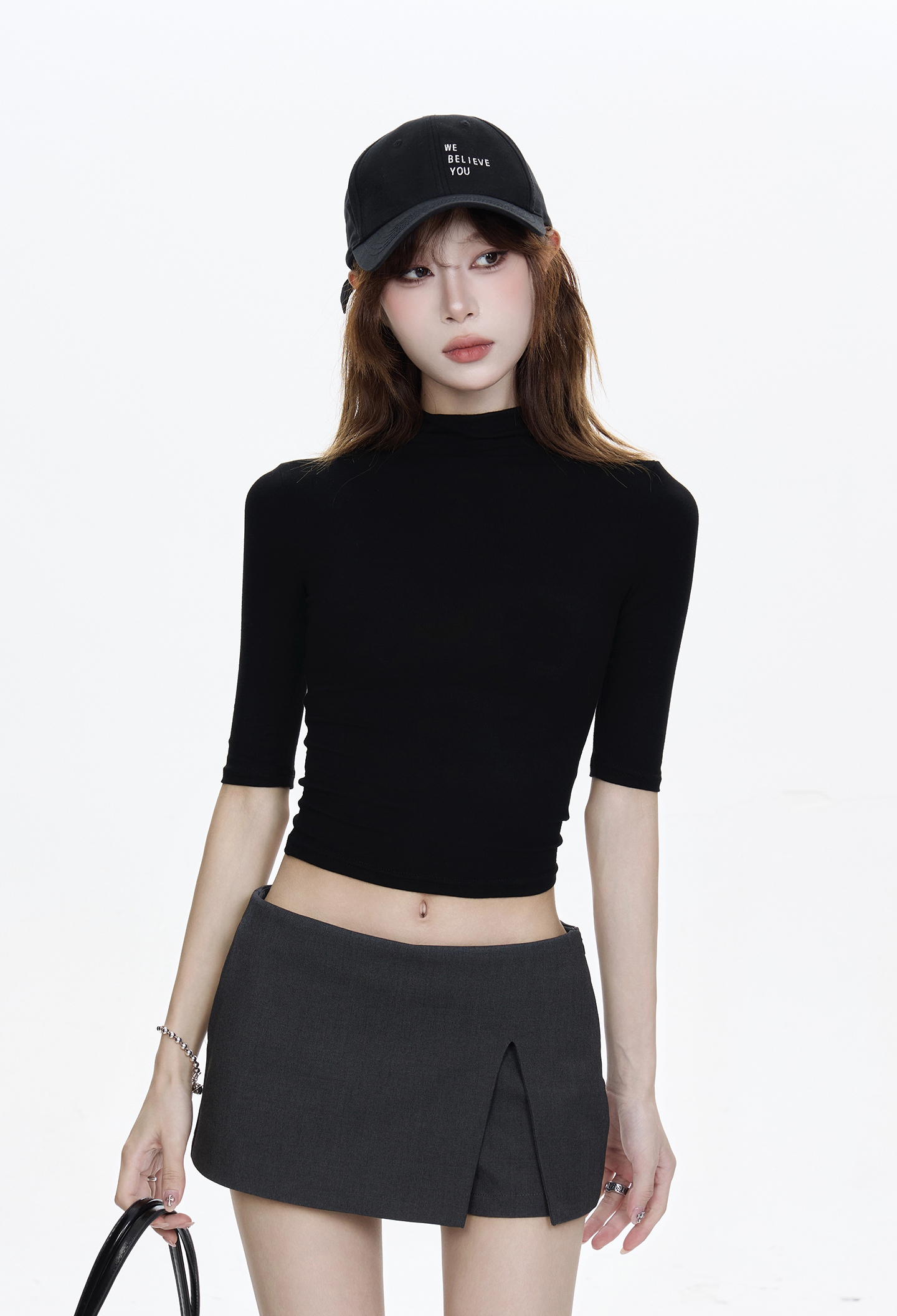 Black Spicy Girl Style Half-High Collar Knitted T-Shirt for Women, 2025 Autumn Half-Sleeve Waist-Cinching Slimming Inner Layer Top