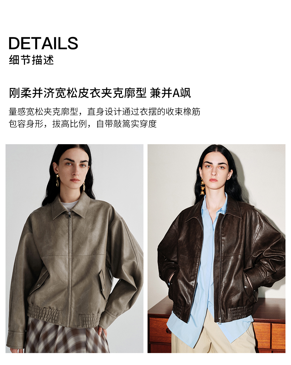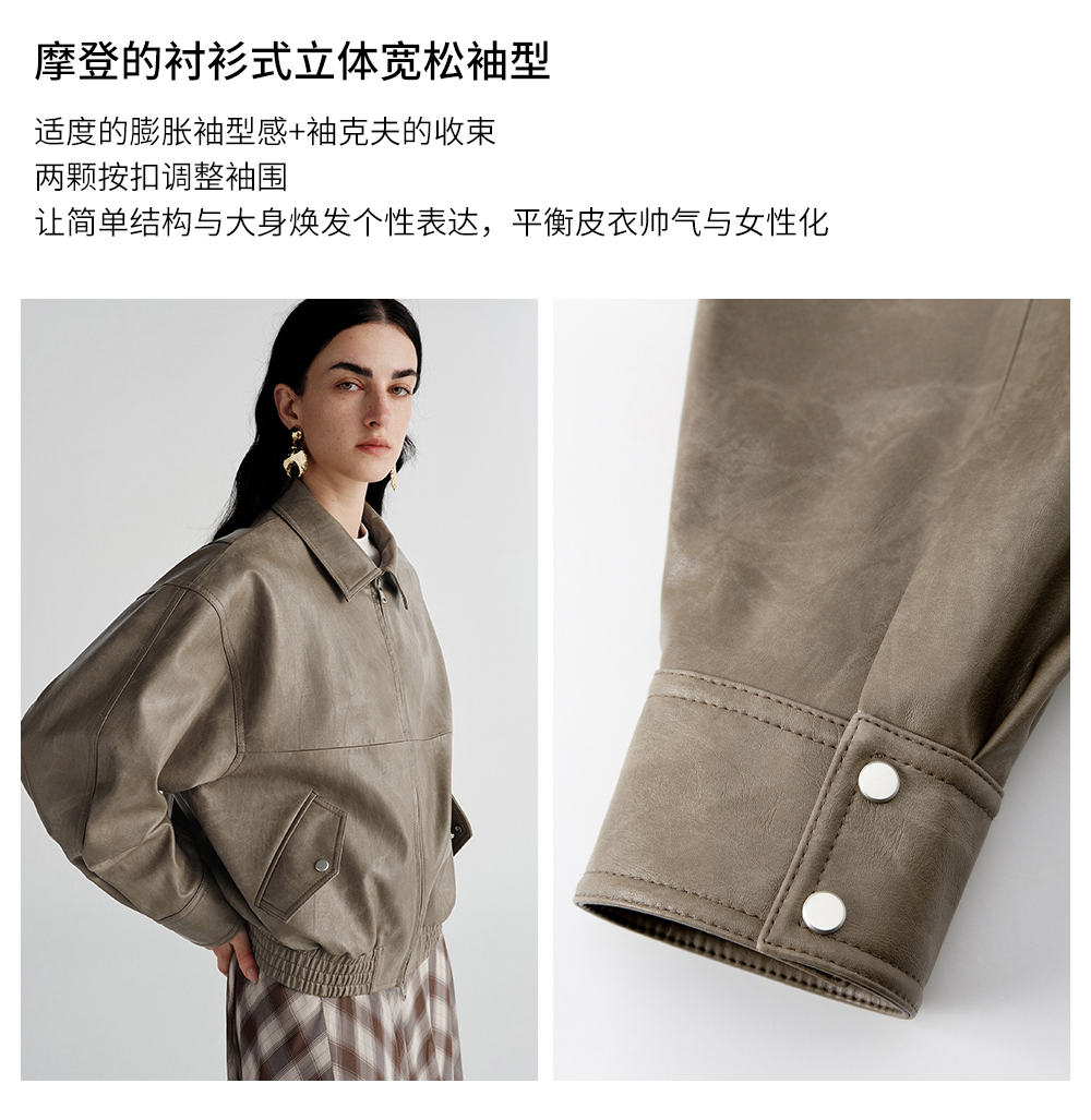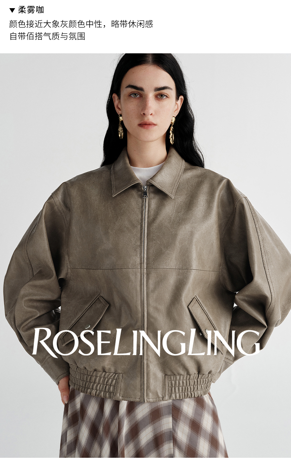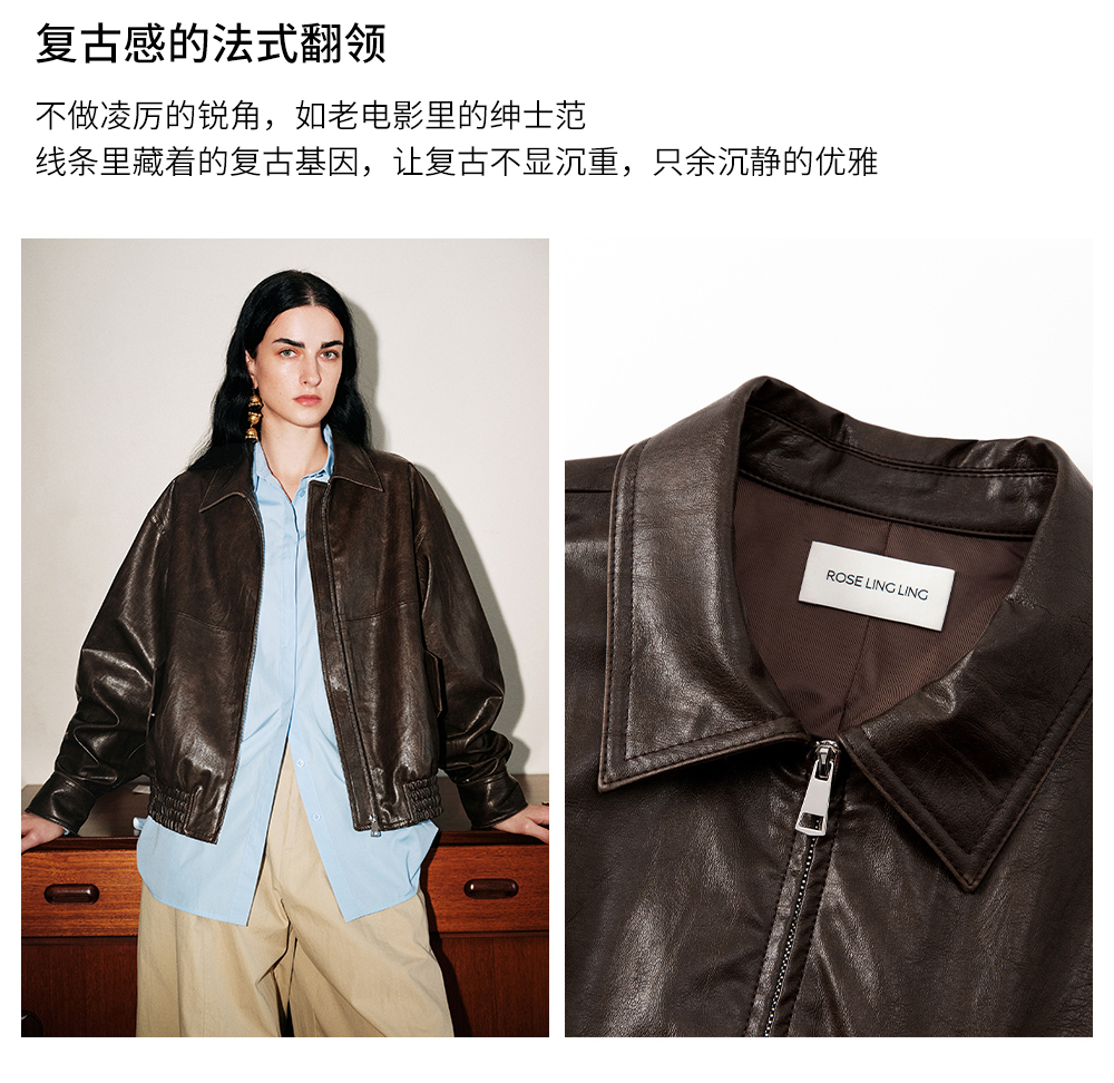 Roselingling Retro Brown Motorcycle Leather Jacket Lapel Coffee Color Loose Short Leather Jacket for Women