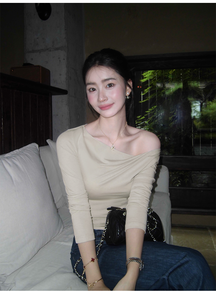 Pusumede Elegant Senior Sister Style Off-Shoulder Knitted T-Shirt for Women, Long-Sleeved, Slim-Fitting, High-End Design, Exposed Shoulder Top