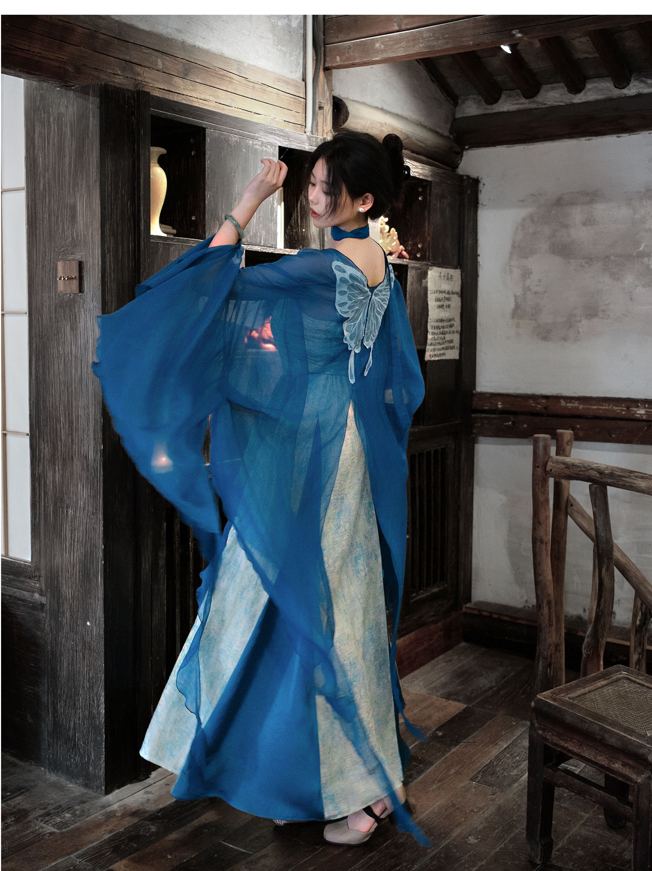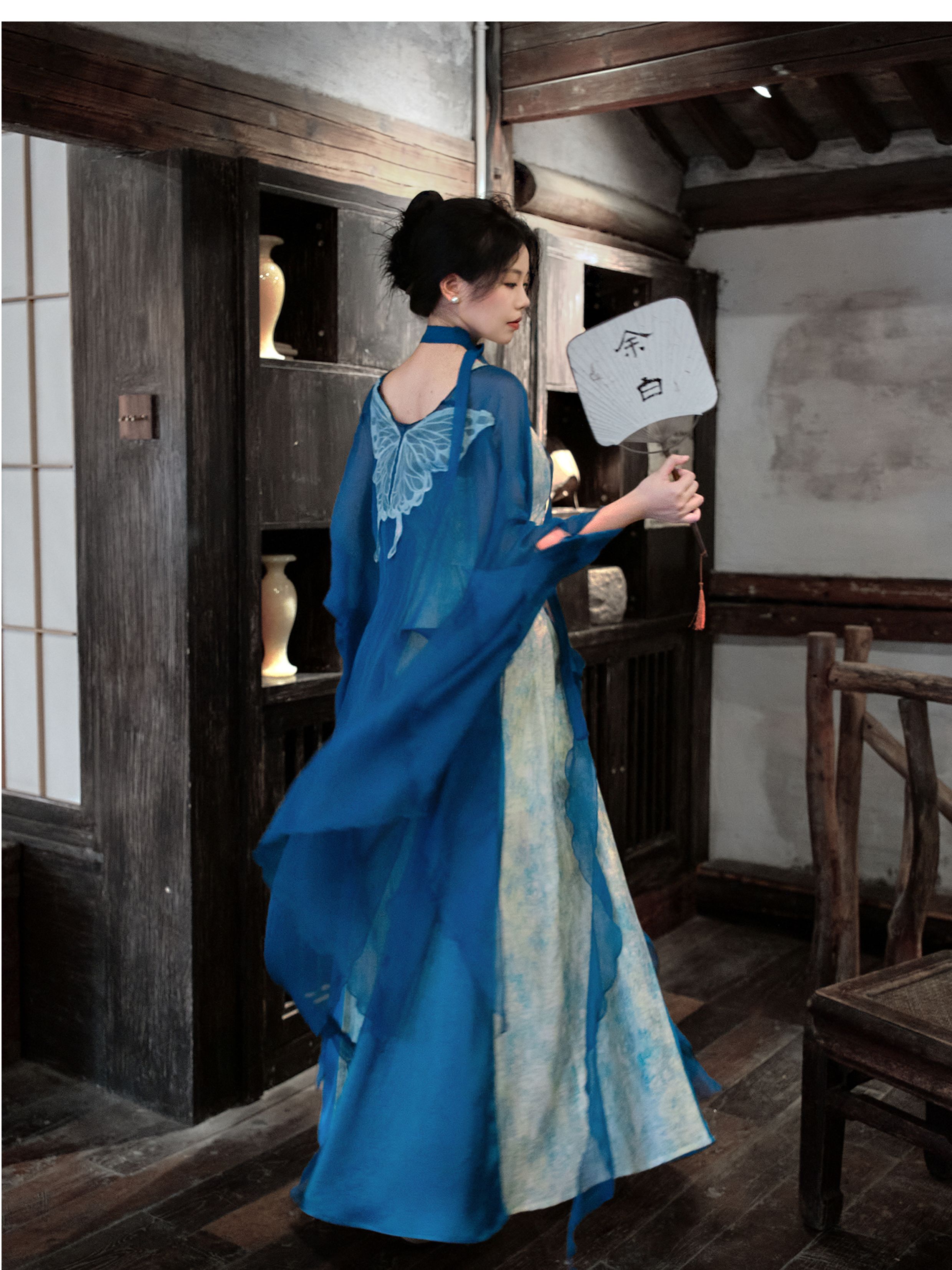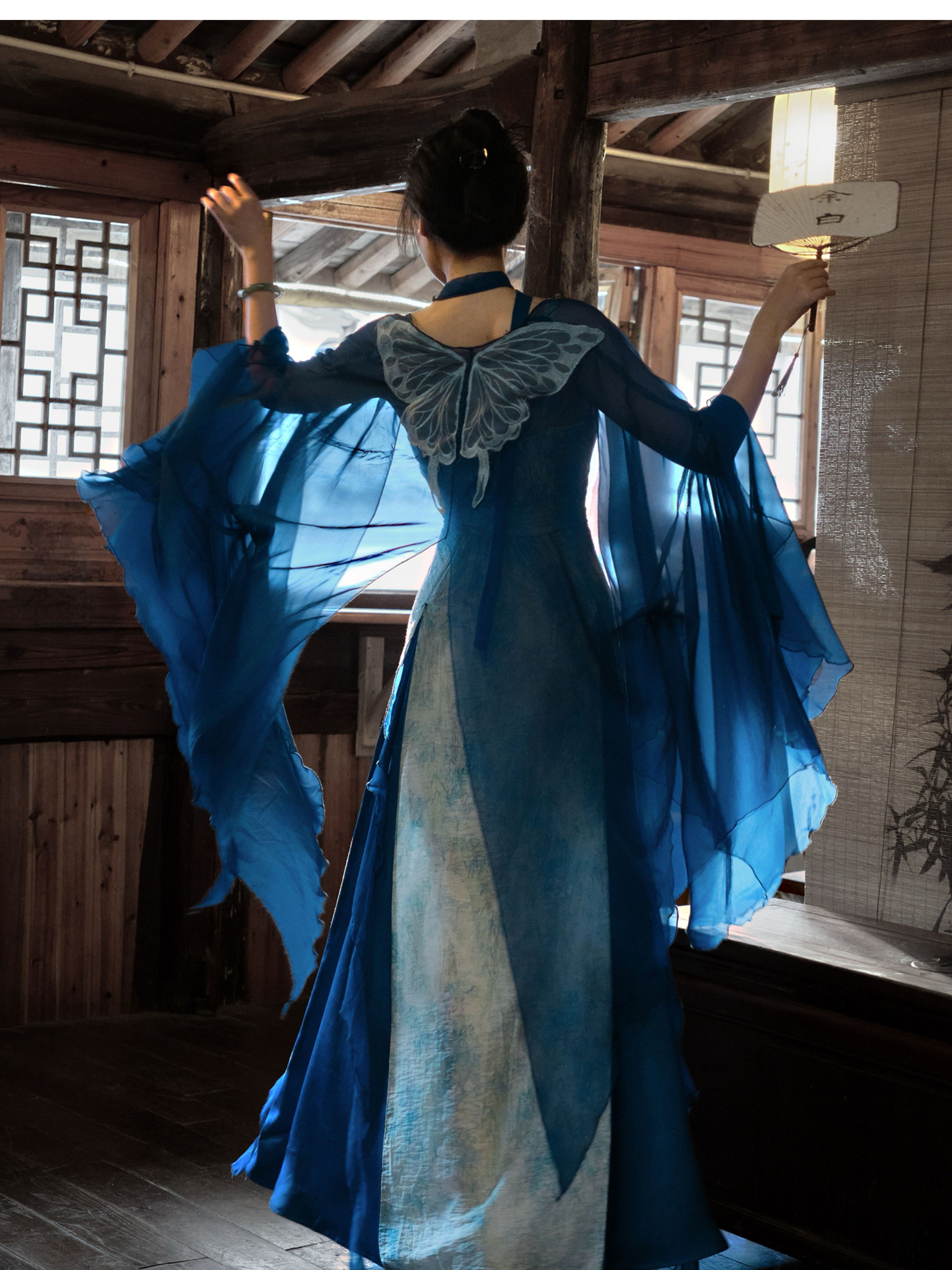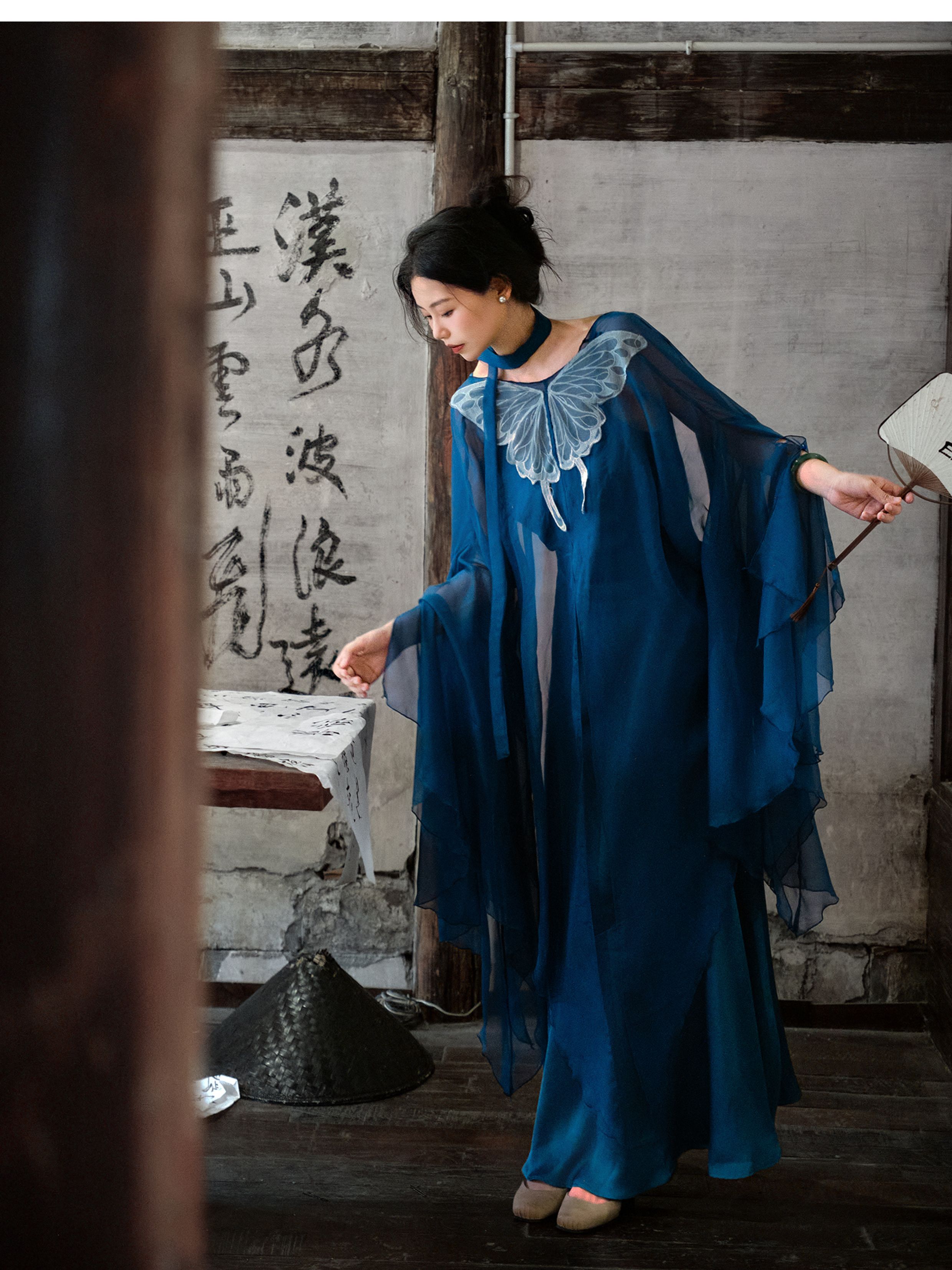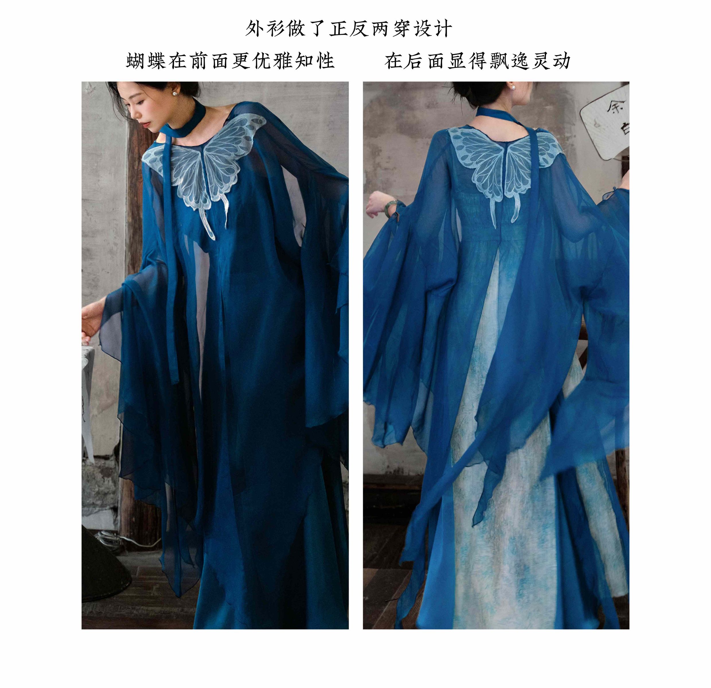 Yu Bai New Chinese Style [Qingshan Xing] Blue Butterfly Original Design Women's Modified Daily Dress with Cool Jacquard Embroidery
