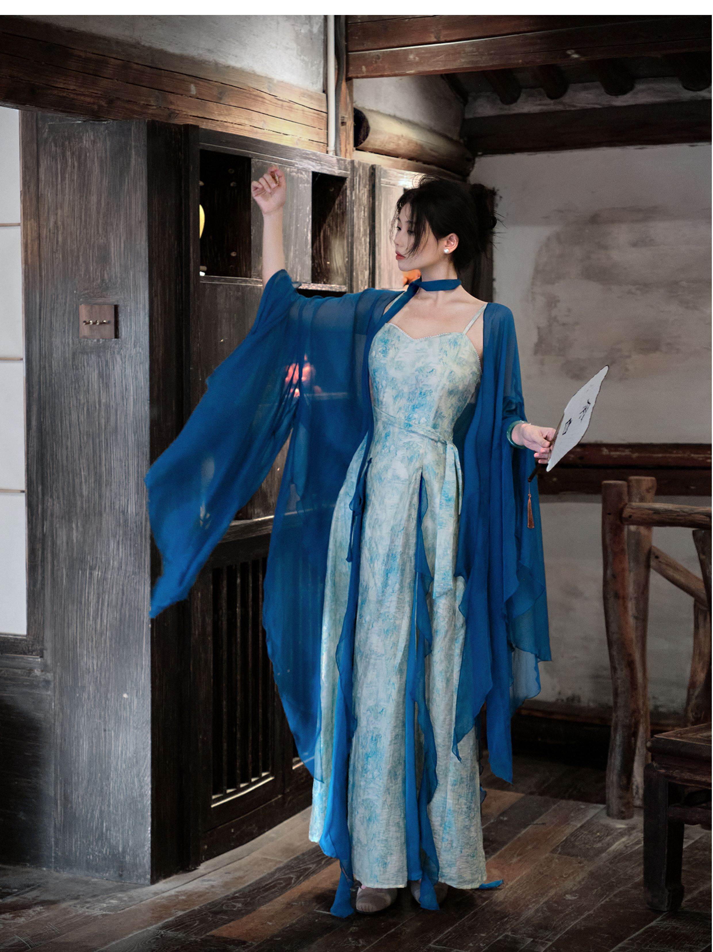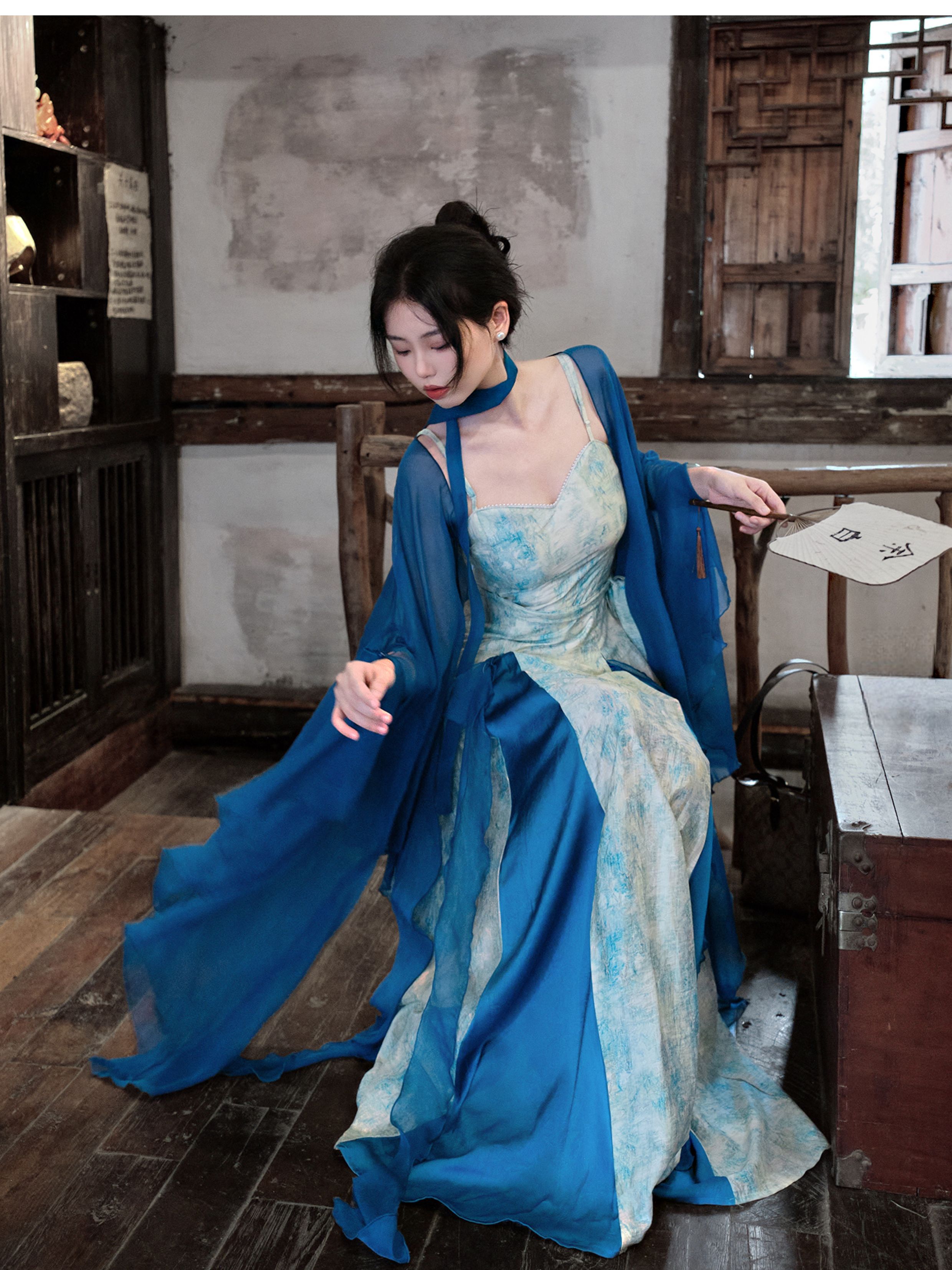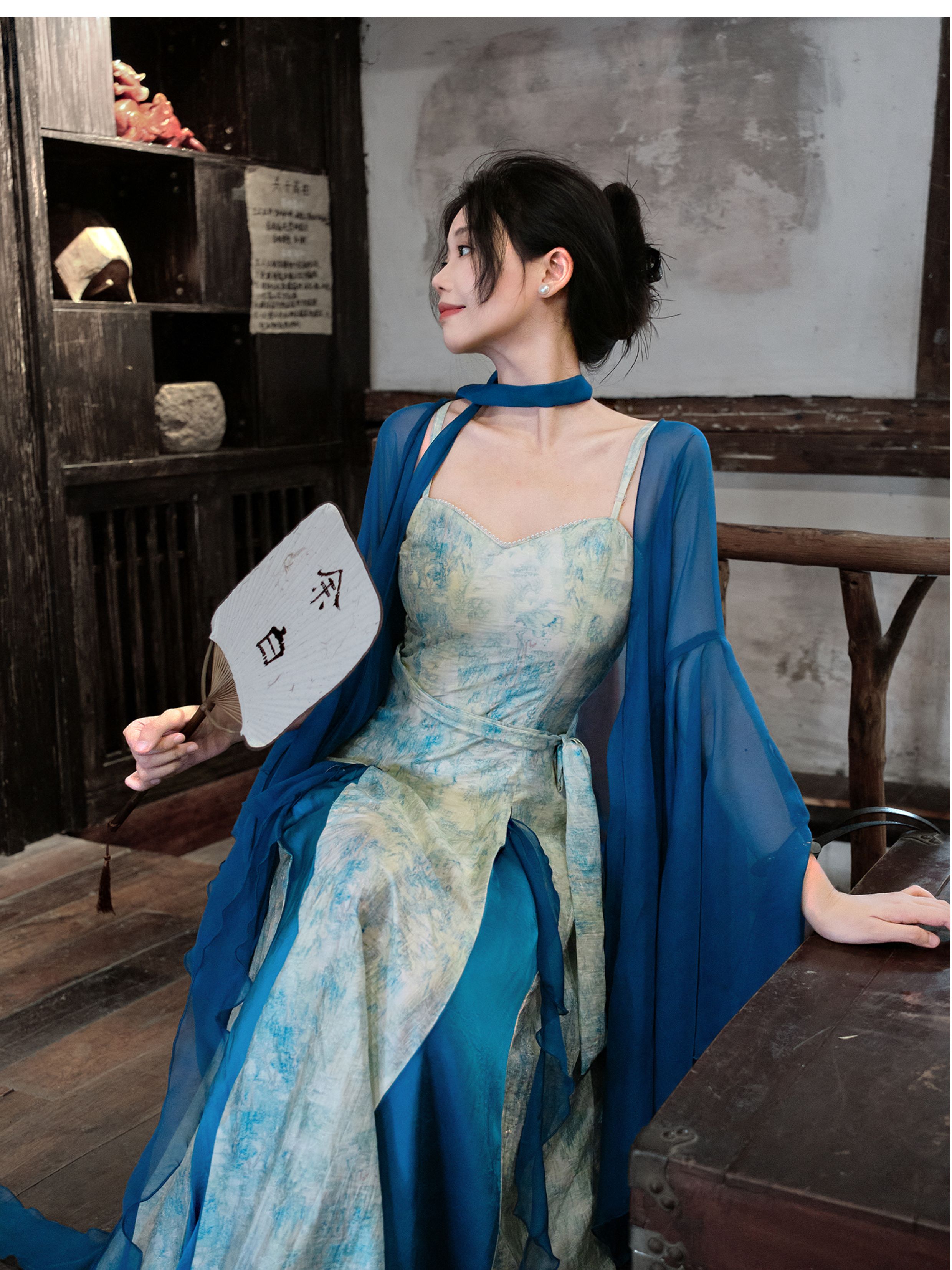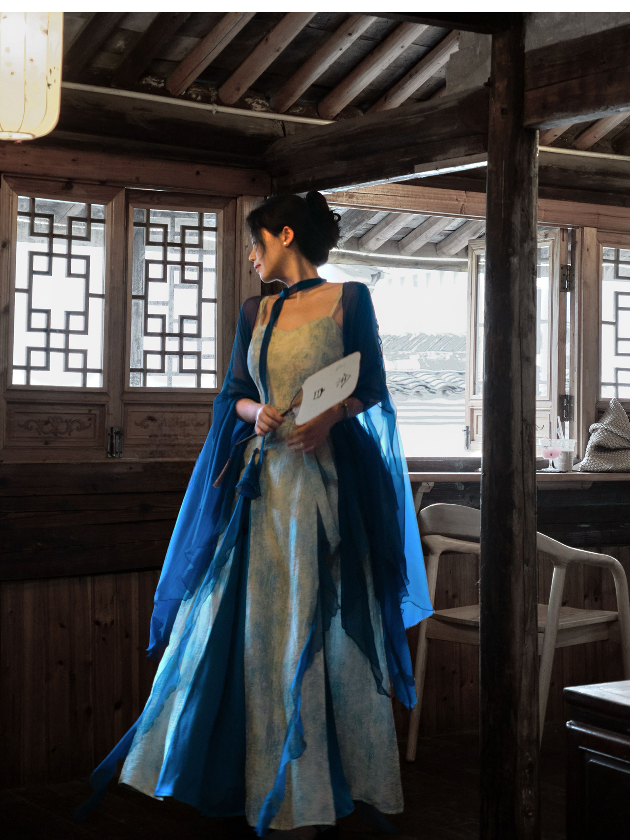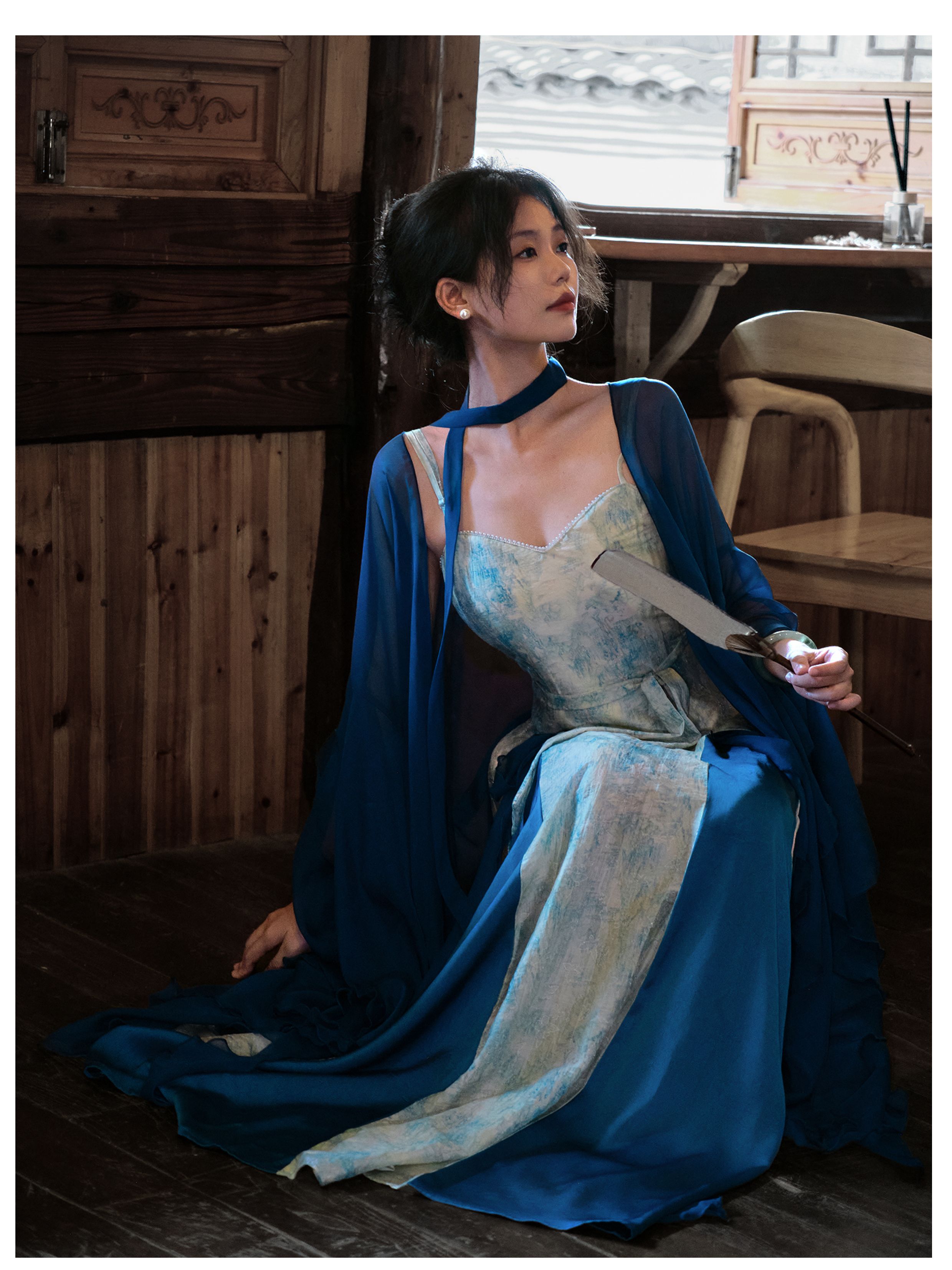 Yu Bai New Chinese Style [Qingshan Xing] Blue Butterfly Original Design Women's Modified Daily Dress with Cool Jacquard Embroidery