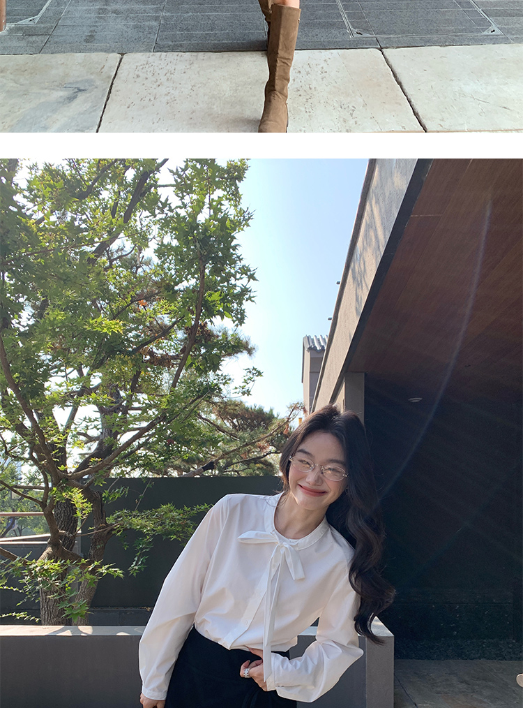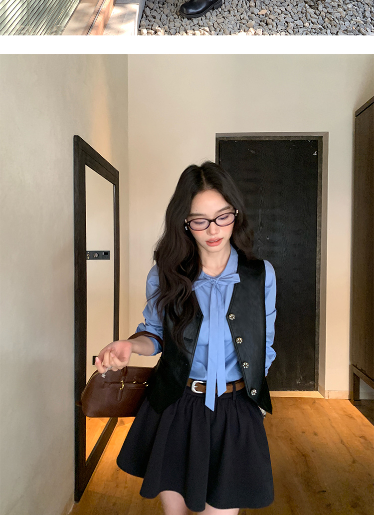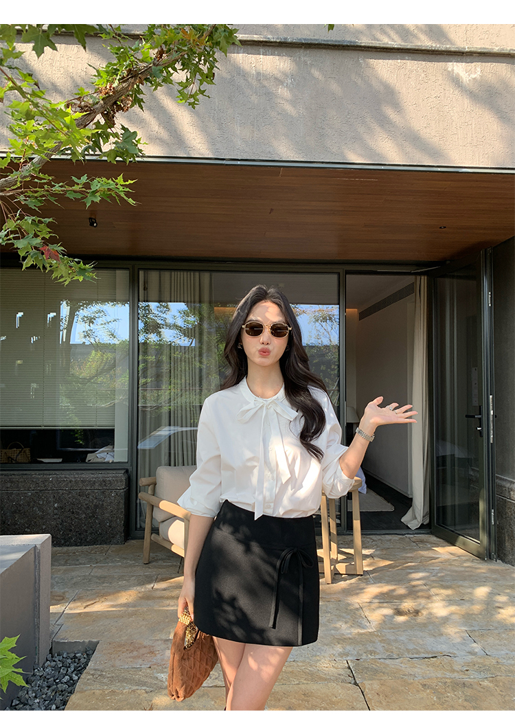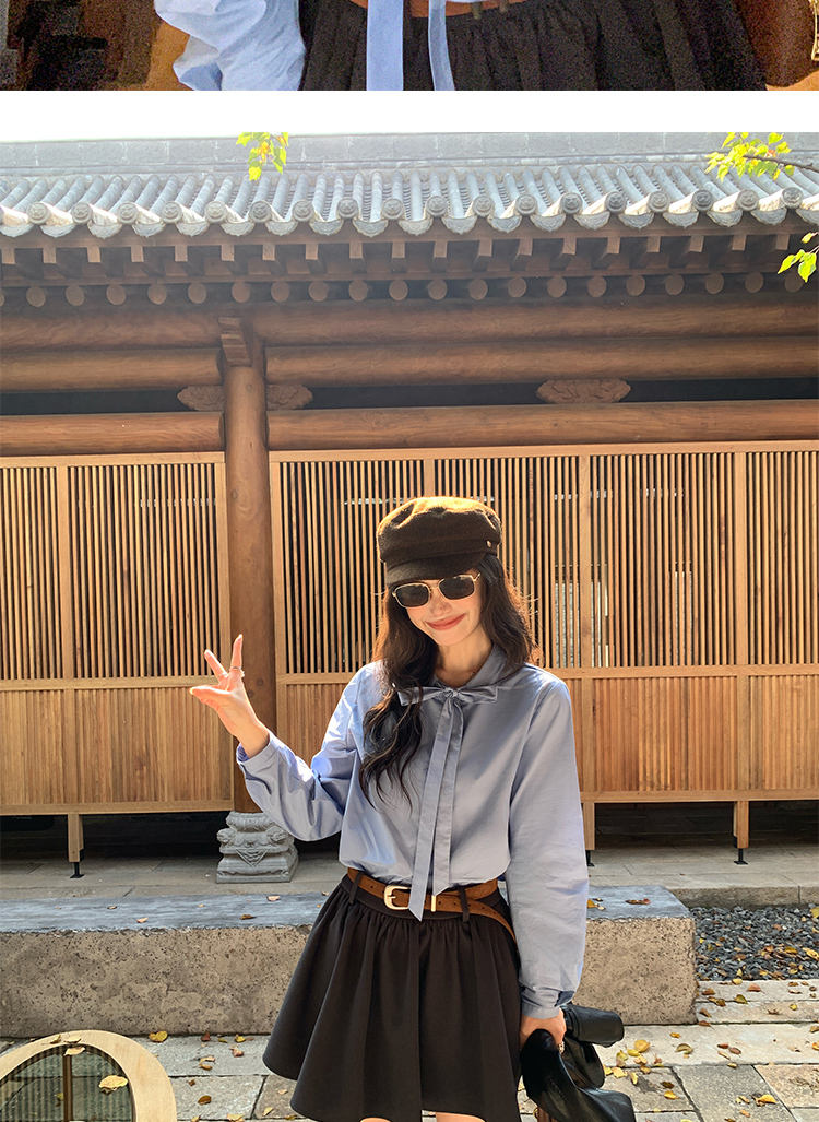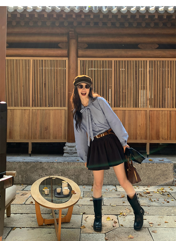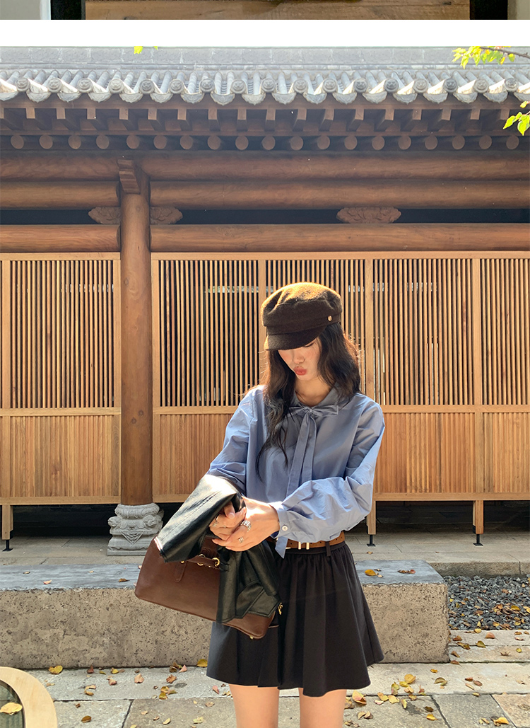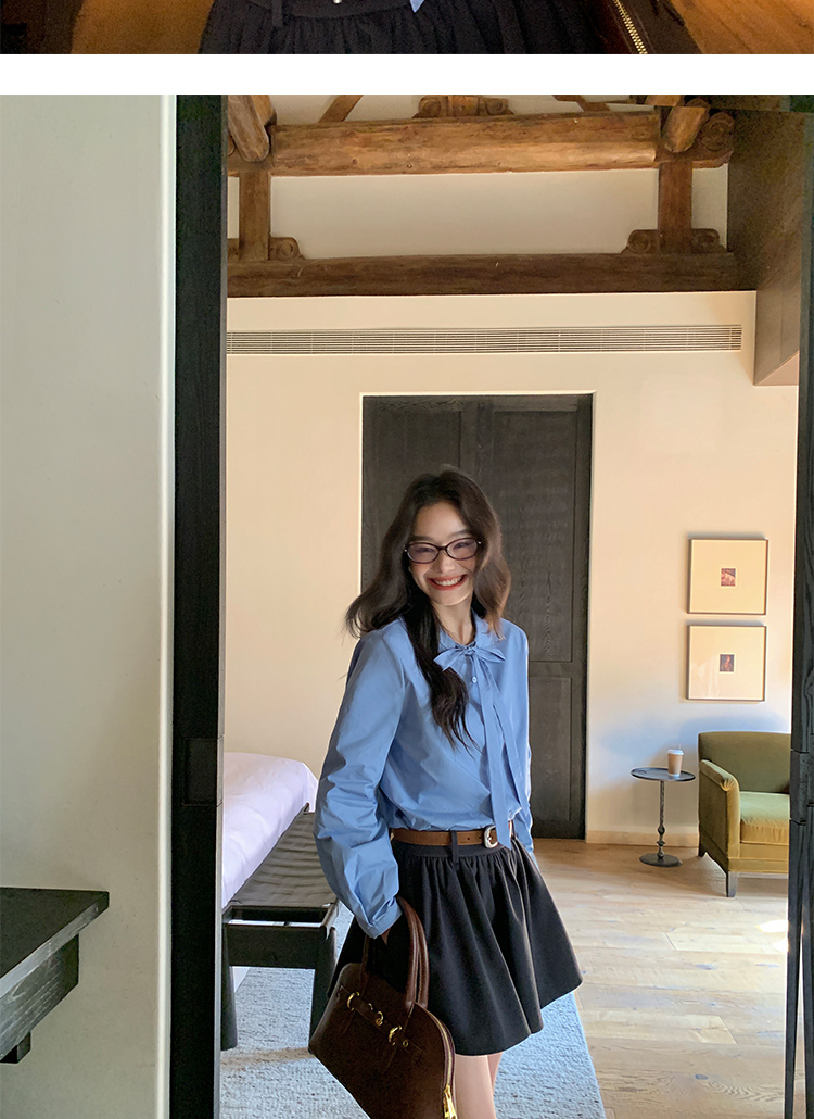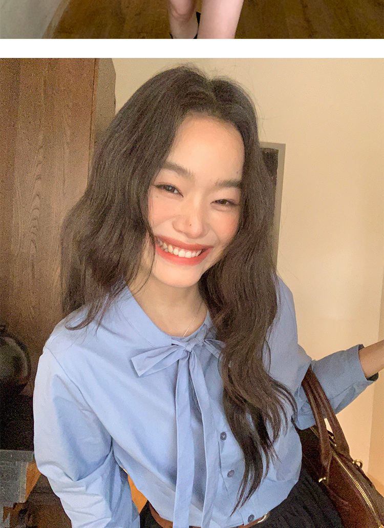 Pusumede Corner Street Blue Bow Tie Striped Shirt Women's Long-Sleeved Shirt Elegant Top