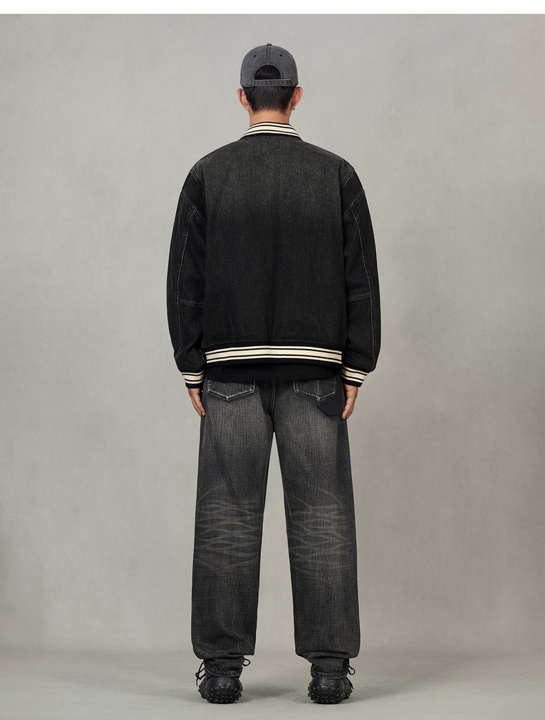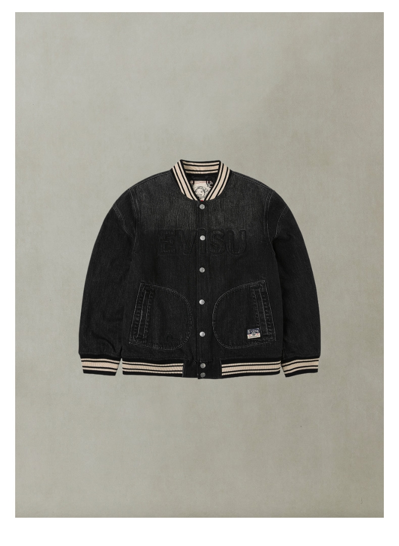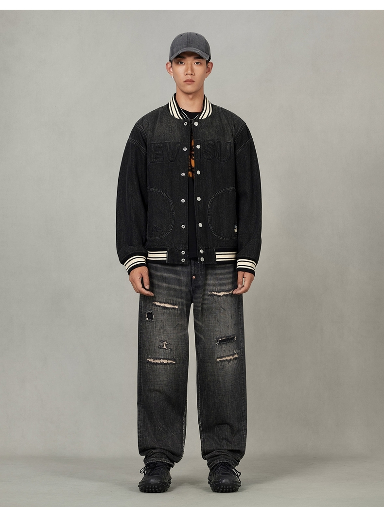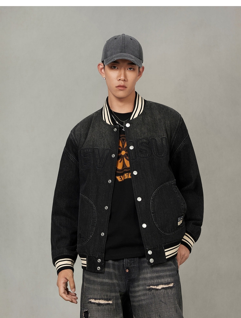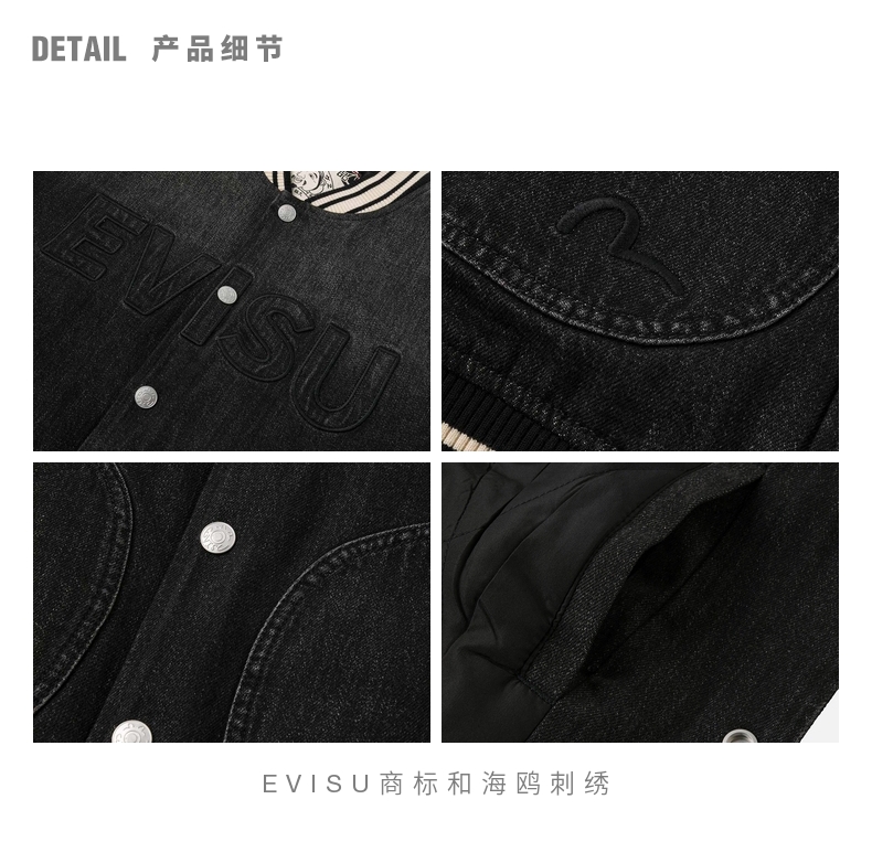 Evisu Fushen 2025 Autumn New Men's Embroidered Logo Baseball Jacket Collarless Casual Commuter Denim Jacket