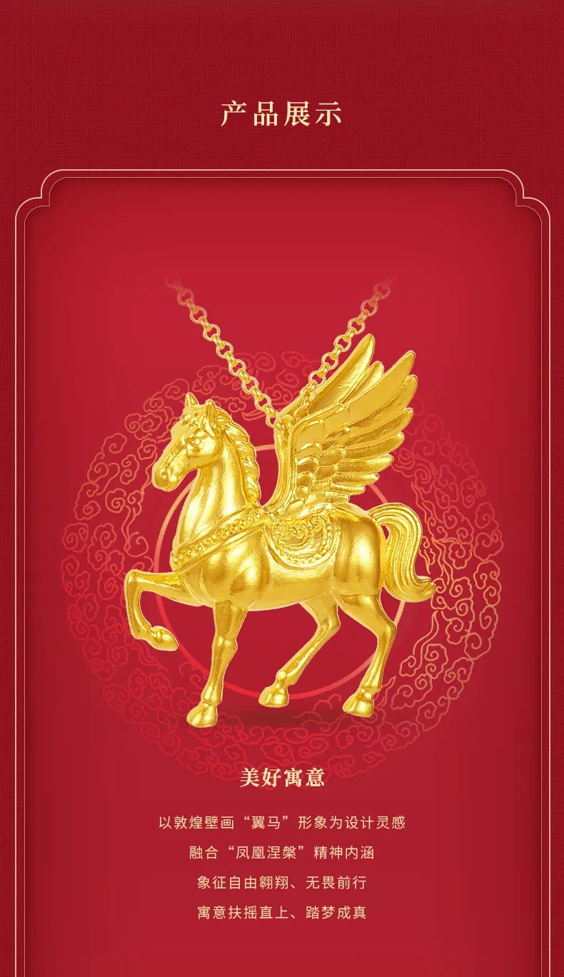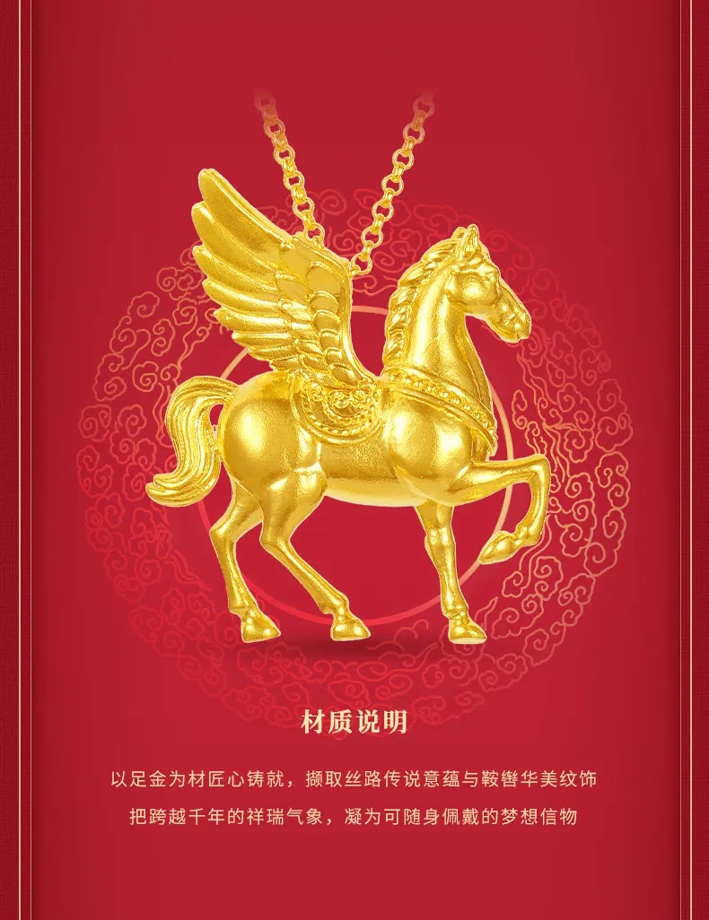 【New Product】Lao Fengxiang Sheng Tang Fenghua Qiji Series Flying Horse Gold Necklace in Pure Gold for Men and Women, Gift