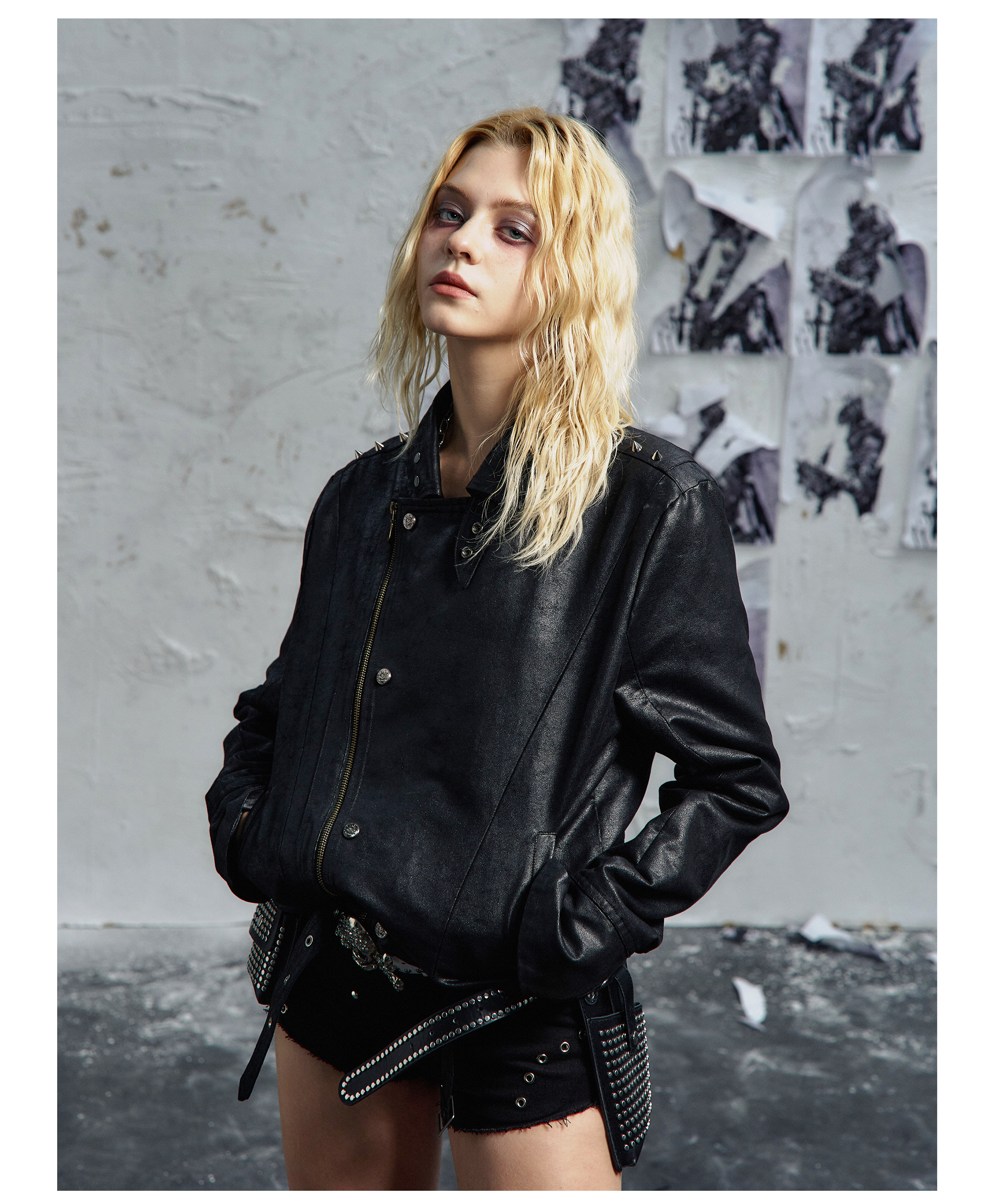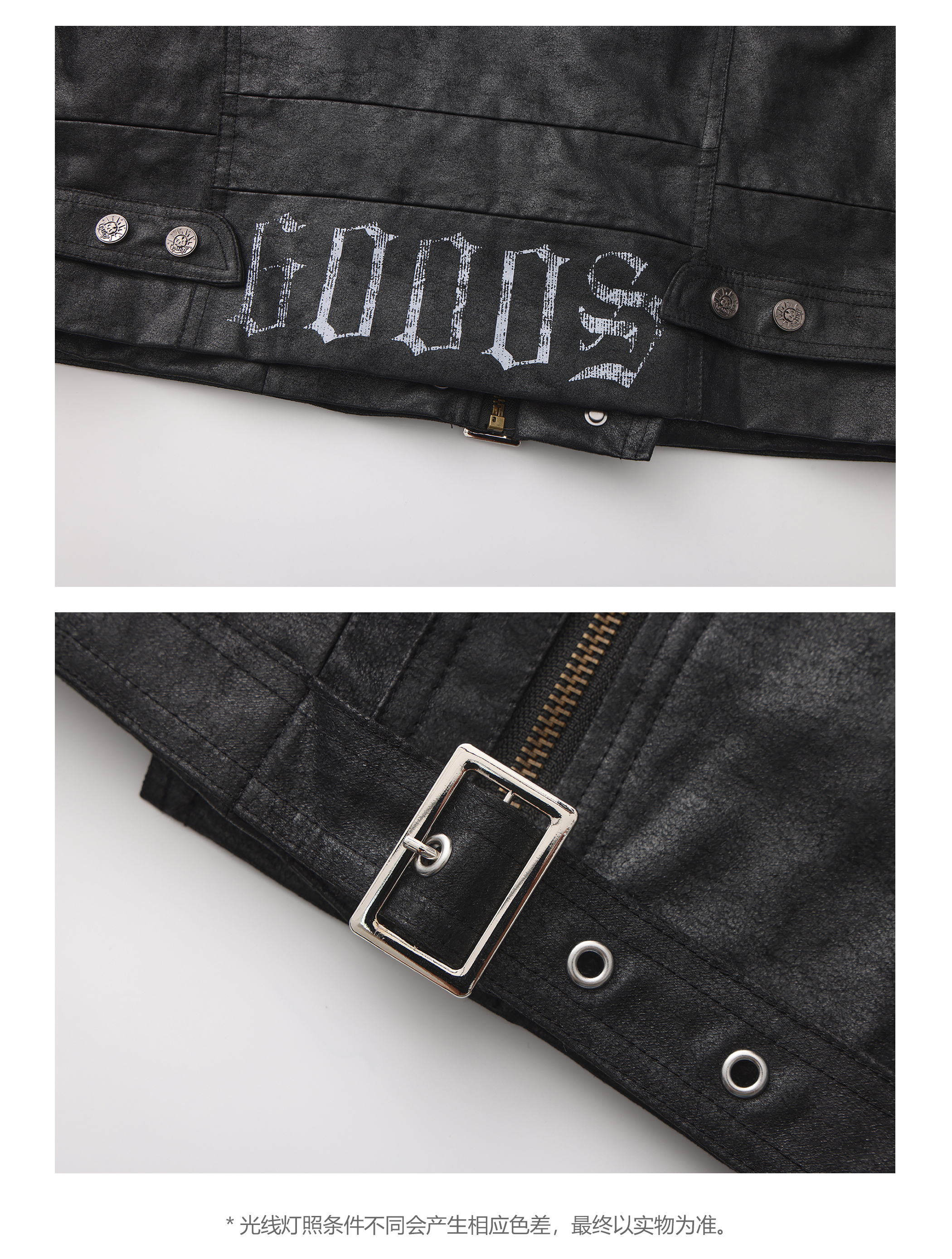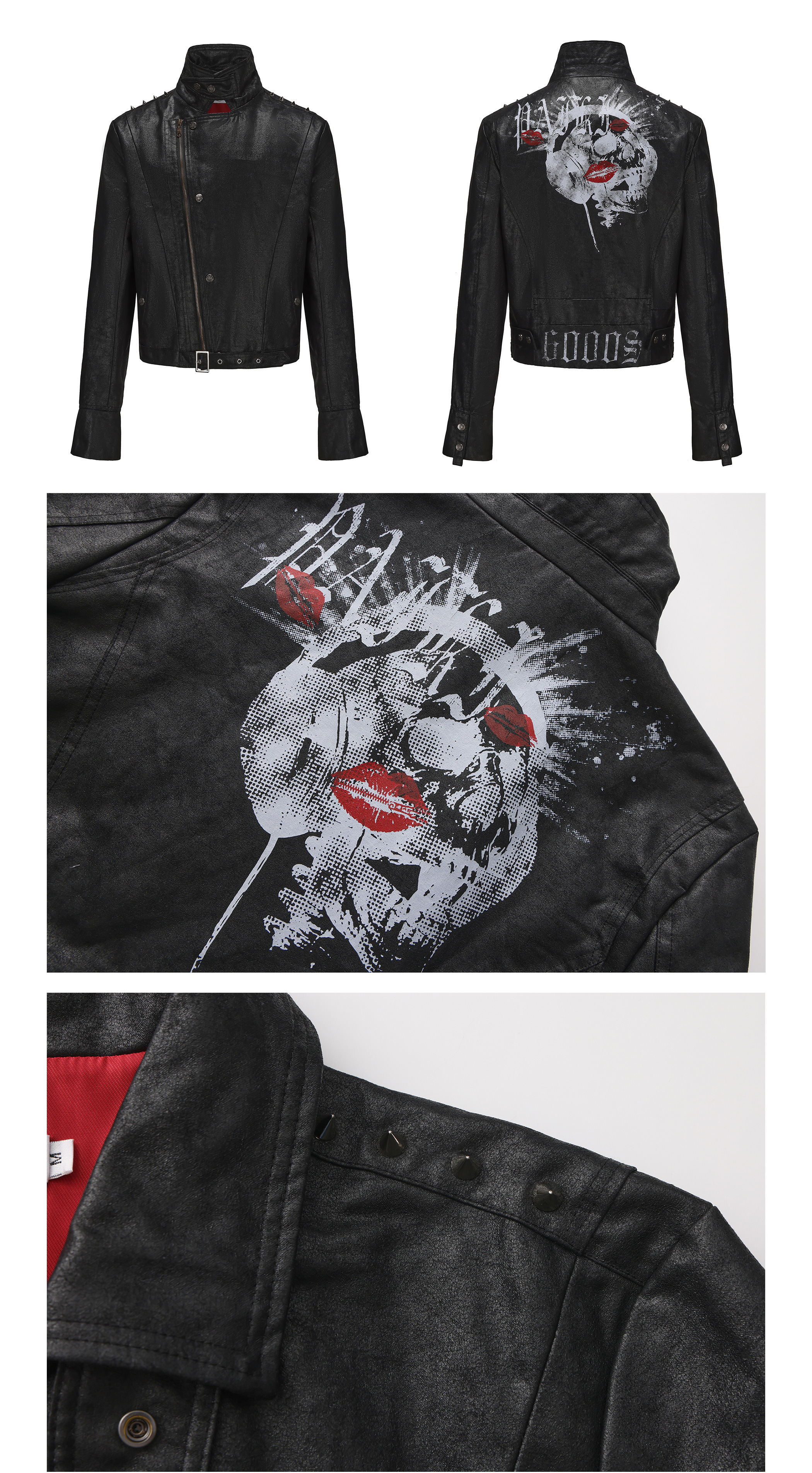 Paiki'Peace Chant' Kiss Mark Skull Headphone Leather Jacket Washed Visual Style Short Wide Autumn Winter Coat