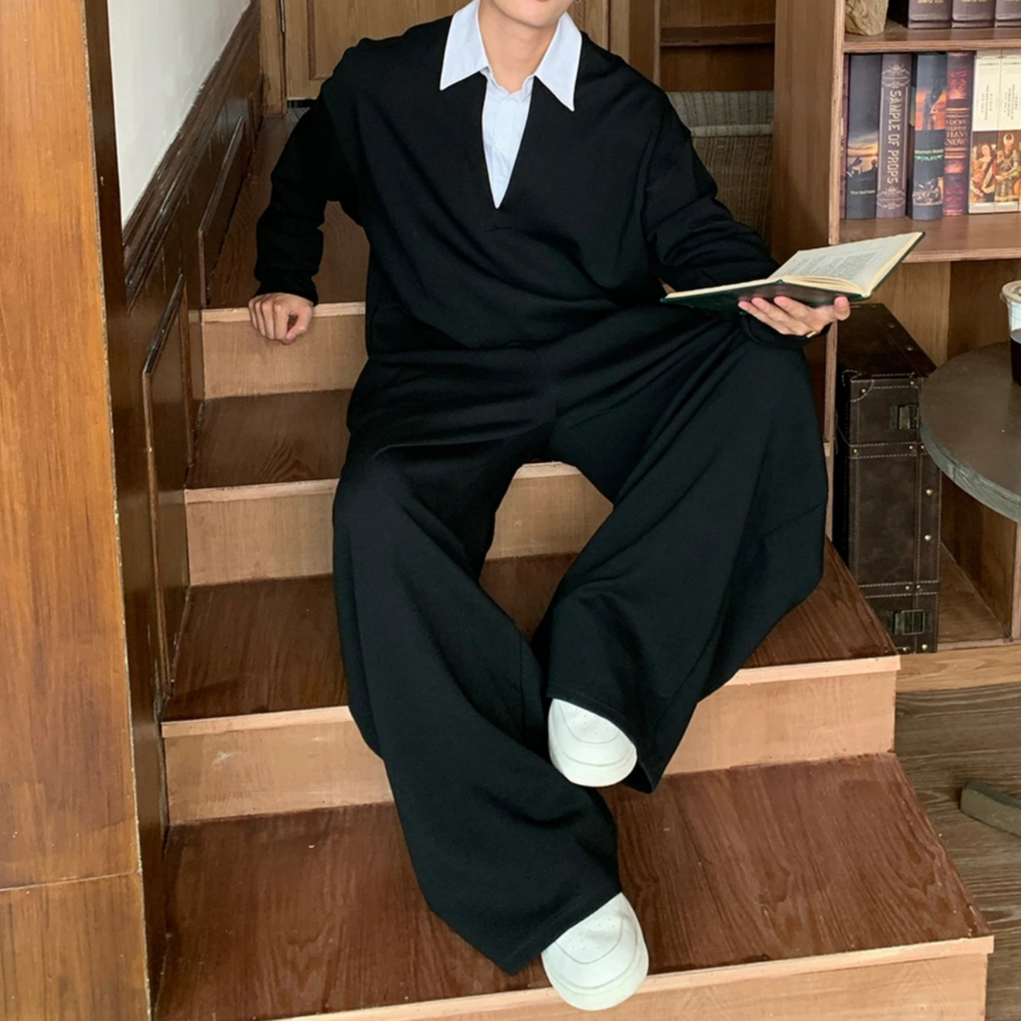 Autumn American-Style Trendy Brand High-End Fake Two-Piece Striped Collar Sweatshirt Men's Fashion Casual Long Pants Set