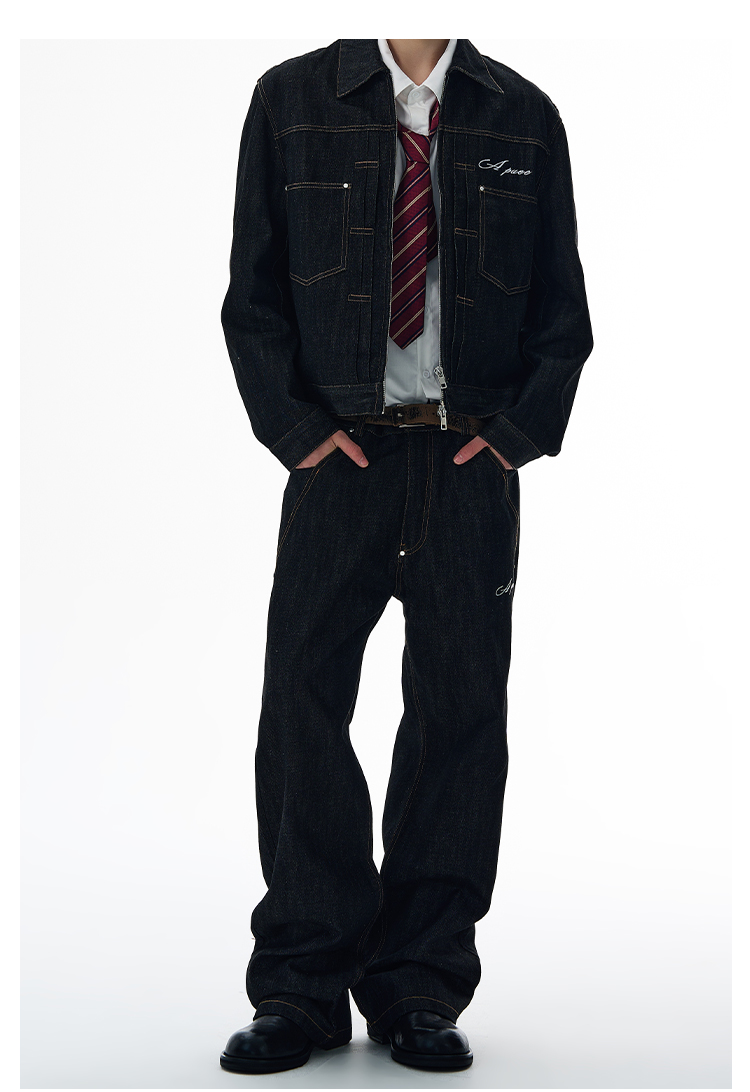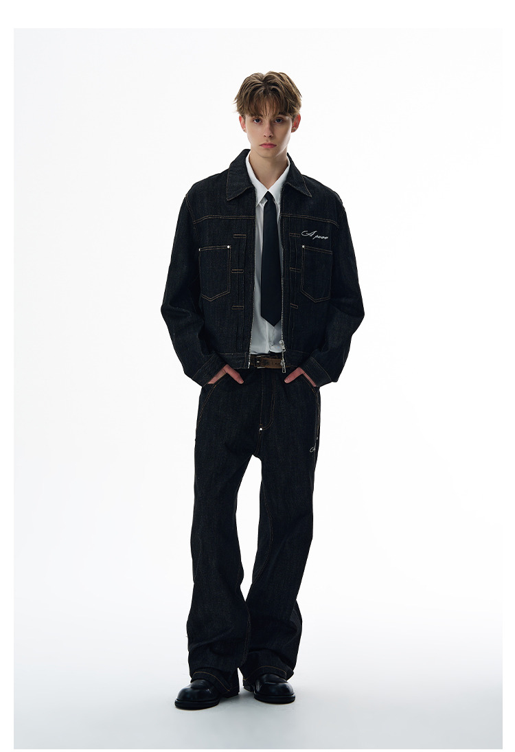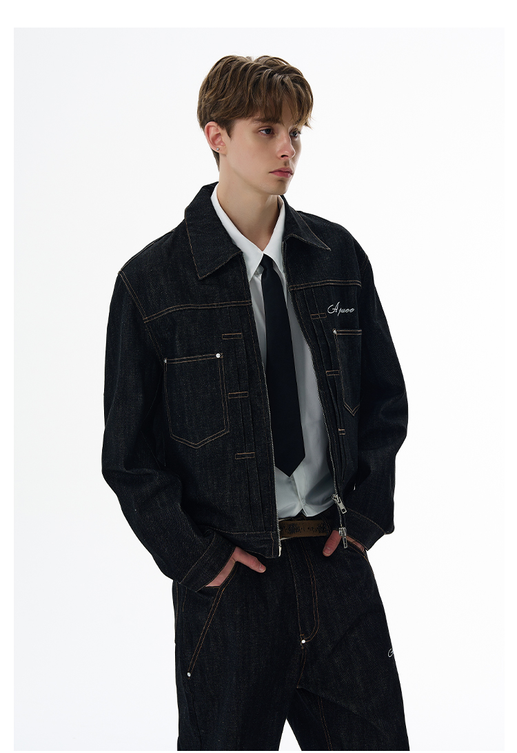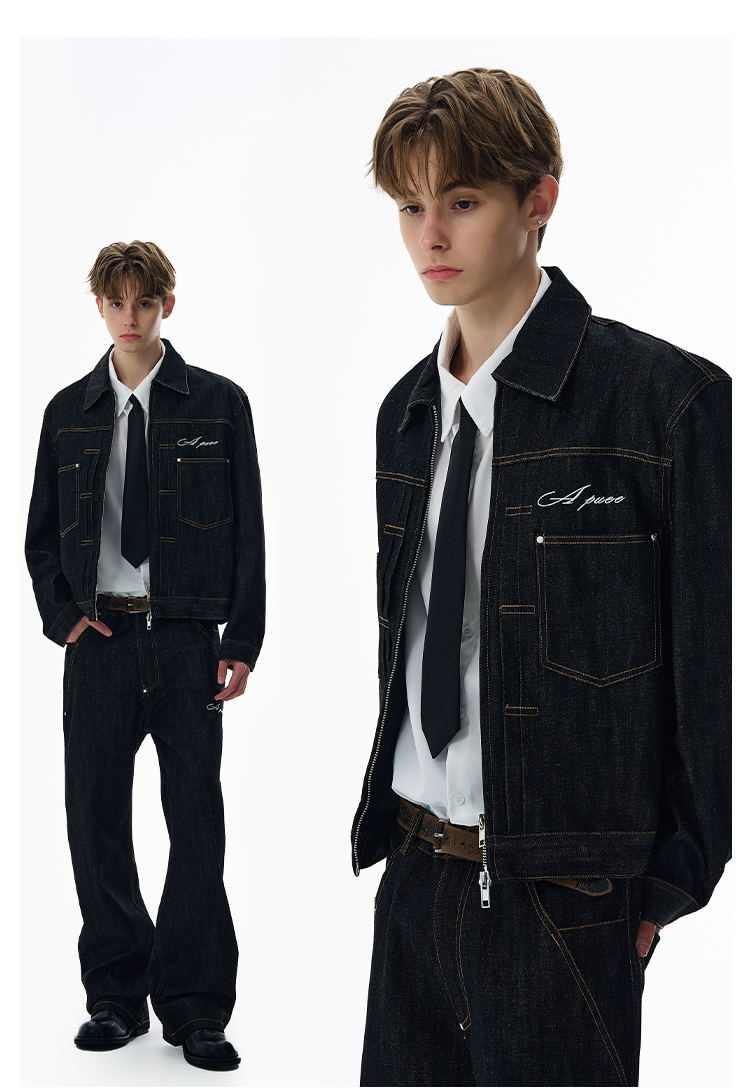 A Puee American Retro Silhouette Denim Original Color Jacket Set Cleanfit Cool Loose Coat Trendy