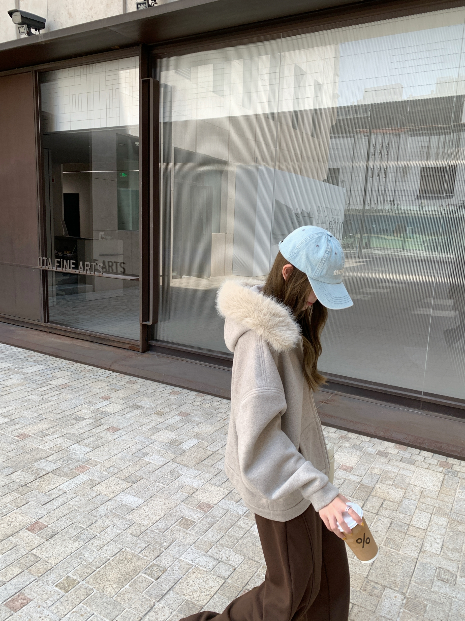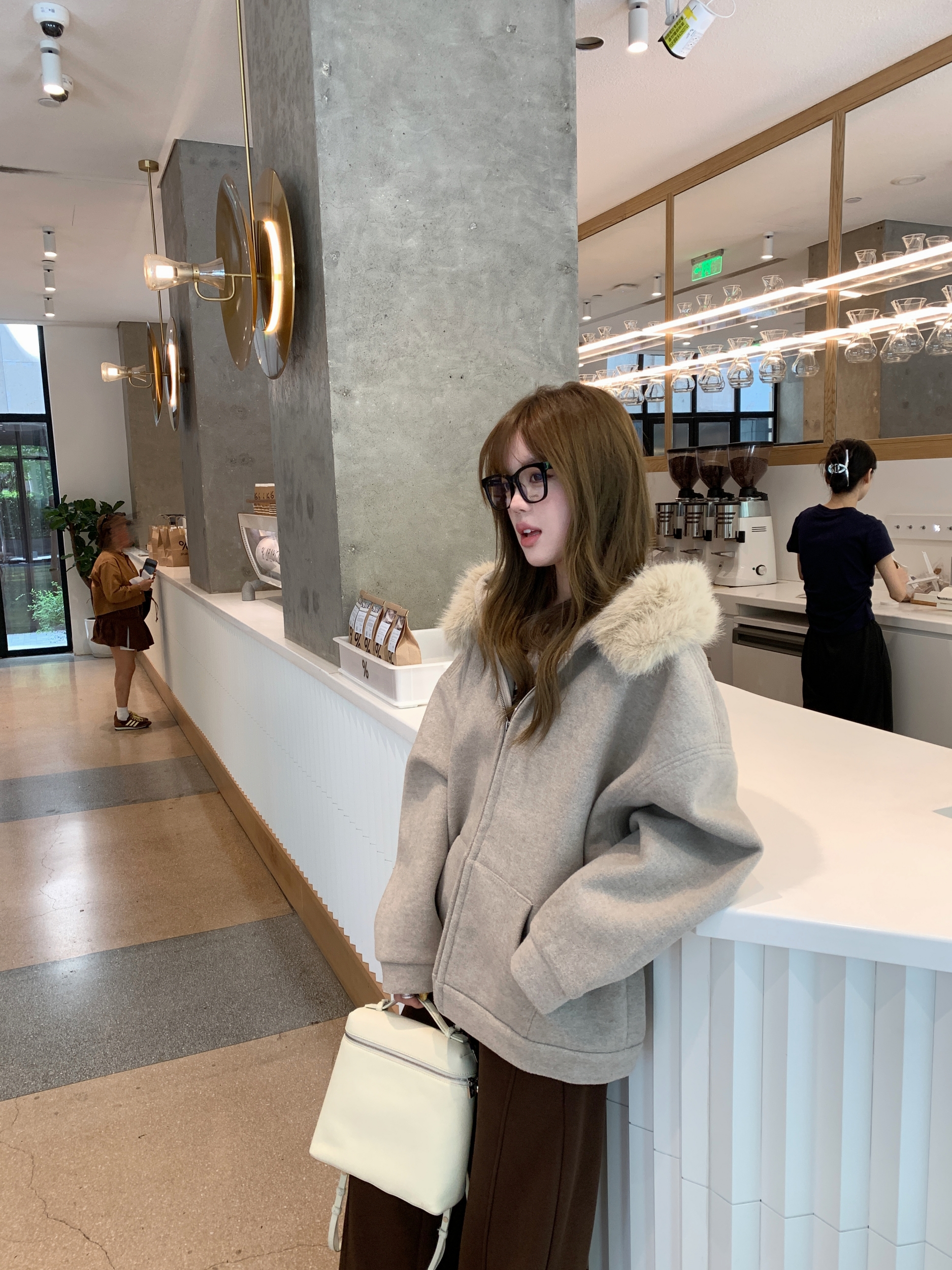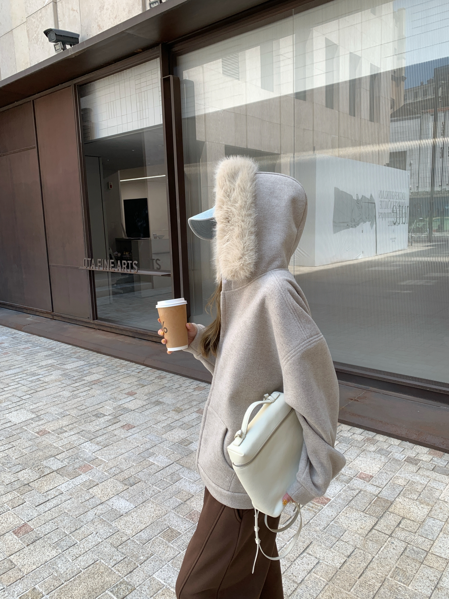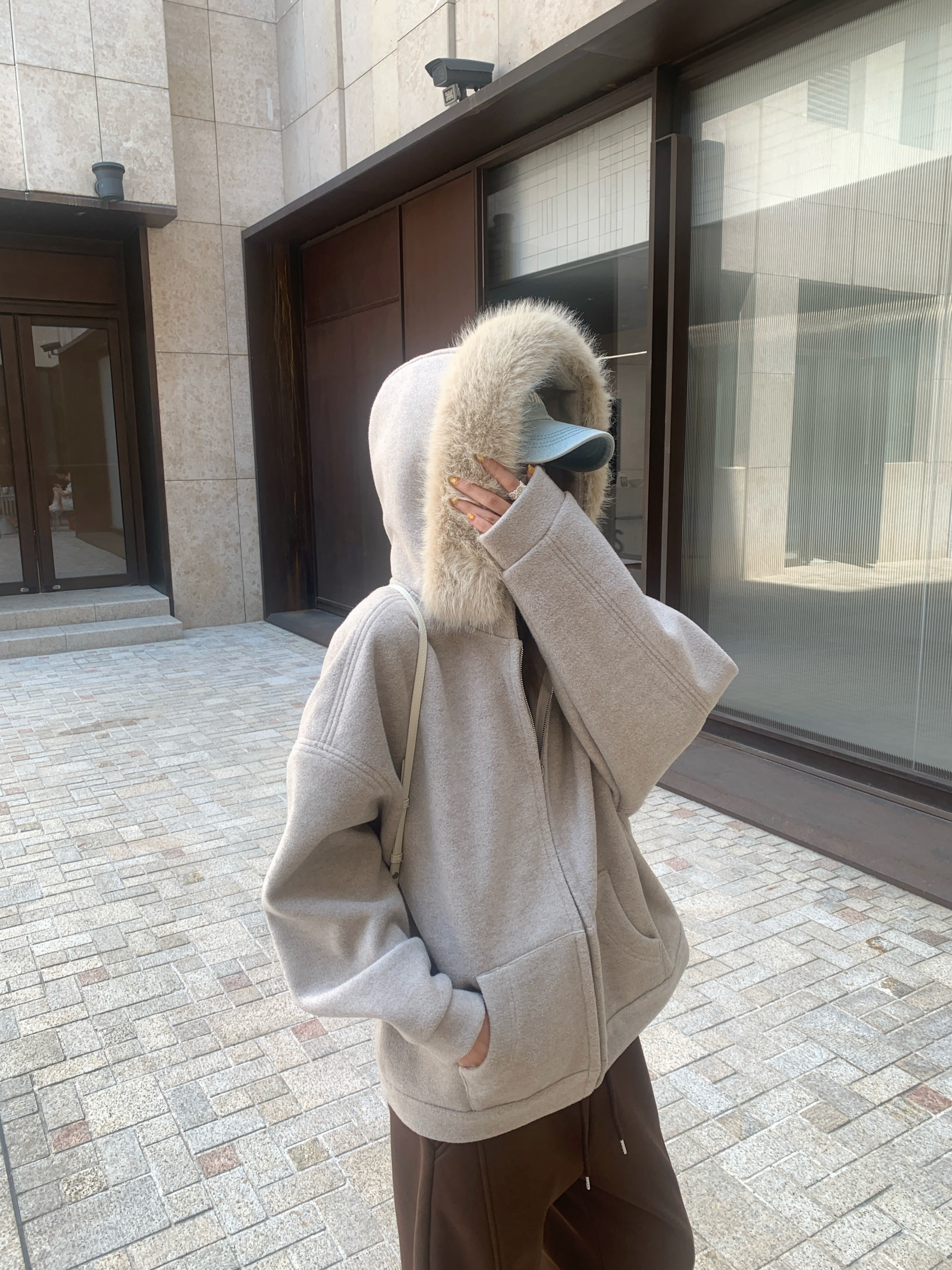Suniriror Oatmeal Color Hooded Detachable Fur Collar Double-Sided Woolen Jacket Women's Autumn and Winter Casual Sweatshirt Cardigan