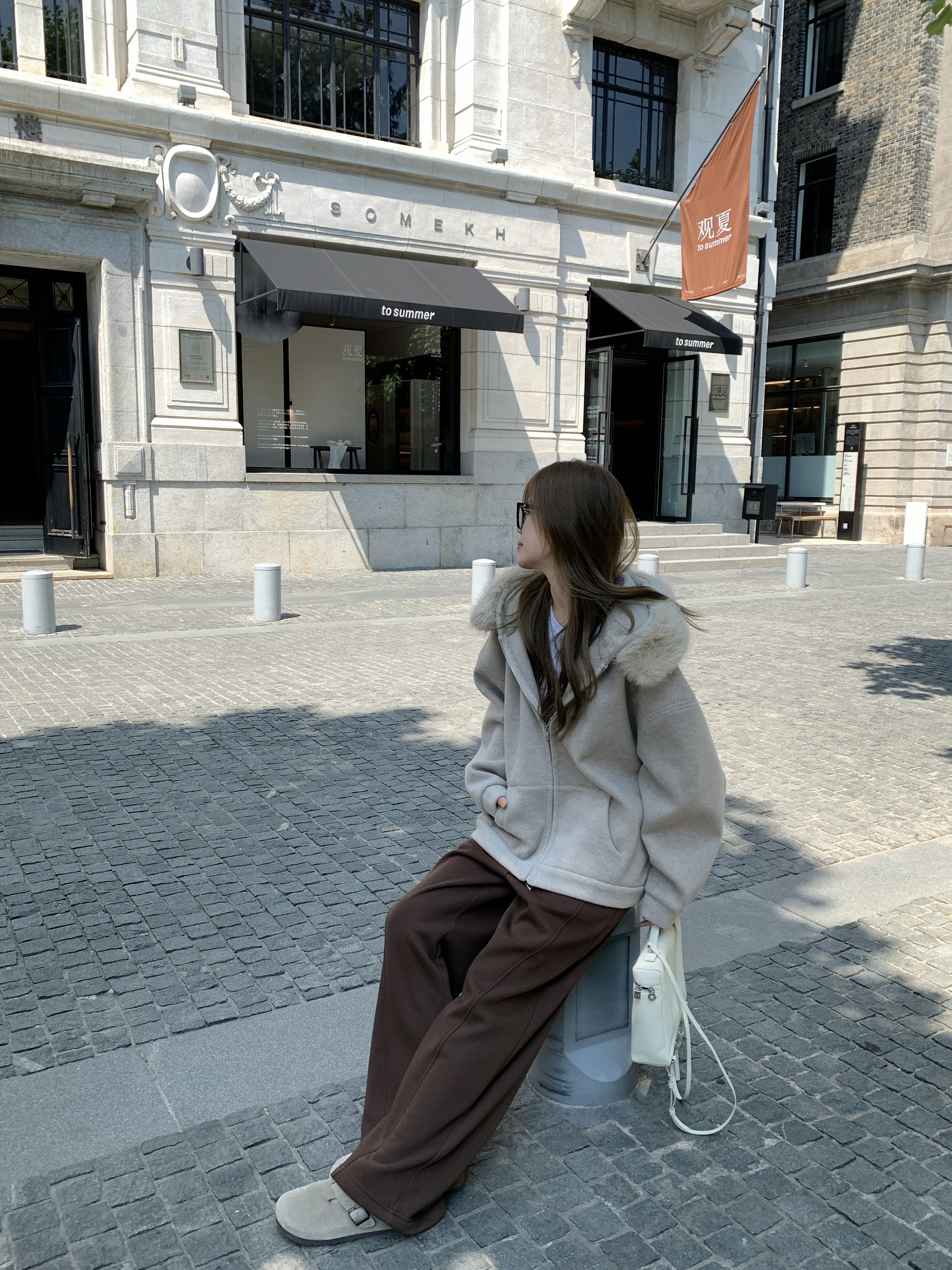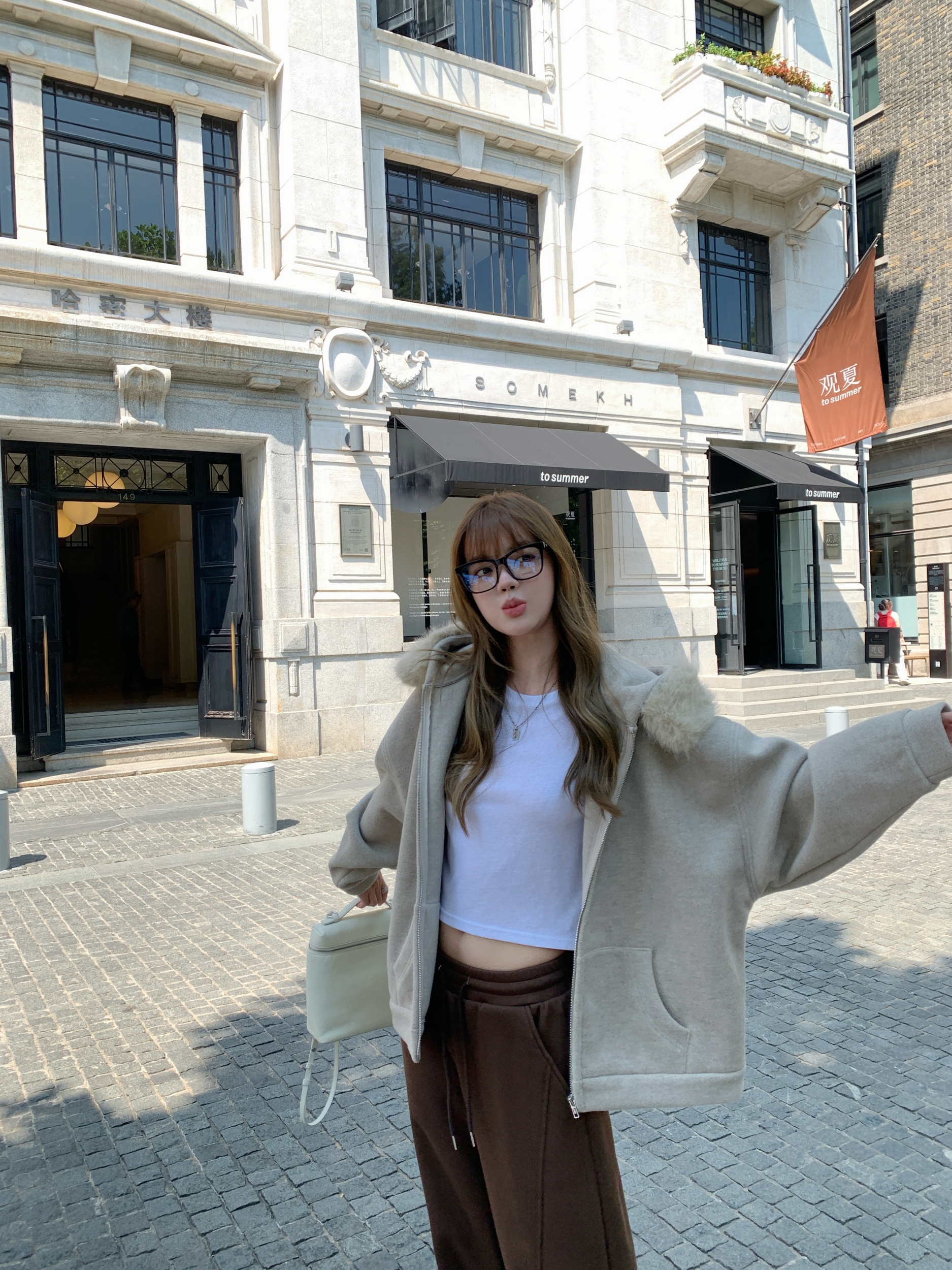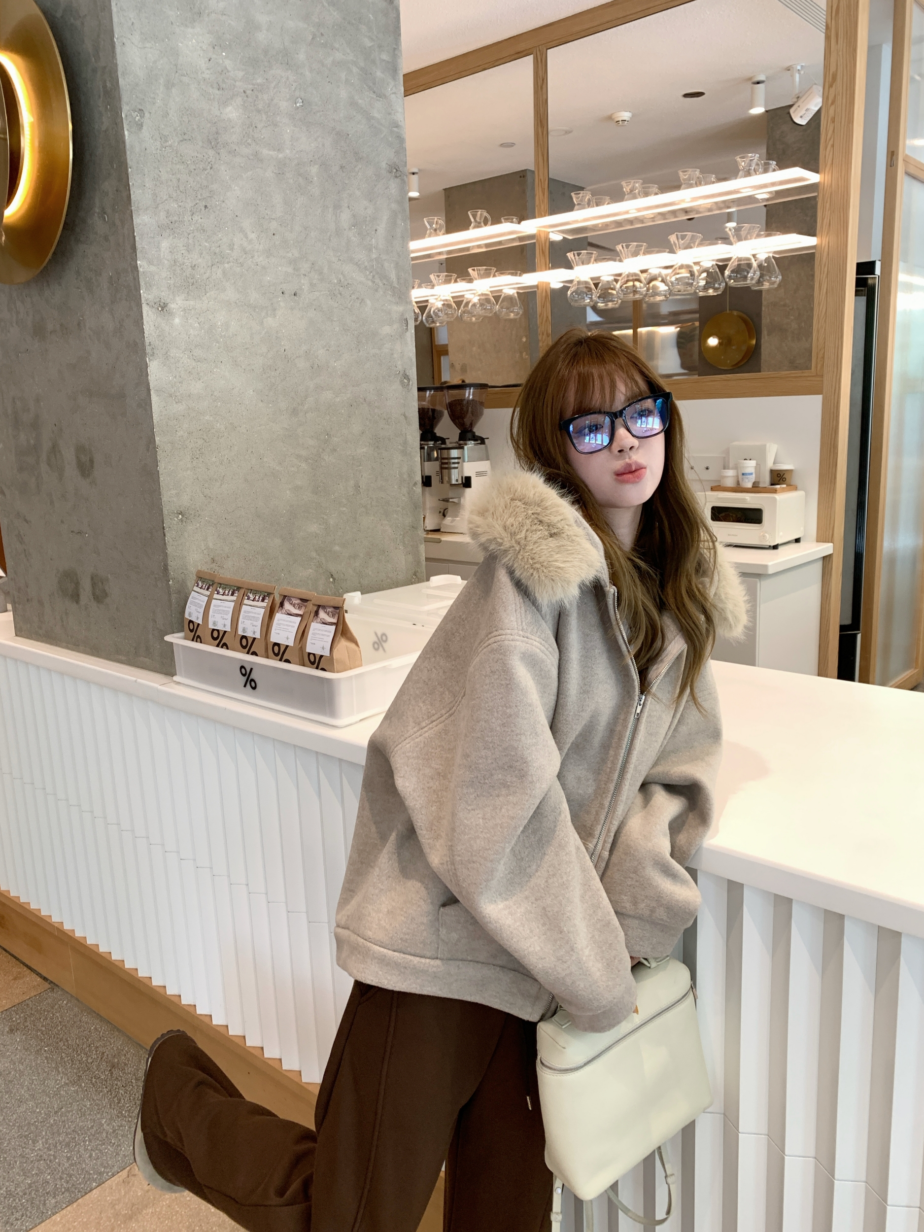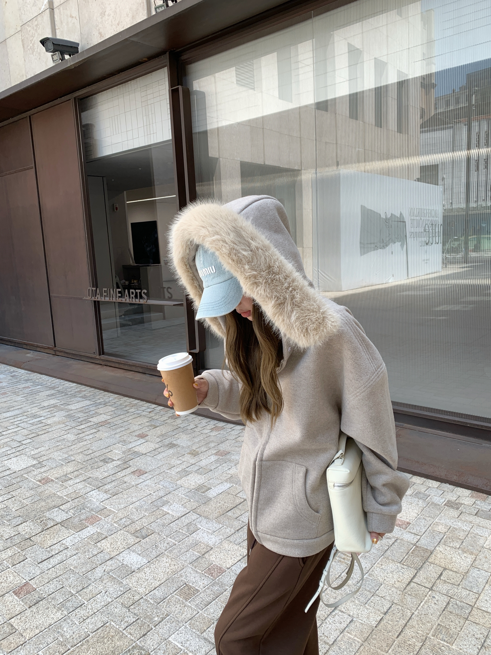 Suniriror Oatmeal Color Hooded Detachable Fur Collar Double-Sided Woolen Jacket Women's Autumn and Winter Casual Sweatshirt Cardigan