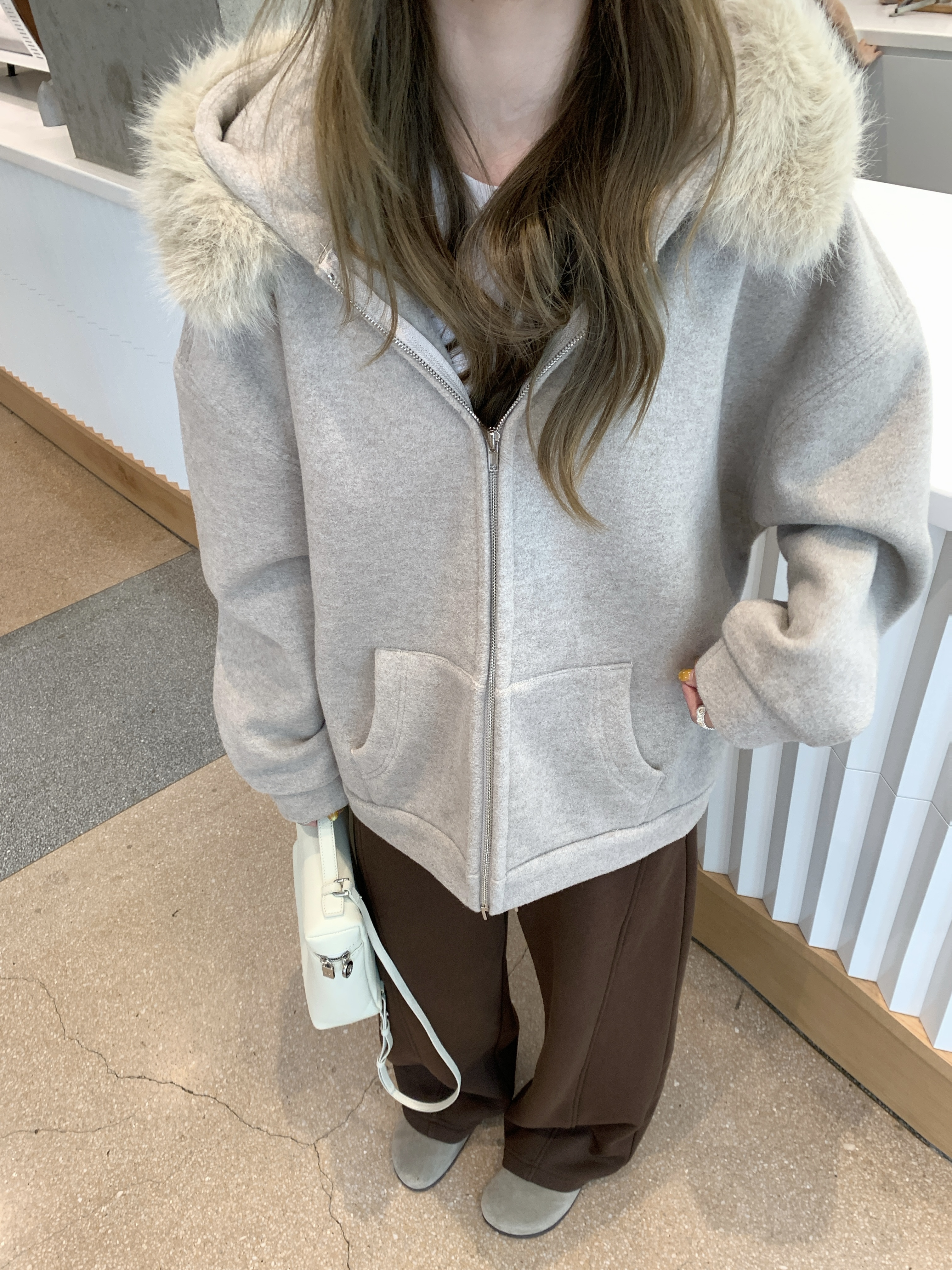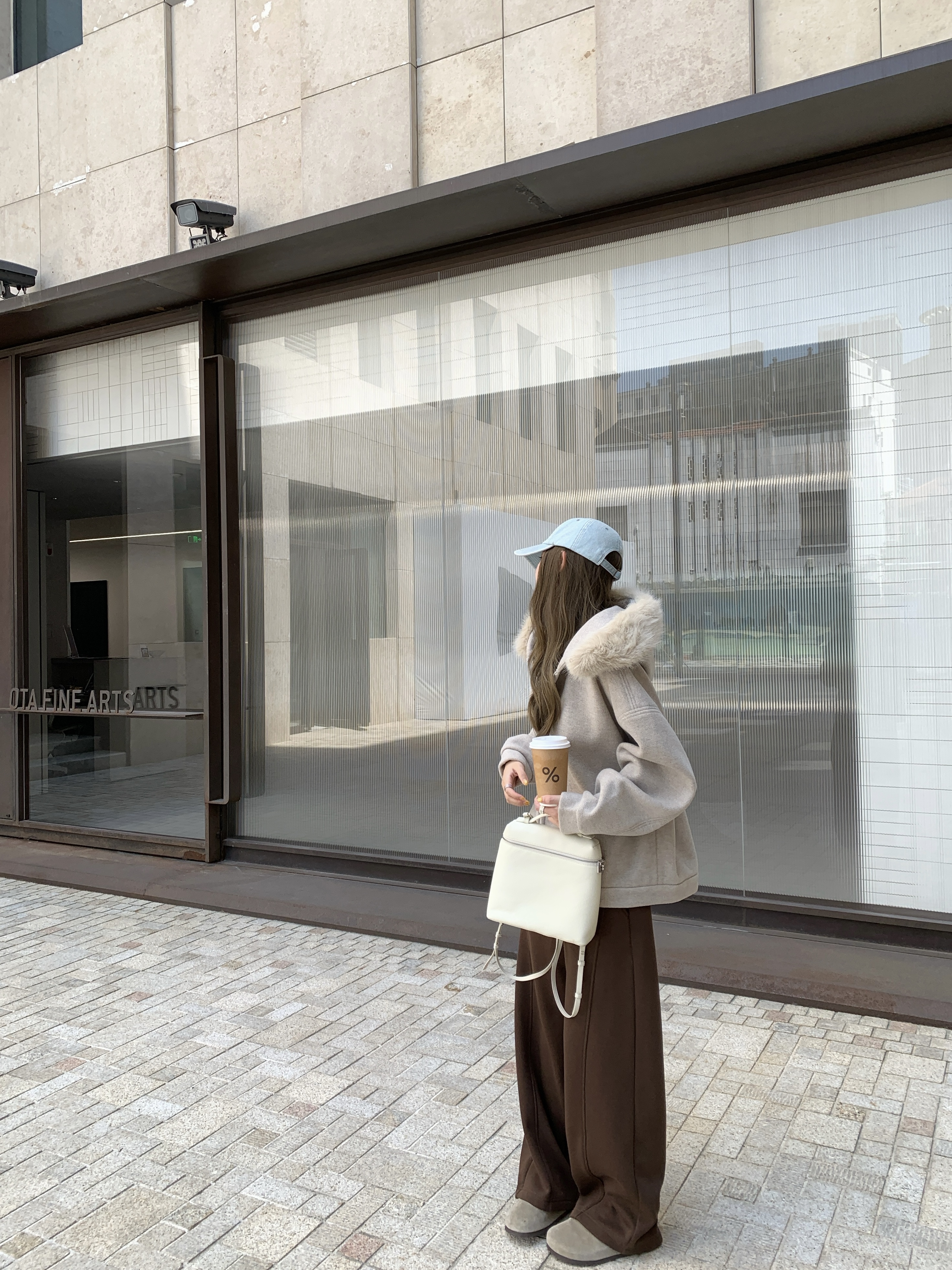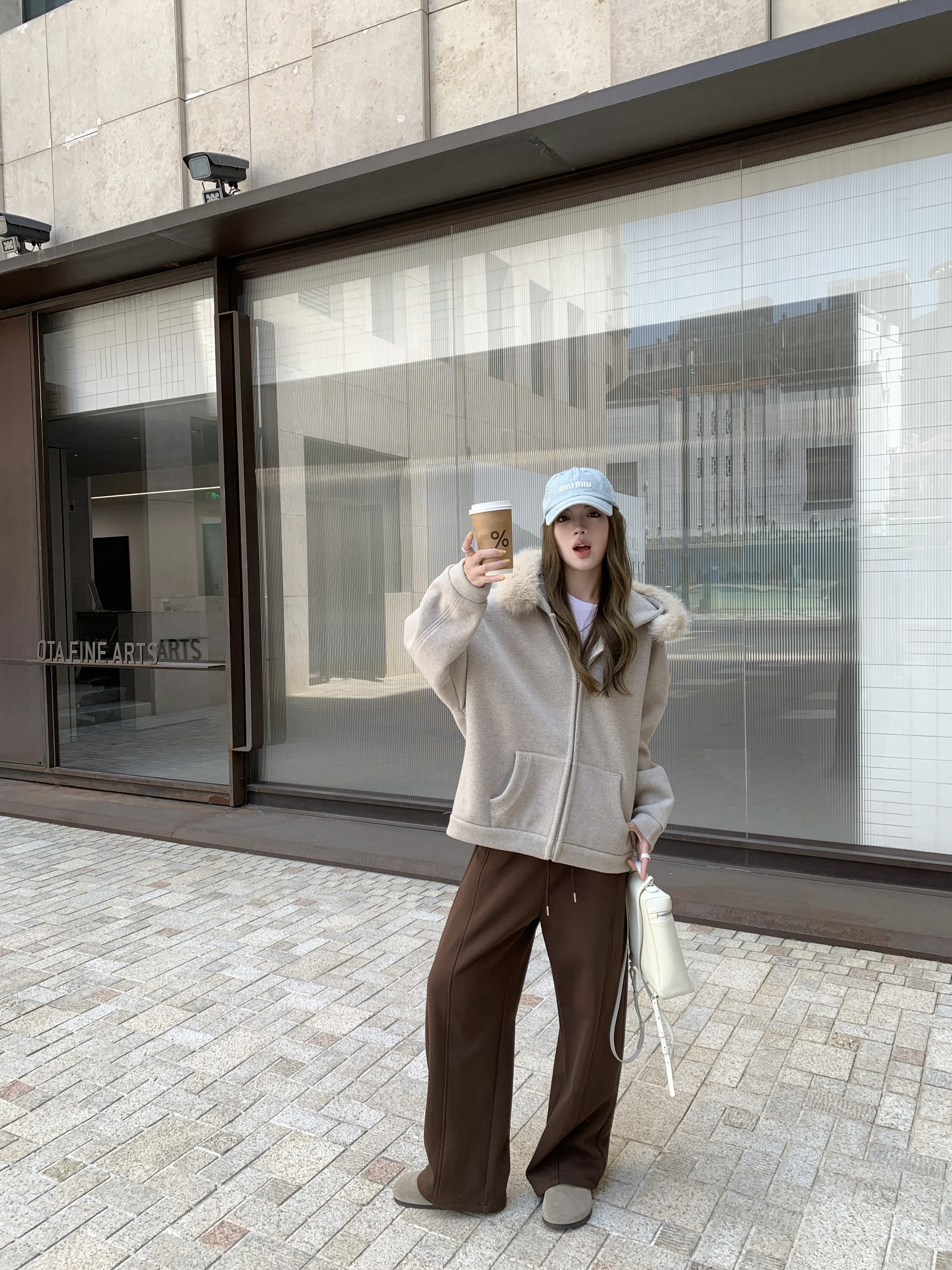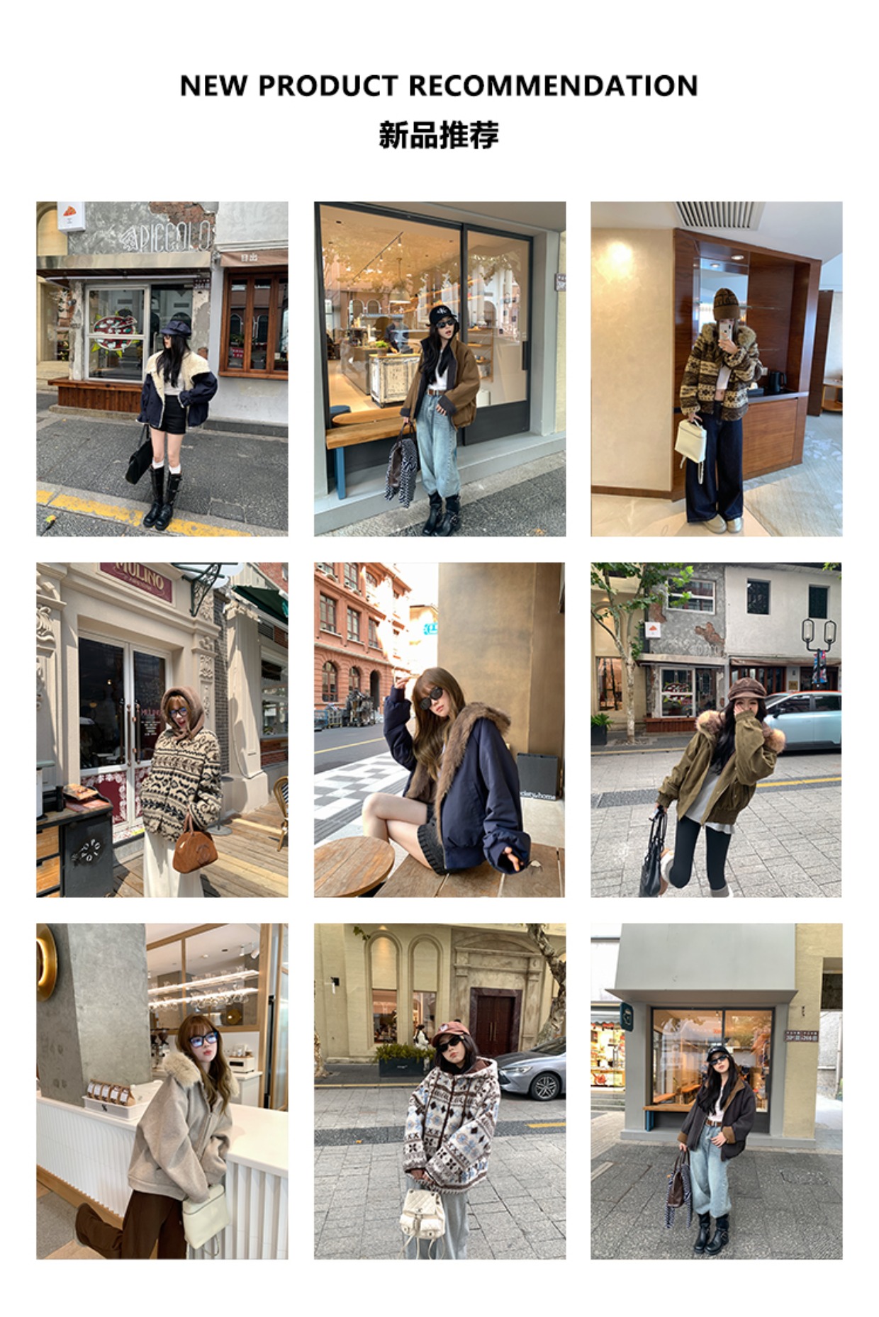 Suniriror Oatmeal Color Hooded Detachable Fur Collar Double-Sided Woolen Jacket Women's Autumn and Winter Casual Sweatshirt Cardigan
