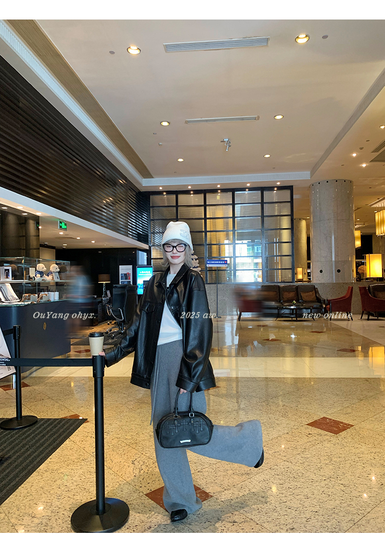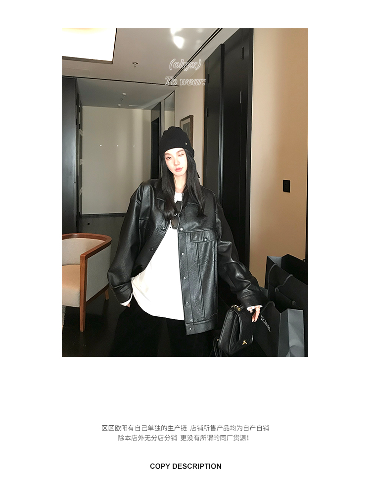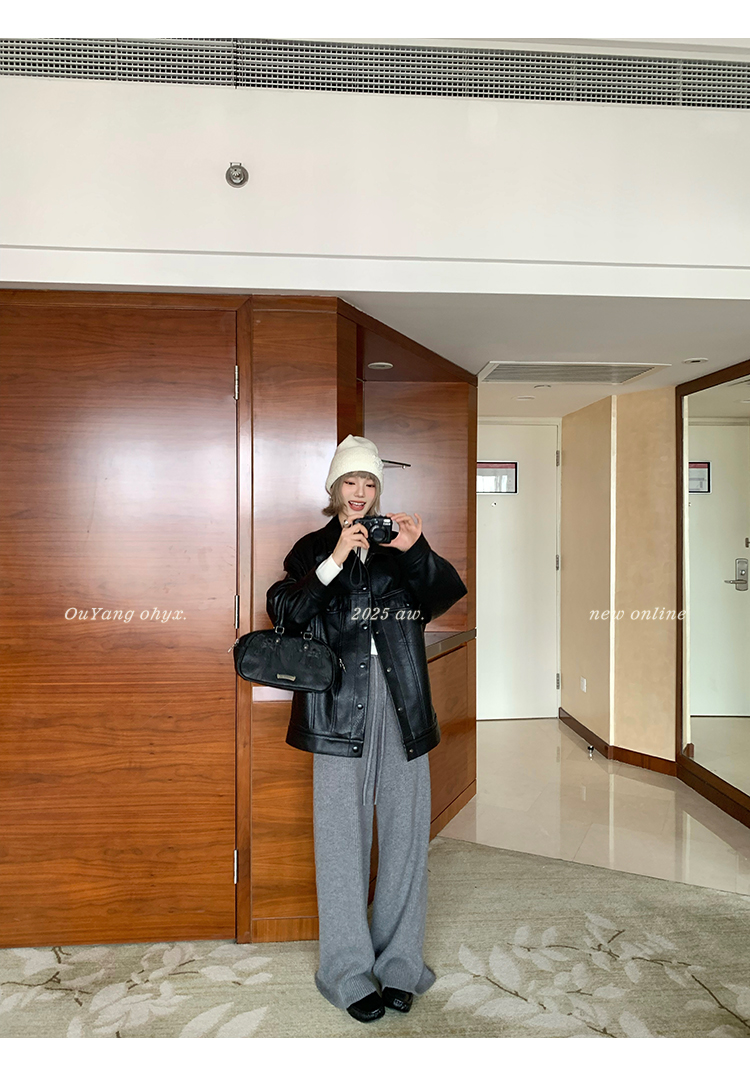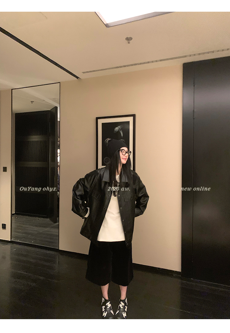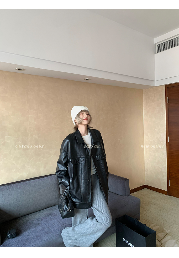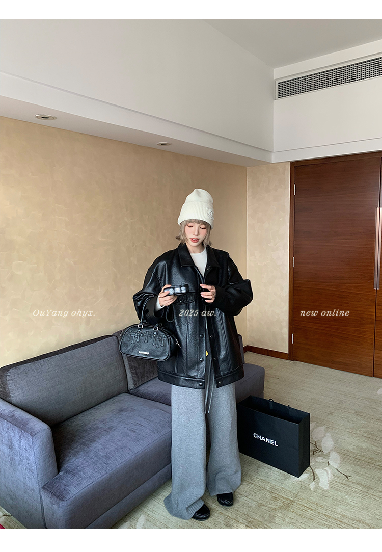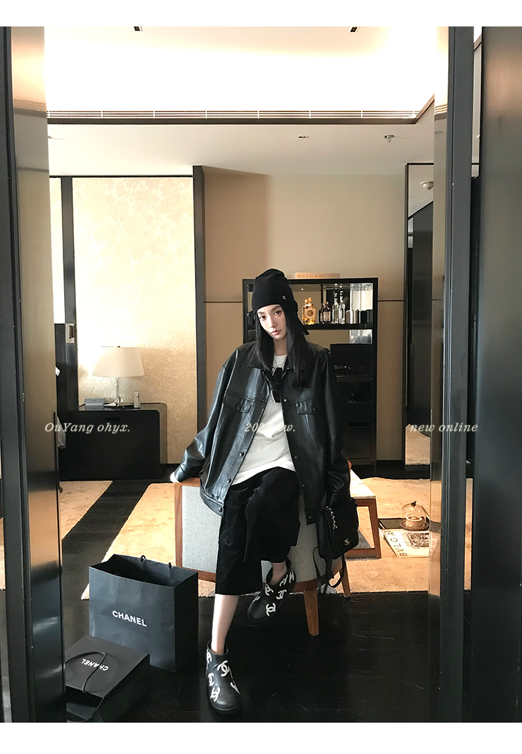 袖口、下摆、前片不规则锯齿状皮条拼接