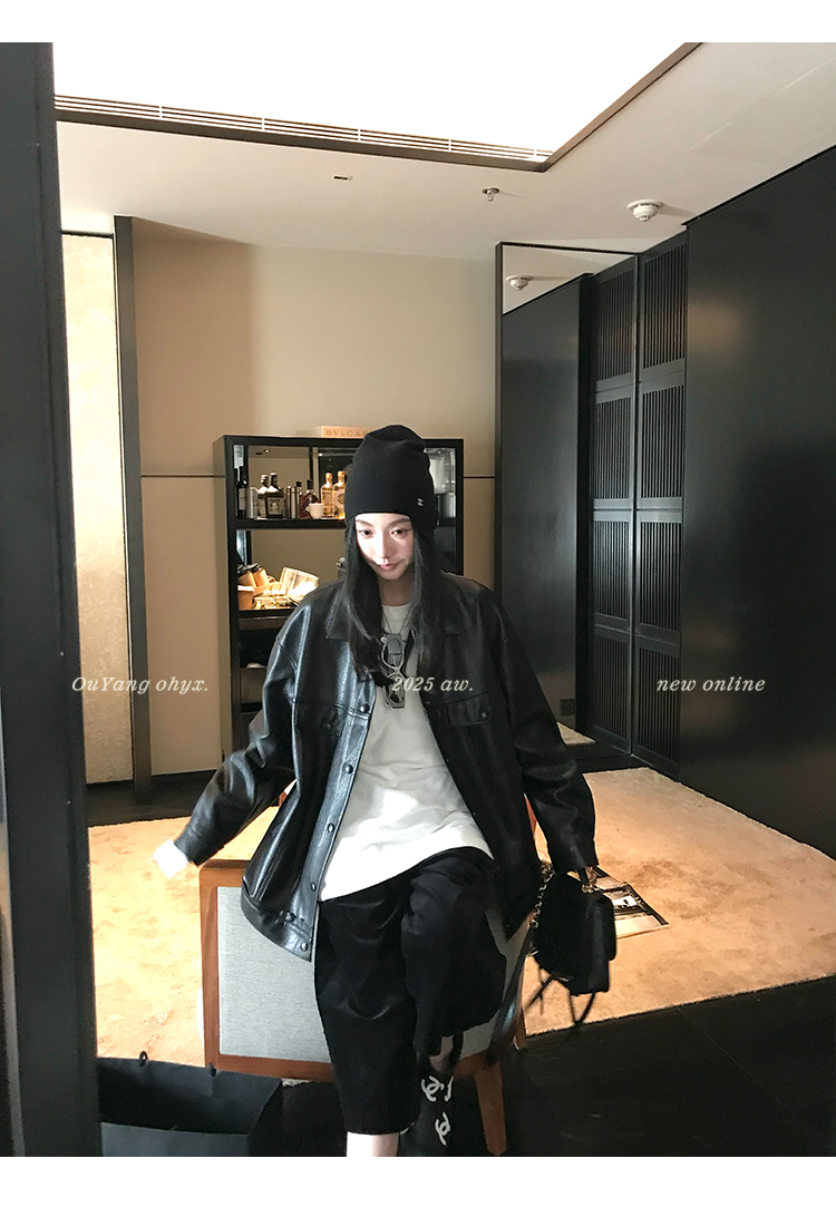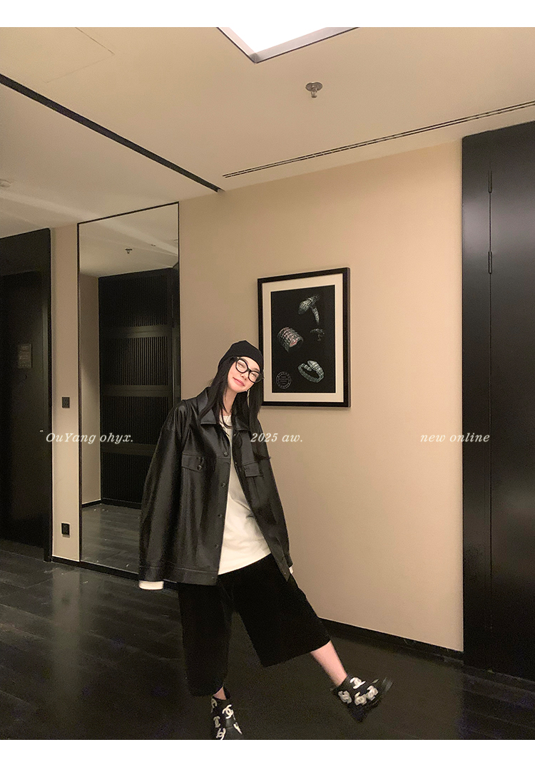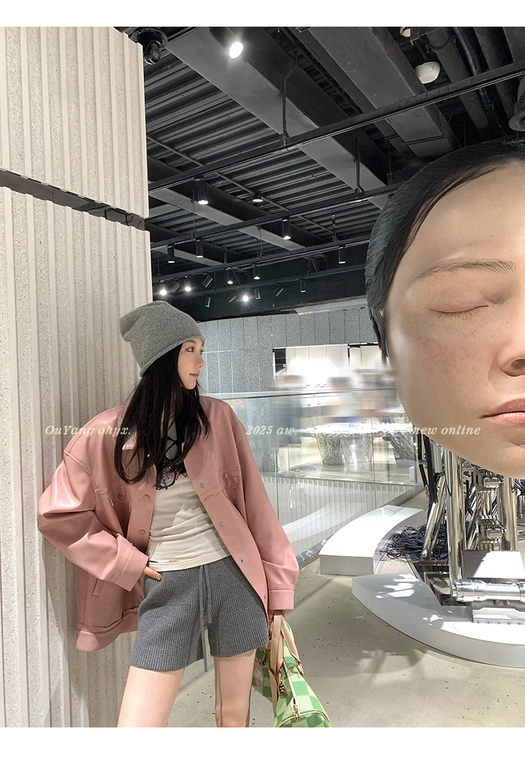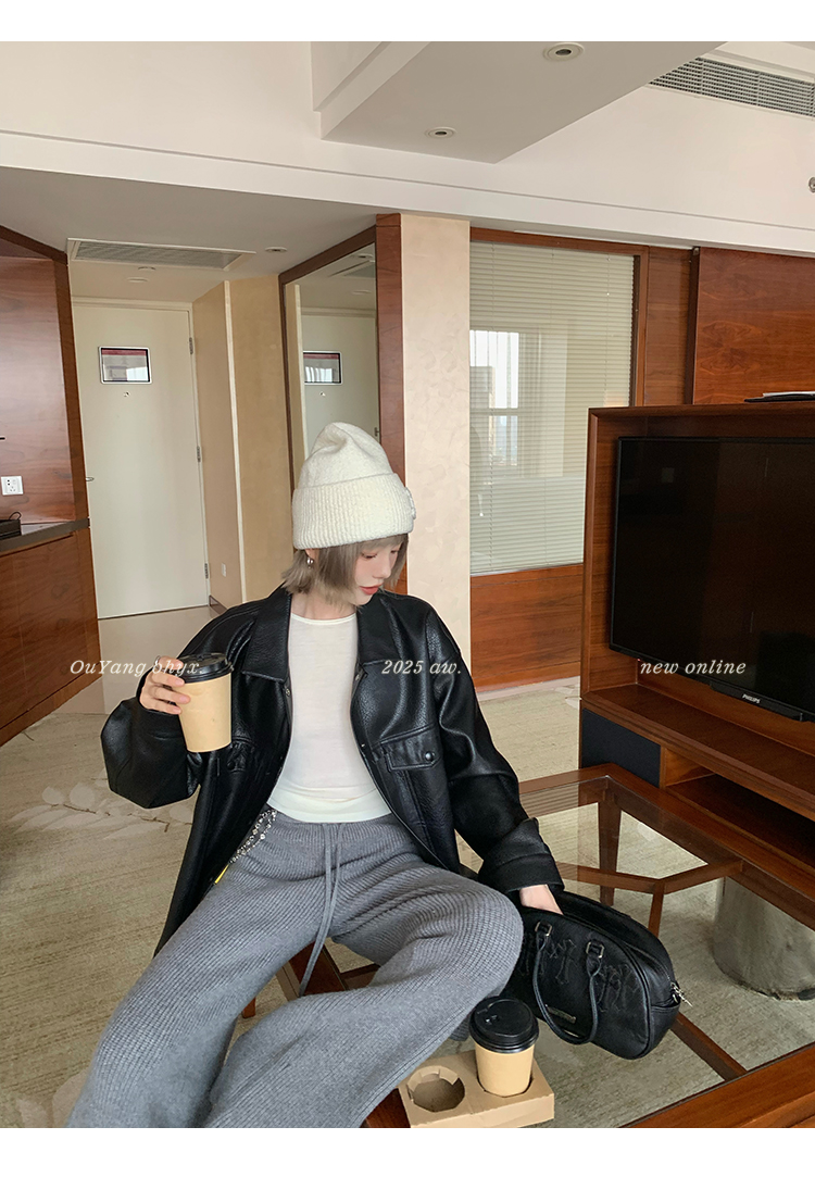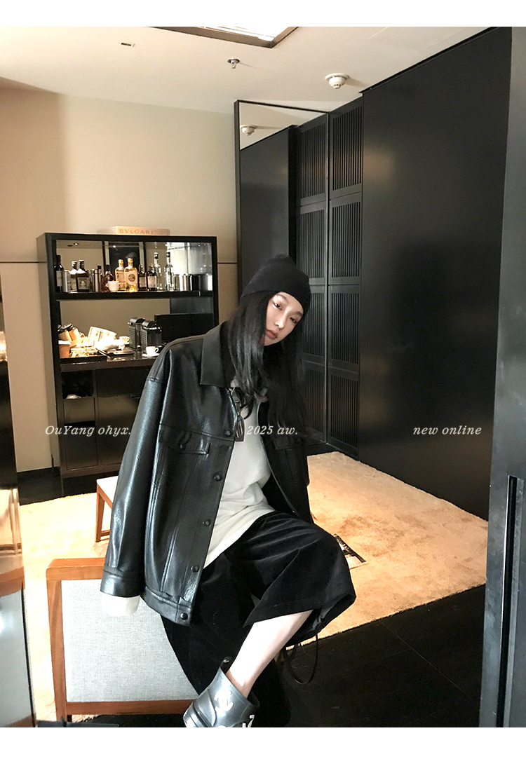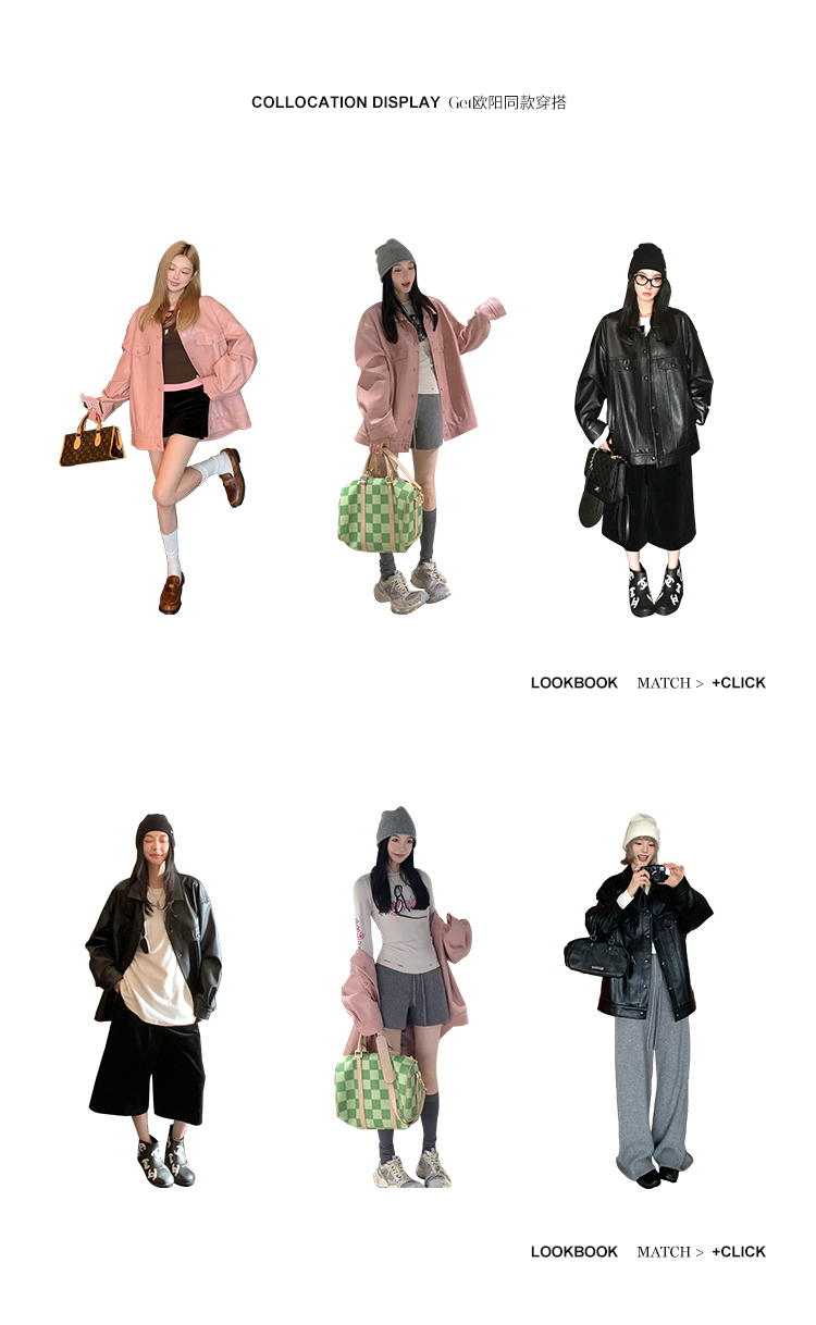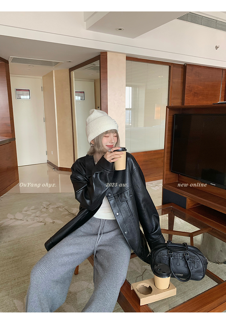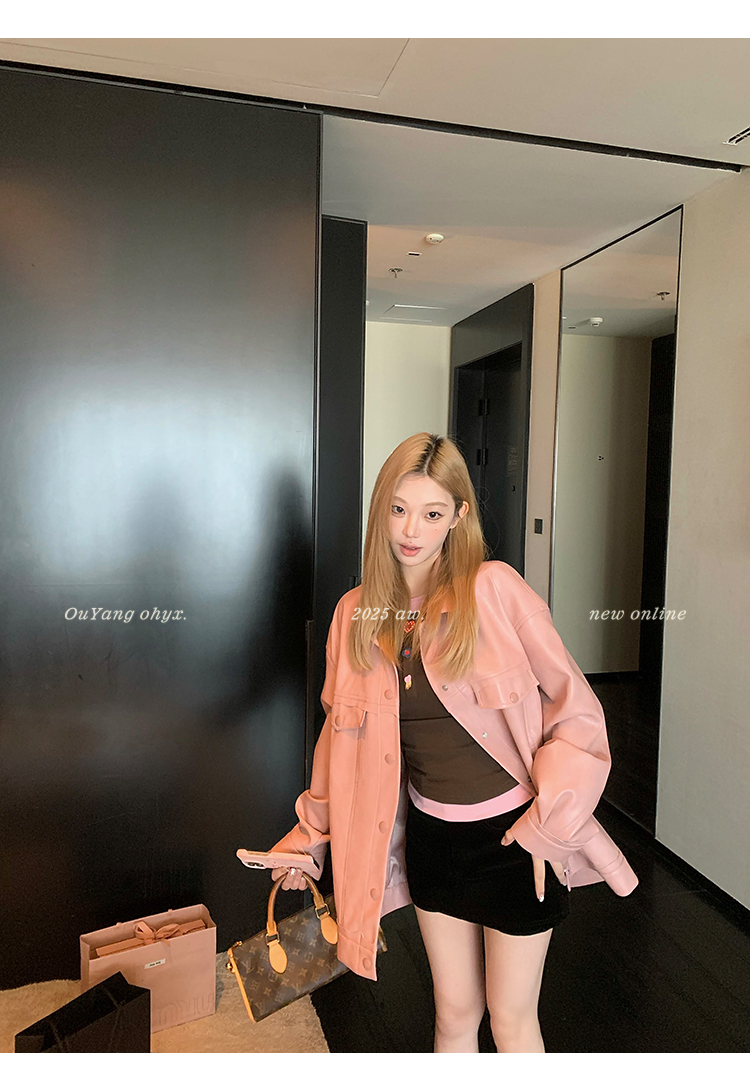 袖口、下摆、前片不规则锯齿状皮条拼接