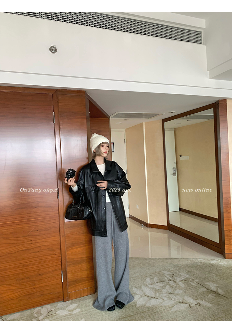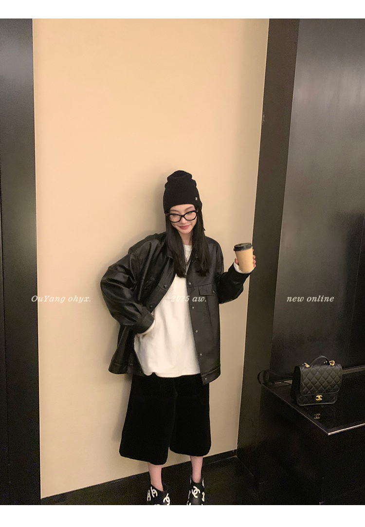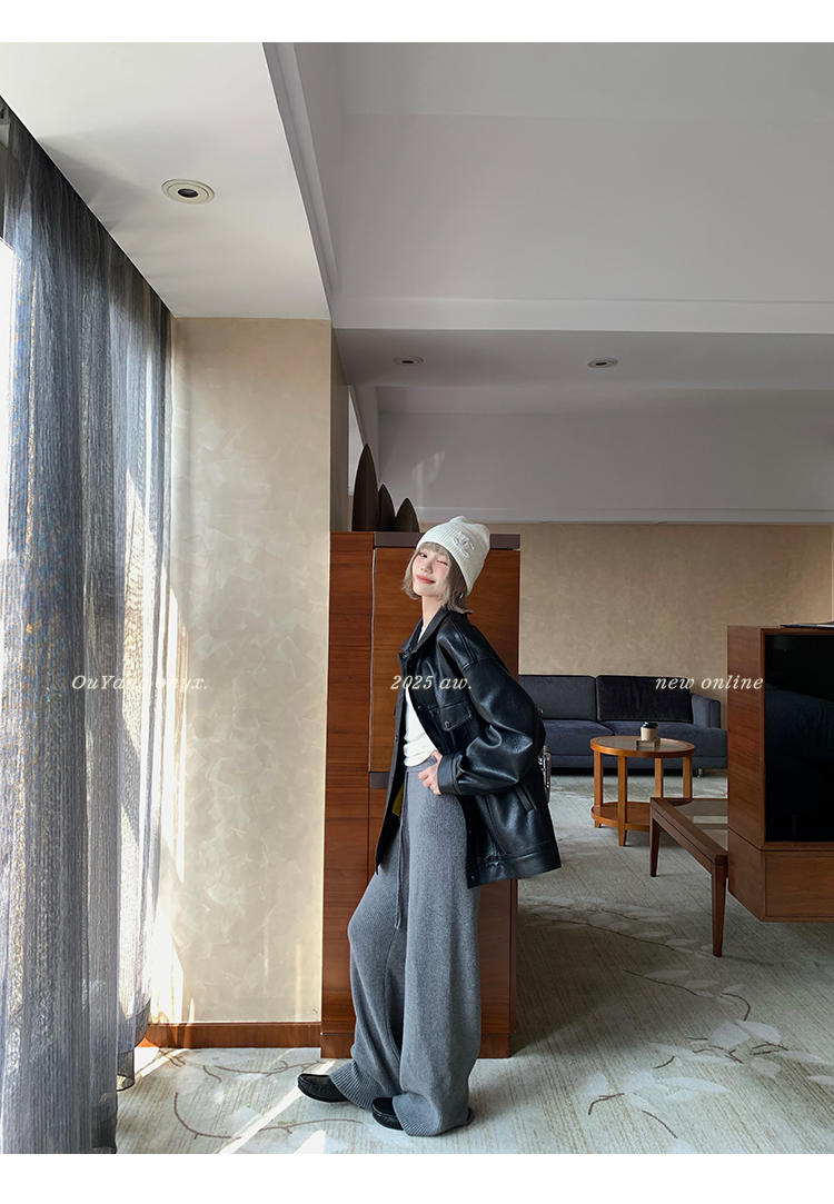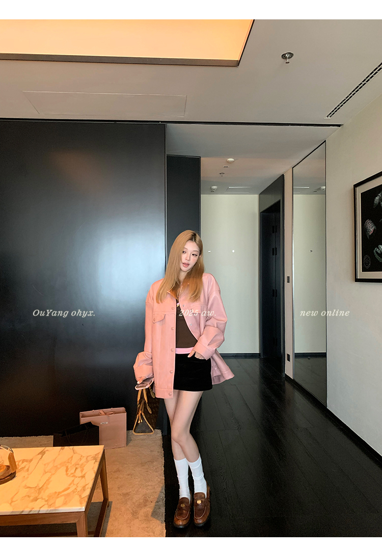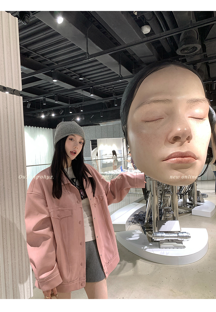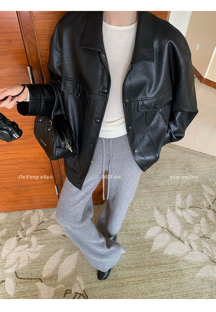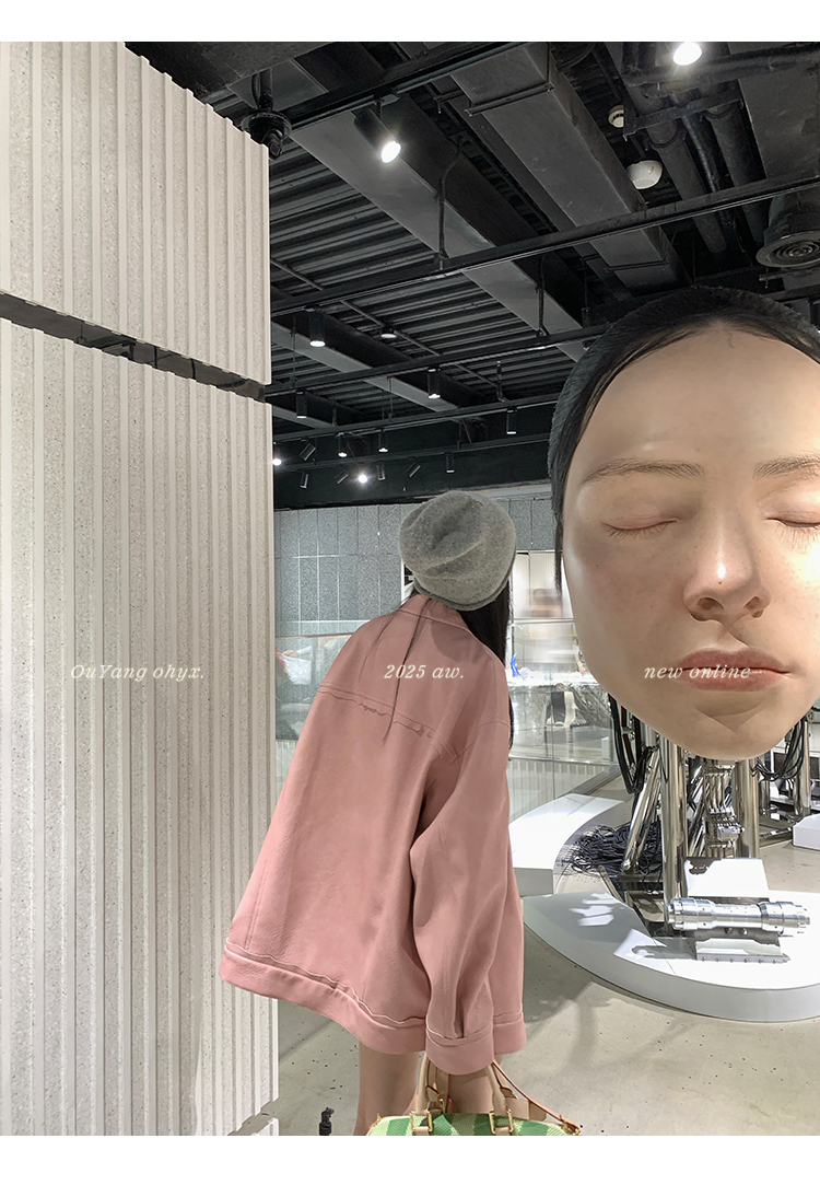 袖口、下摆、前片不规则锯齿状皮条拼接