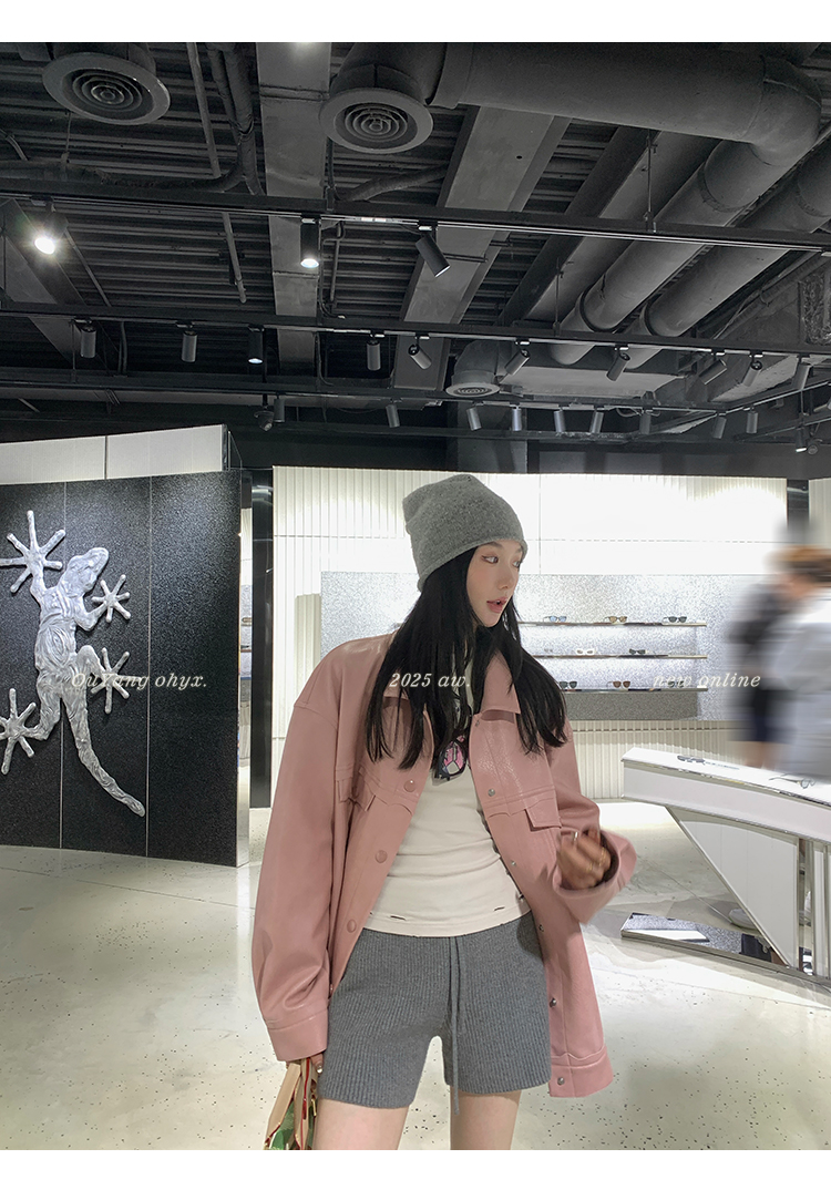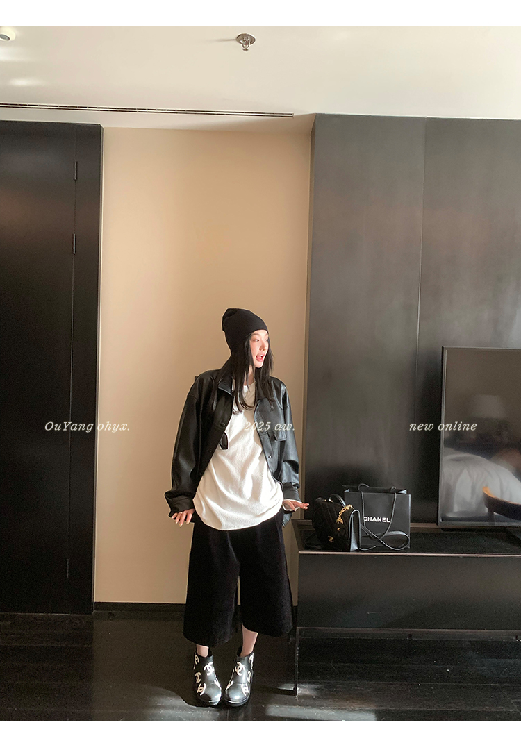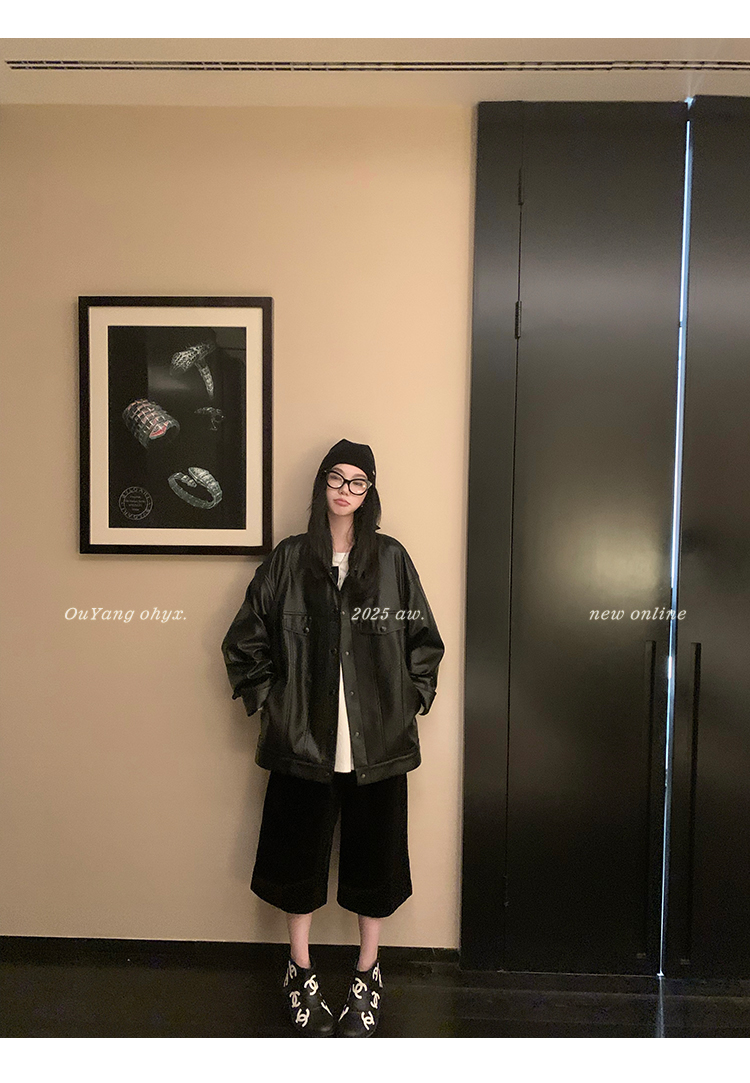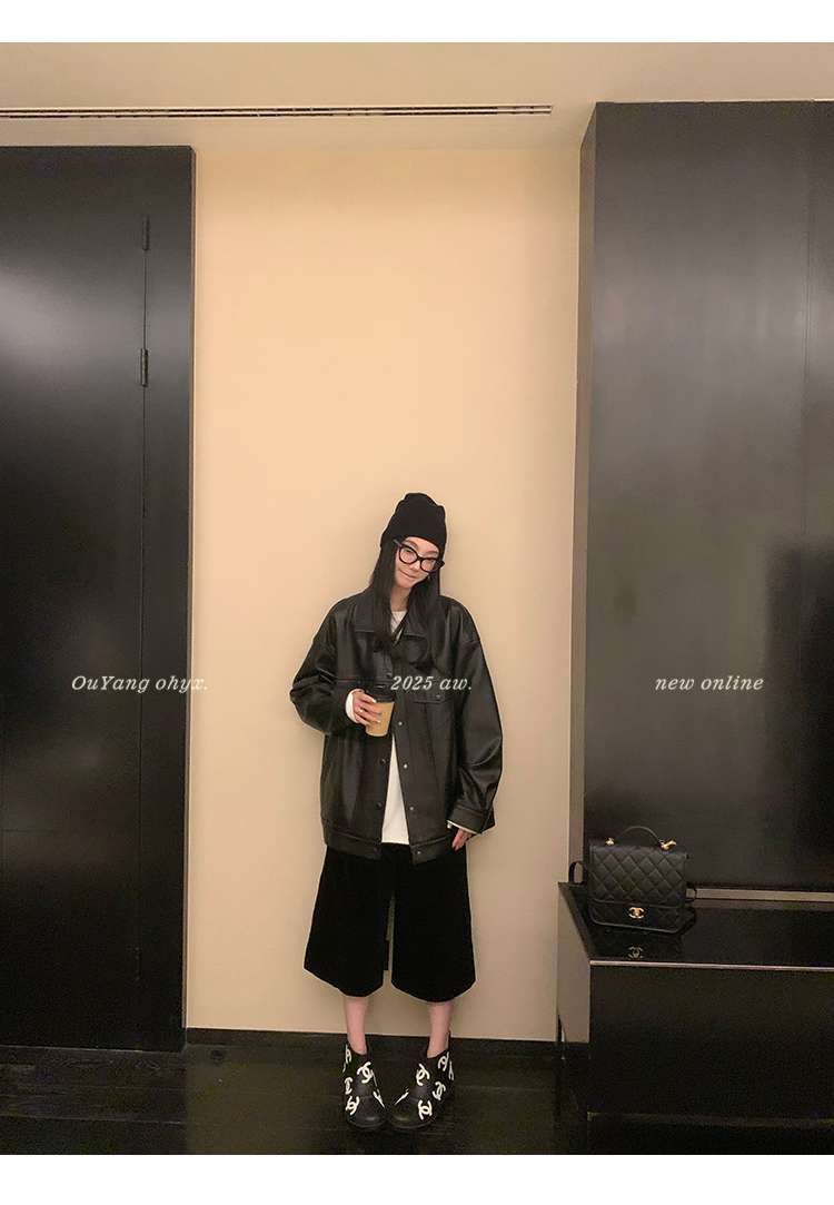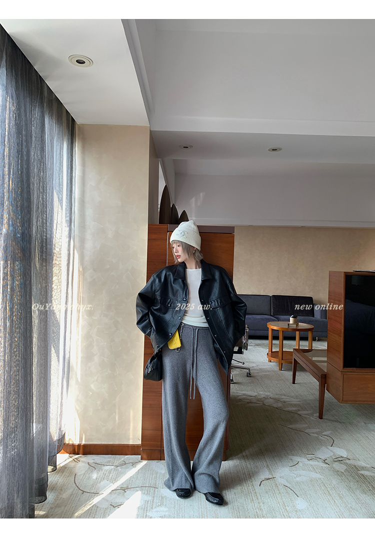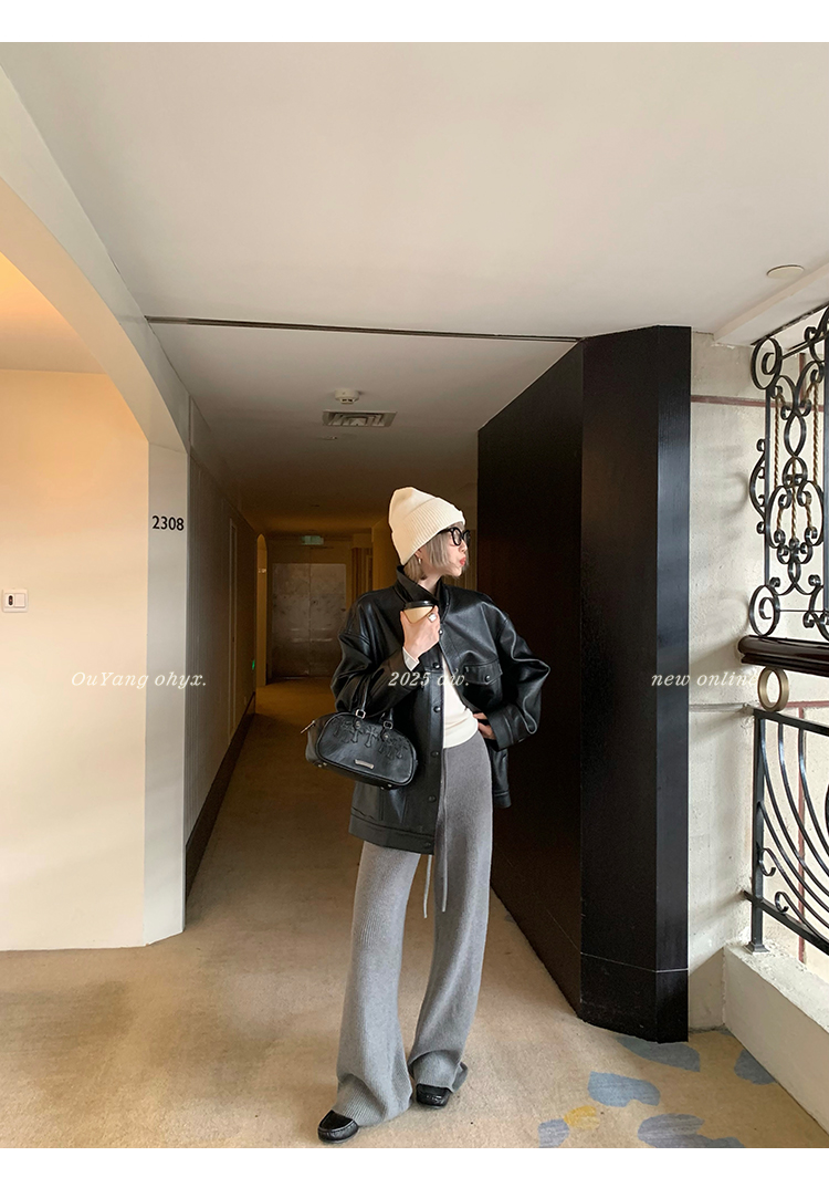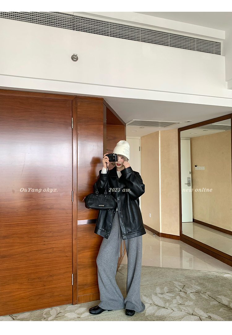 袖口、下摆、前片不规则锯齿状皮条拼接