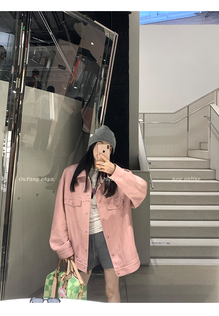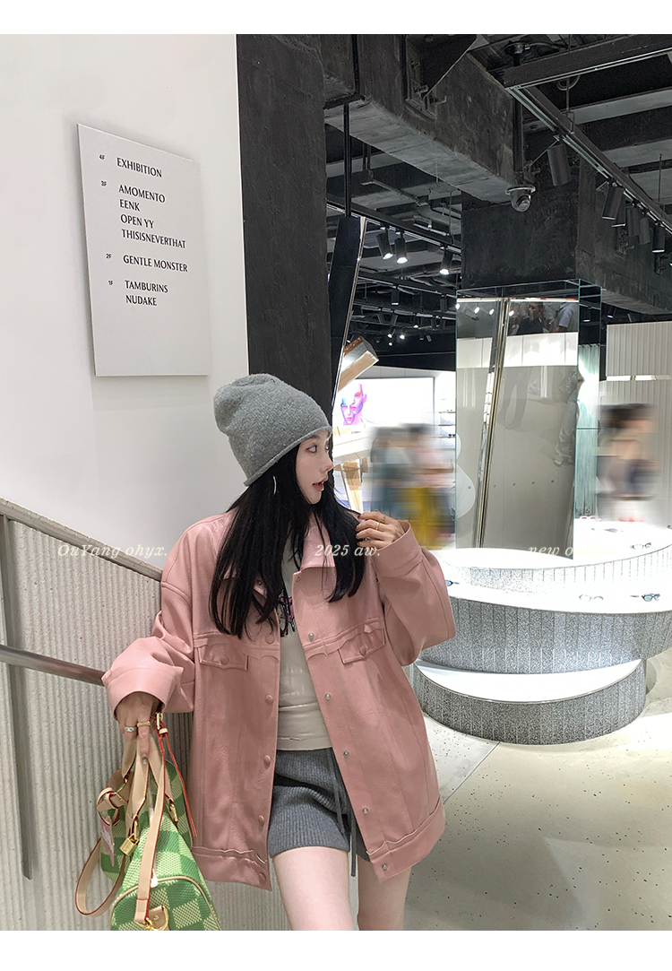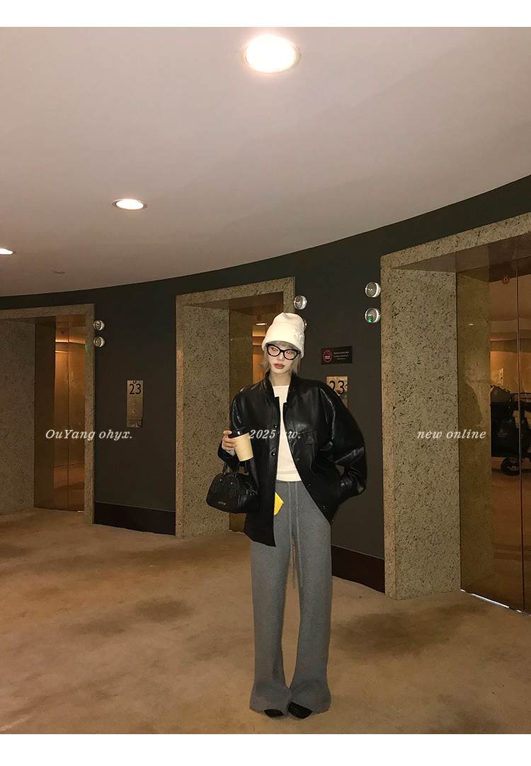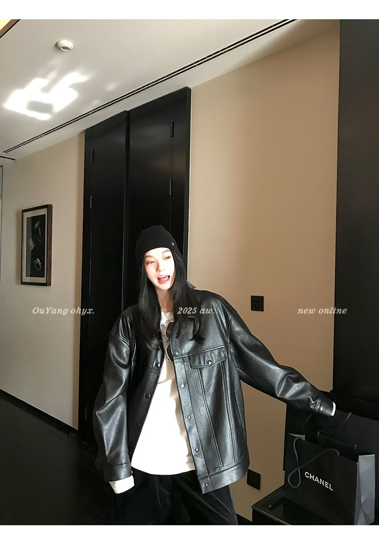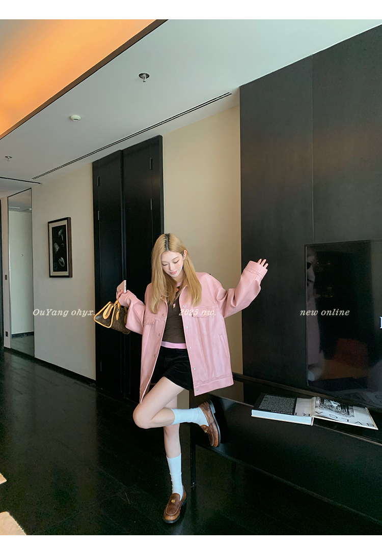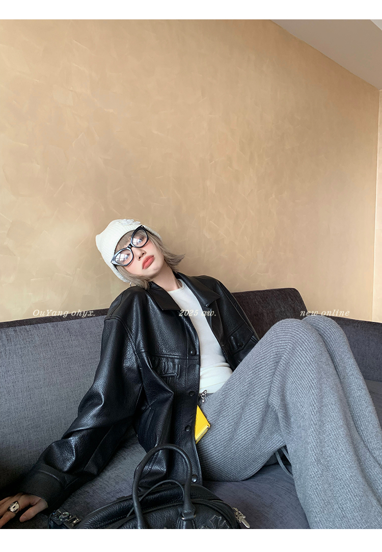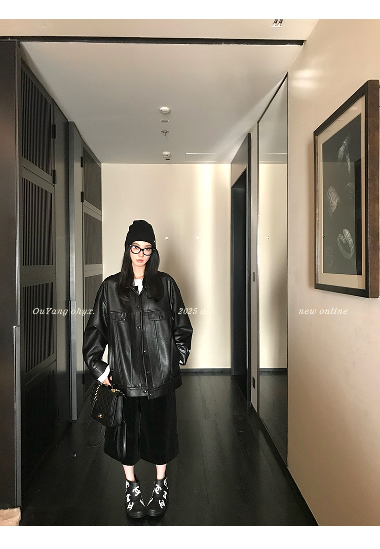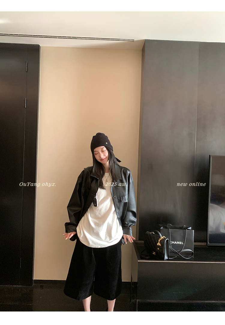 袖口、下摆、前片不规则锯齿状皮条拼接