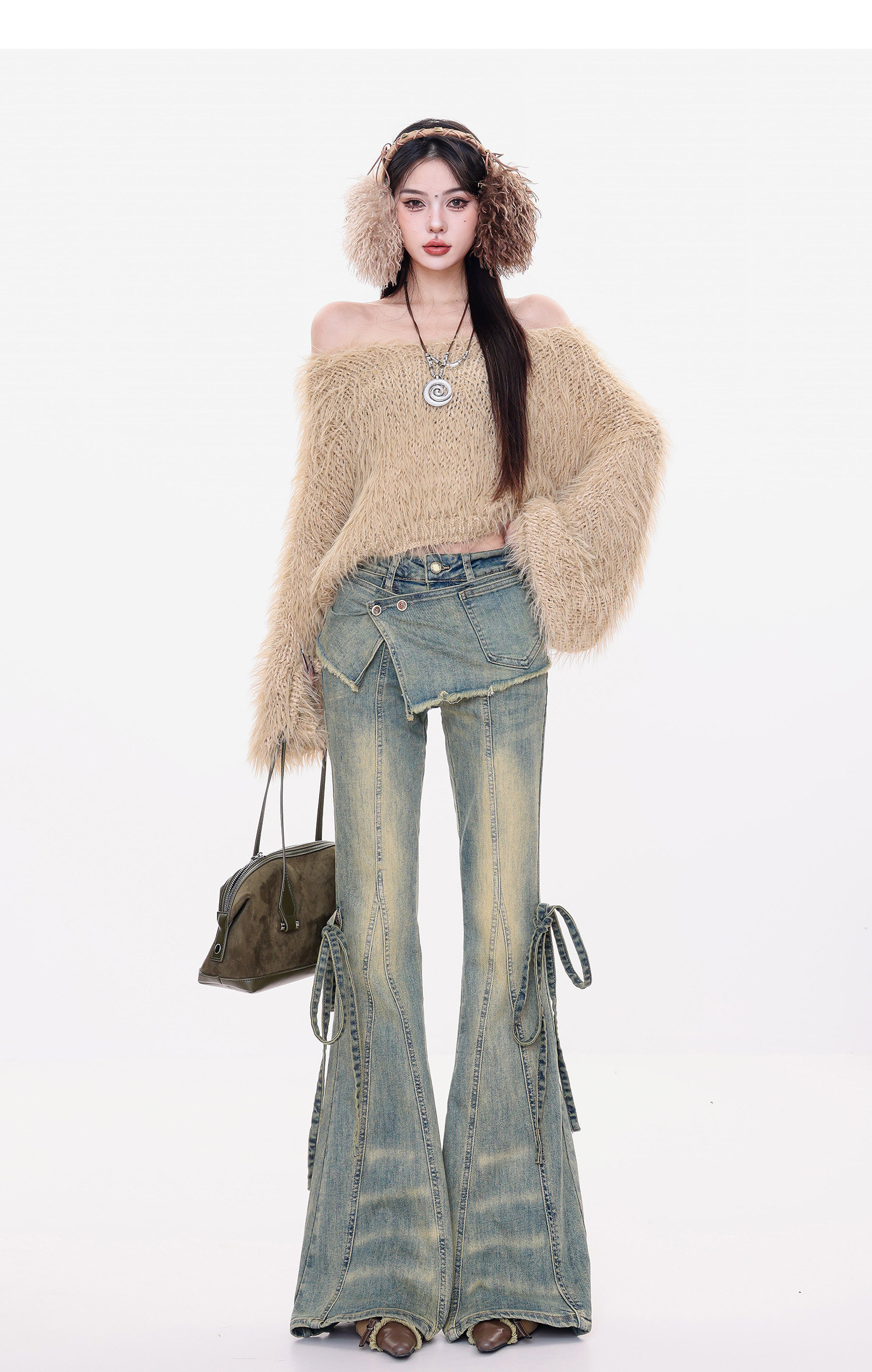 Abwlr Layered Party - Original Vintage Washed Jeans for Women, High Waist, Fleece-Lined, Slightly Flared Pants