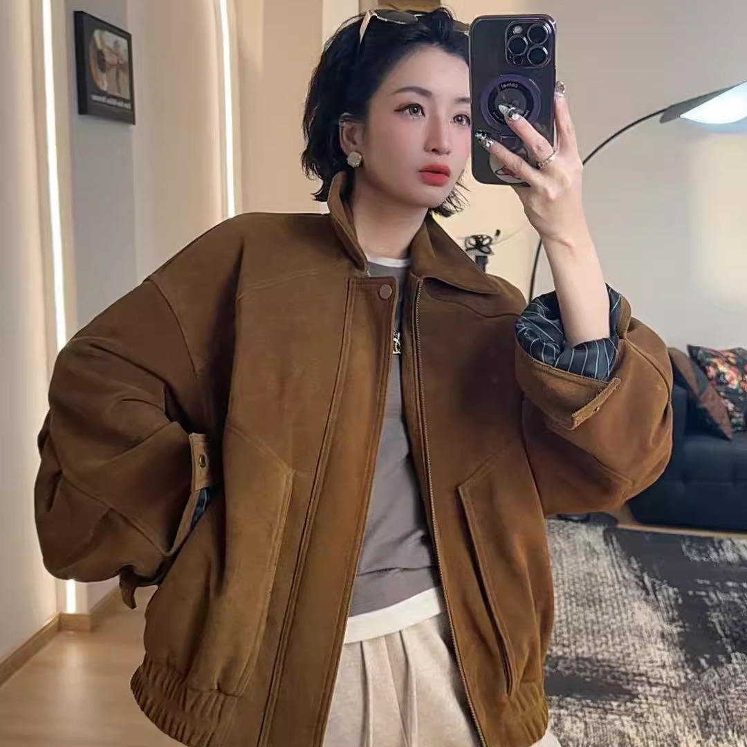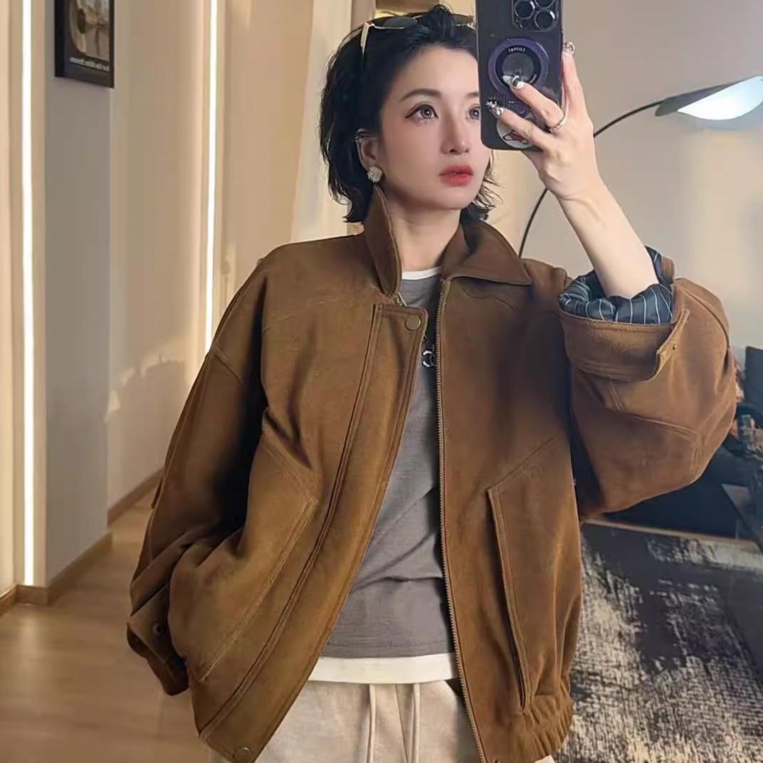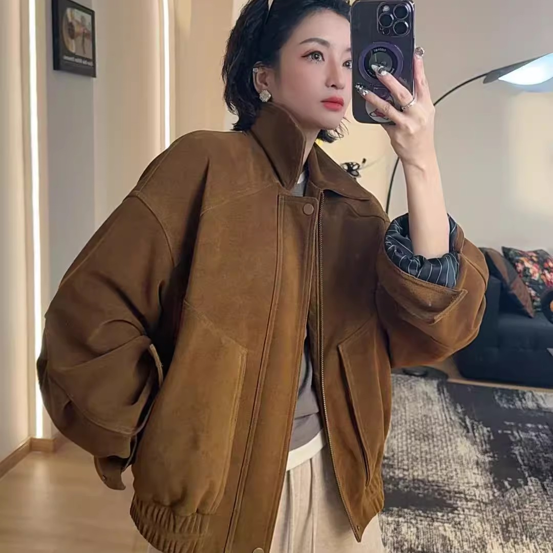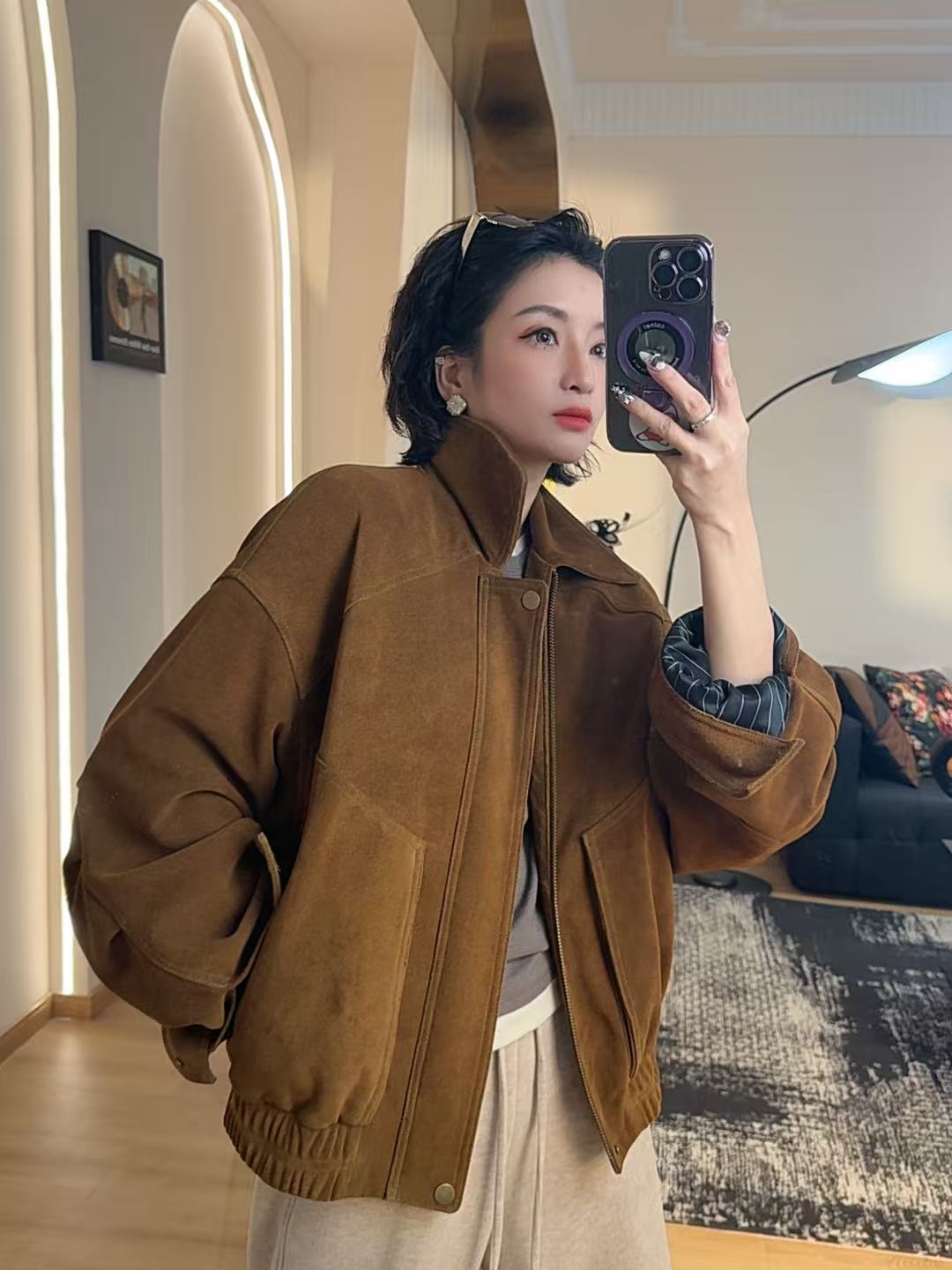 Qishi Yangshulin Y Brand Suede Calfskin Lapel Leather Jacket, Fashionable Retro Jacket for Women, Down-Filled and Thickened