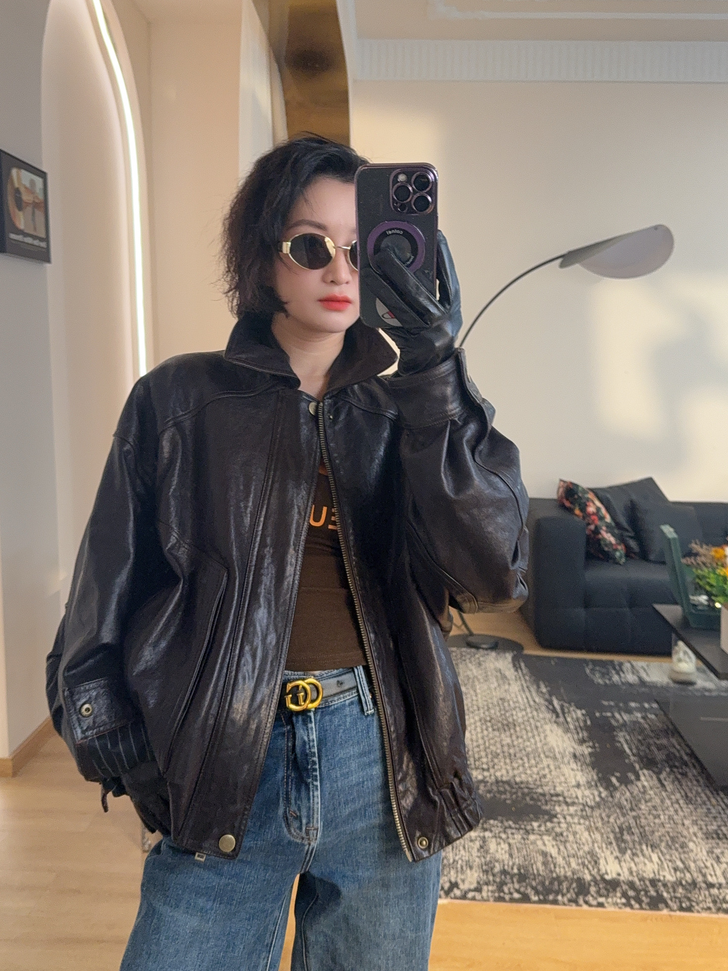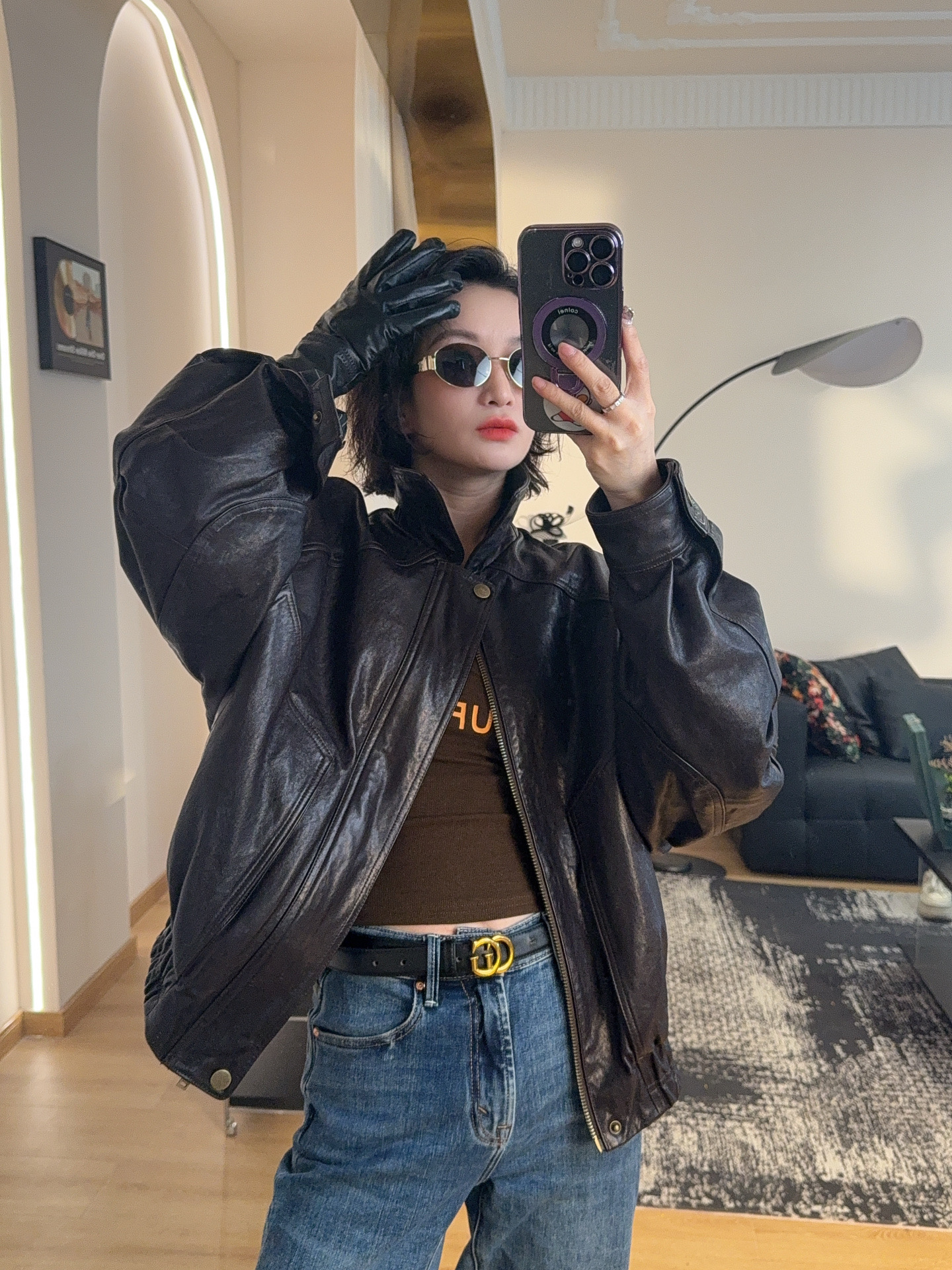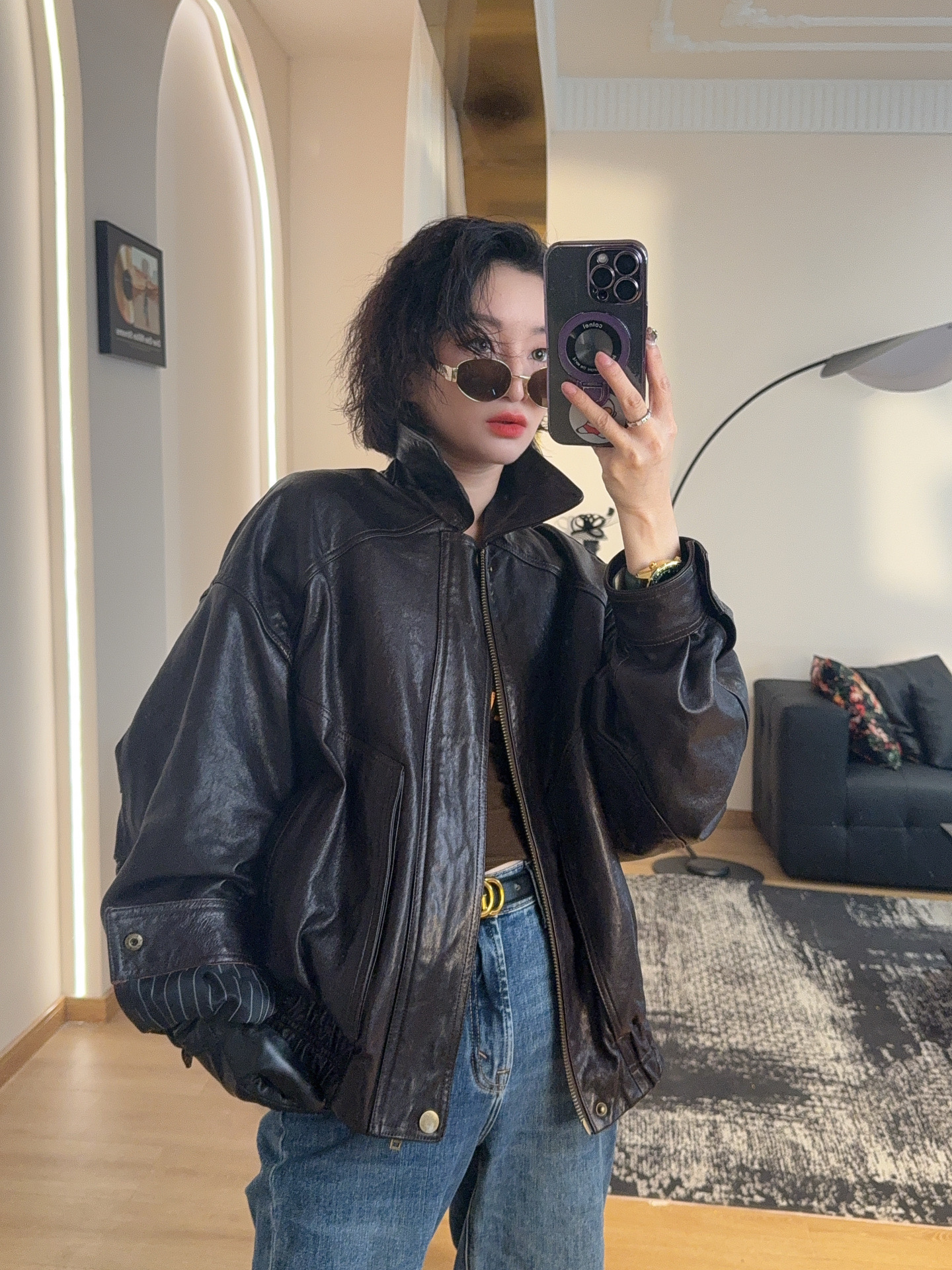 Qishi Yangshulin Y Brand Suede Calfskin Lapel Leather Jacket, Fashionable Retro Jacket for Women, Down-Filled and Thickened