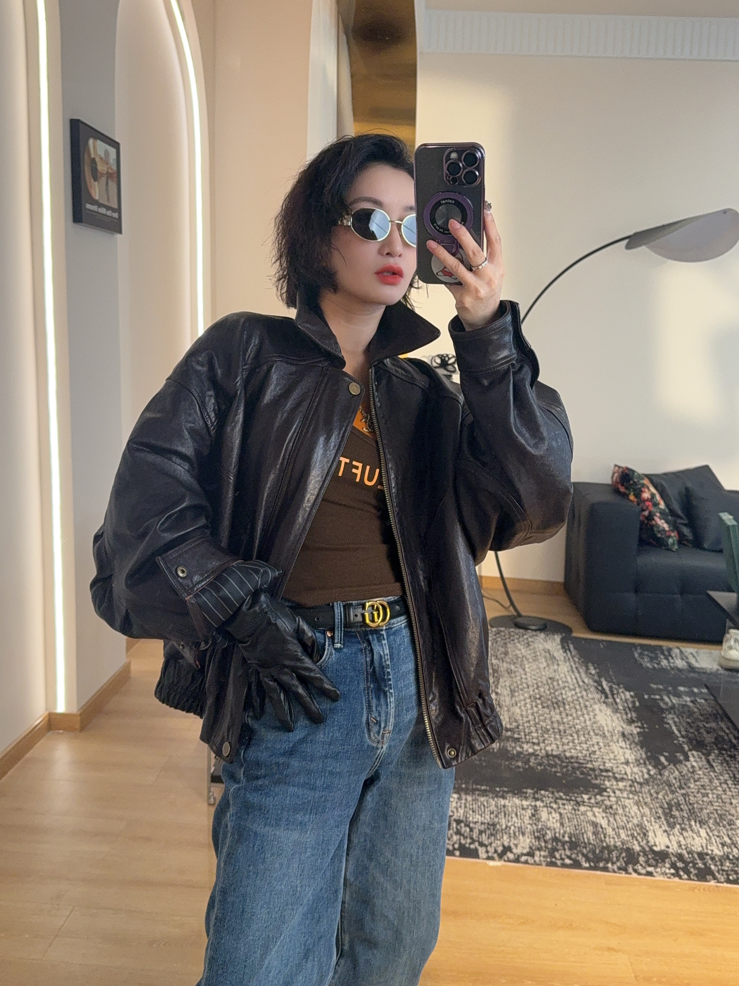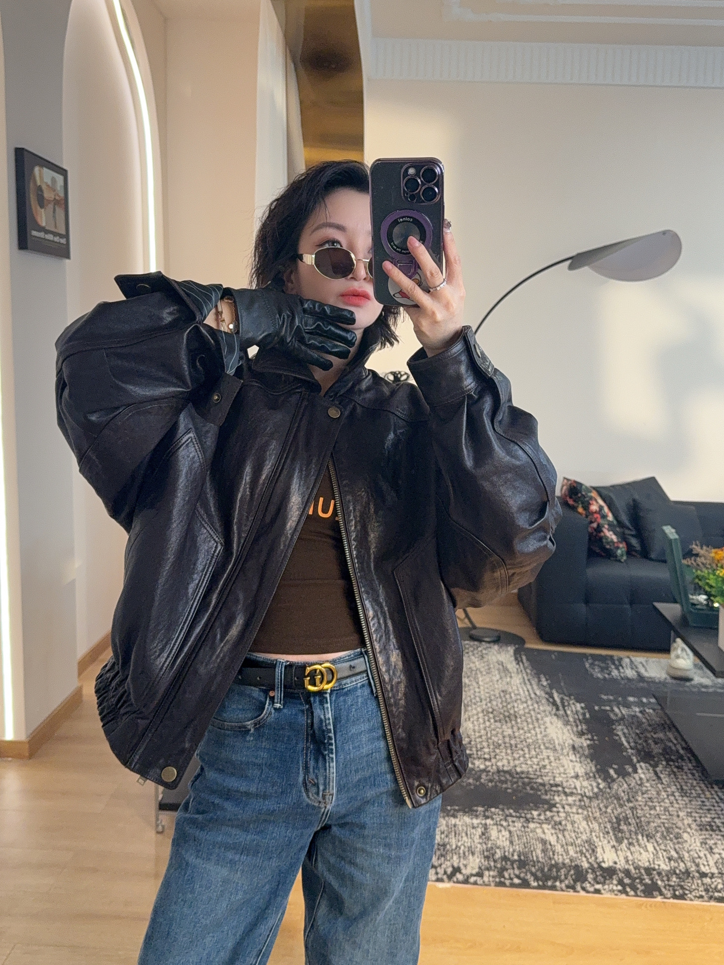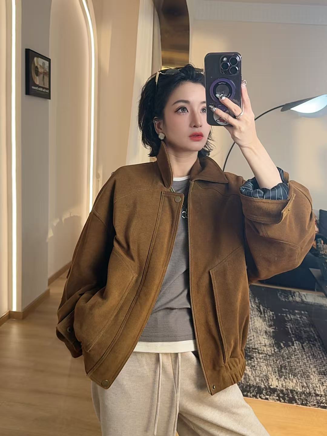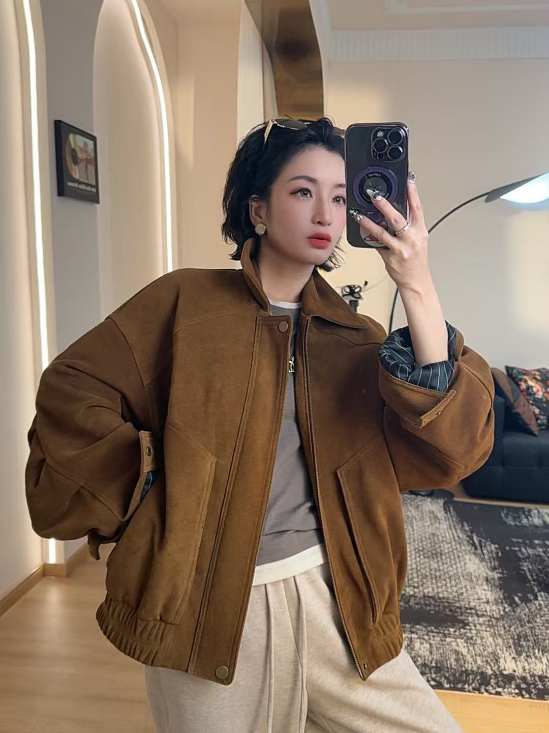 Qishi Yangshulin Y Brand Suede Calfskin Lapel Leather Jacket, Fashionable Retro Jacket for Women, Down-Filled and Thickened