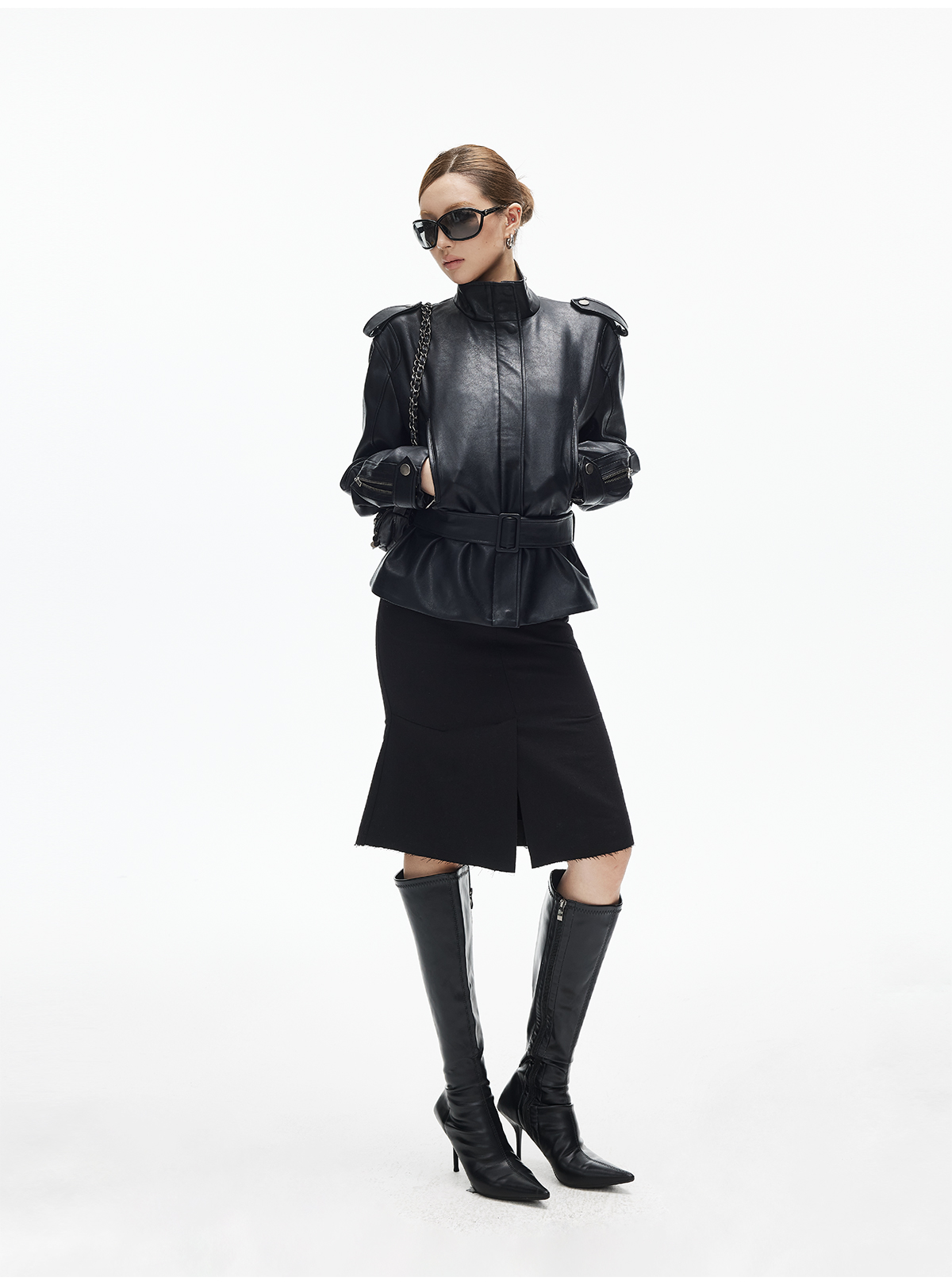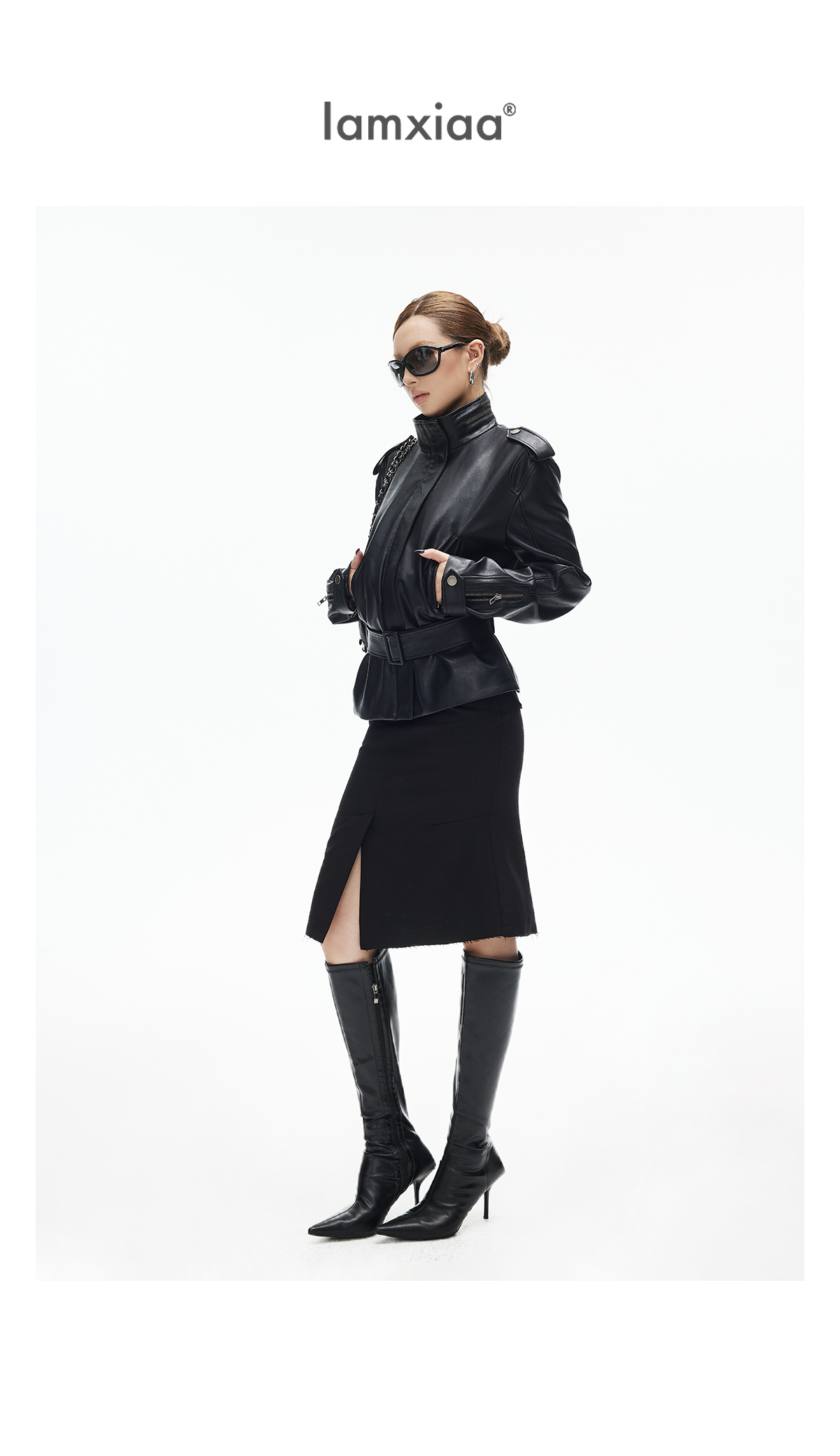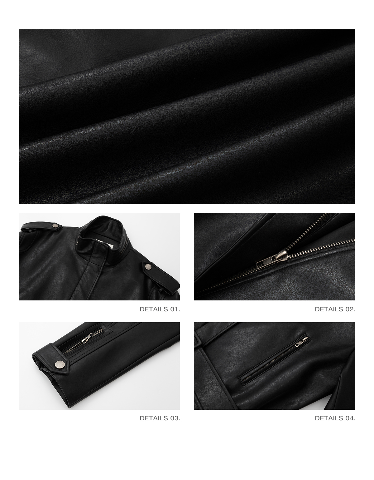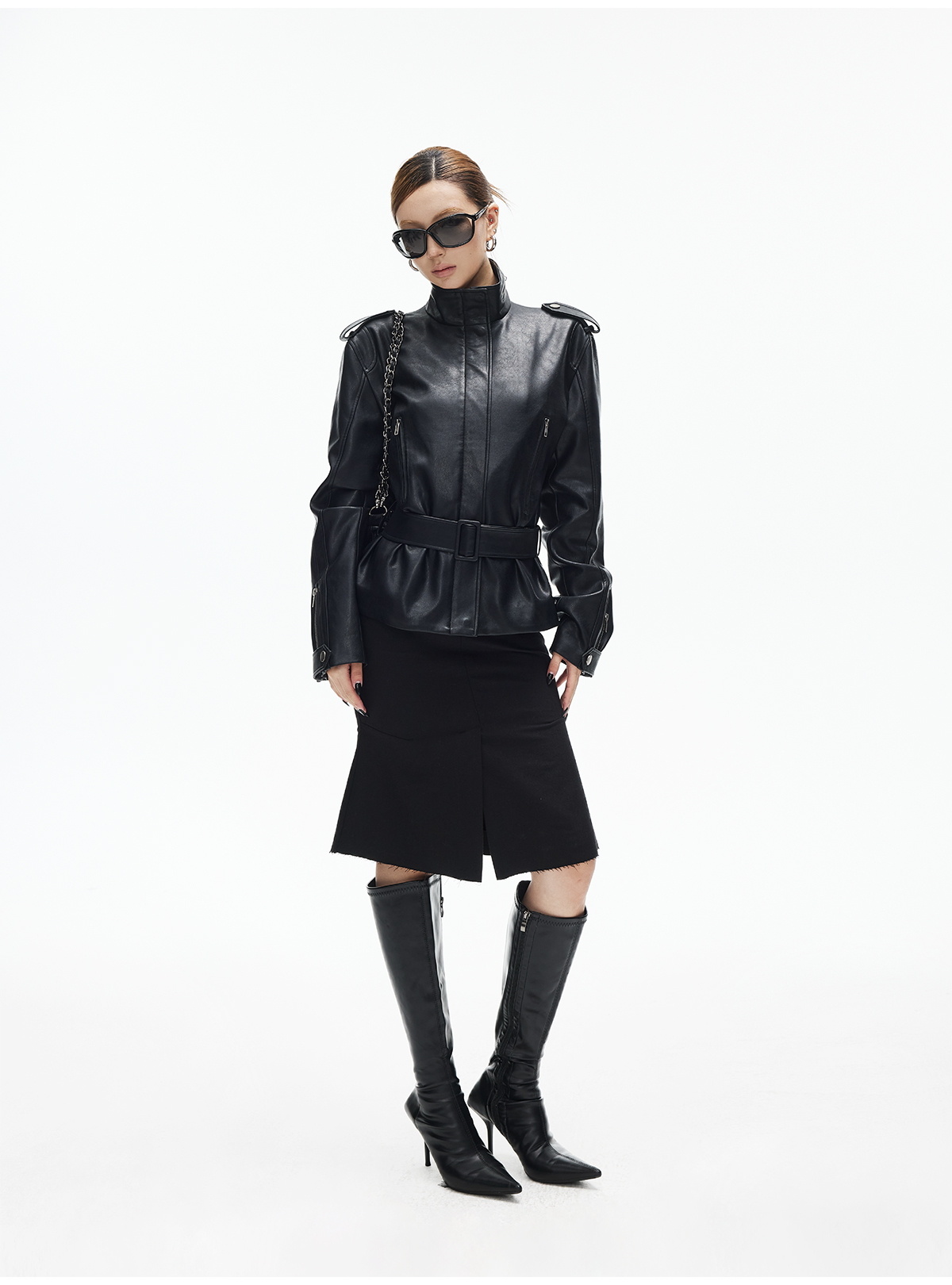 Iamxiaa* Soft Matte Black Pu Leather Stand Collar Epaulet Belt Waist-Cinching Functional Style Short Wide Leather Jacket