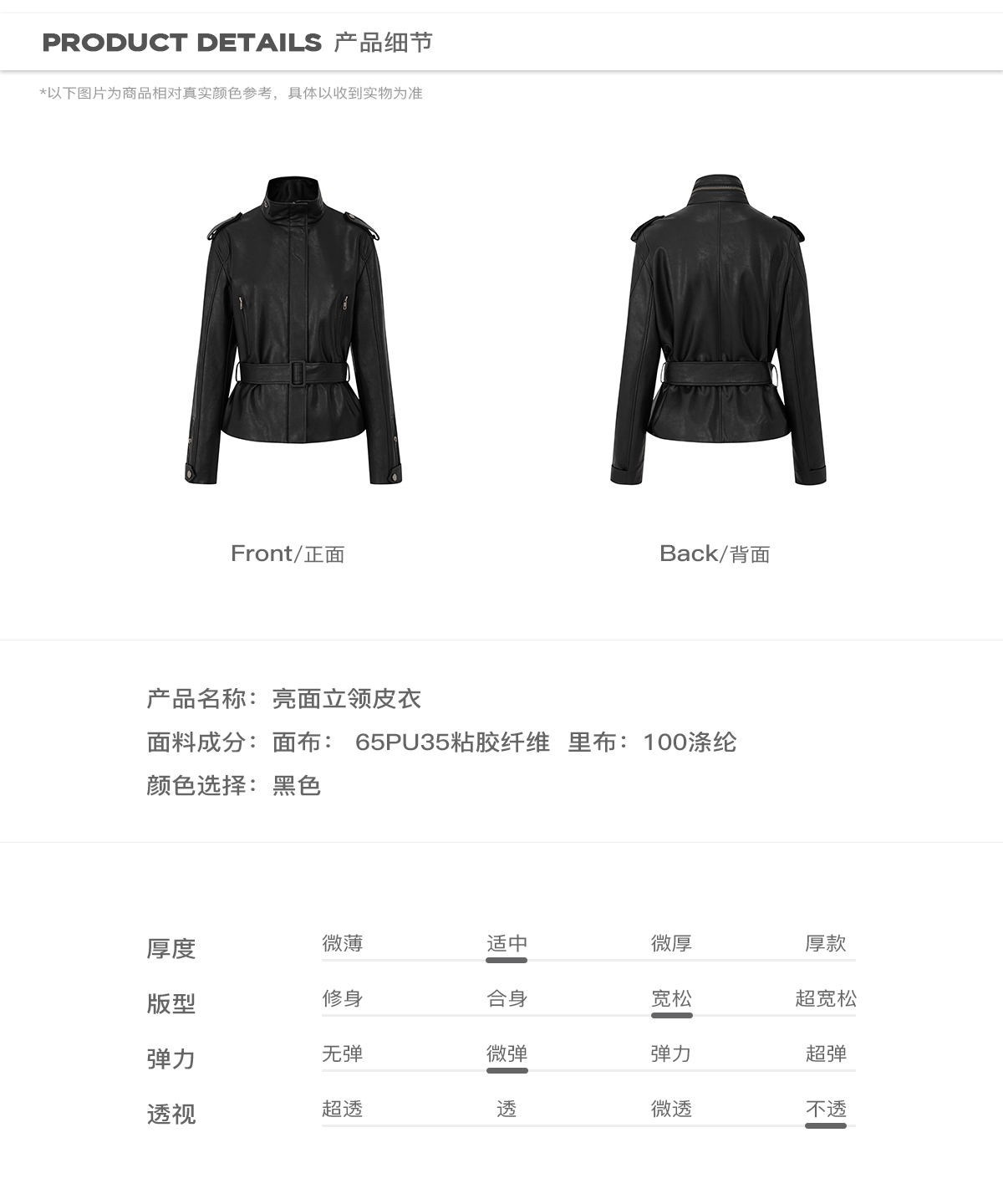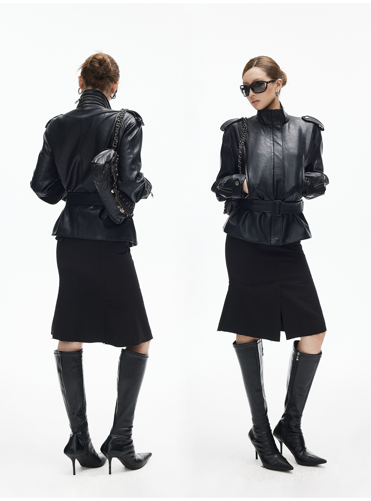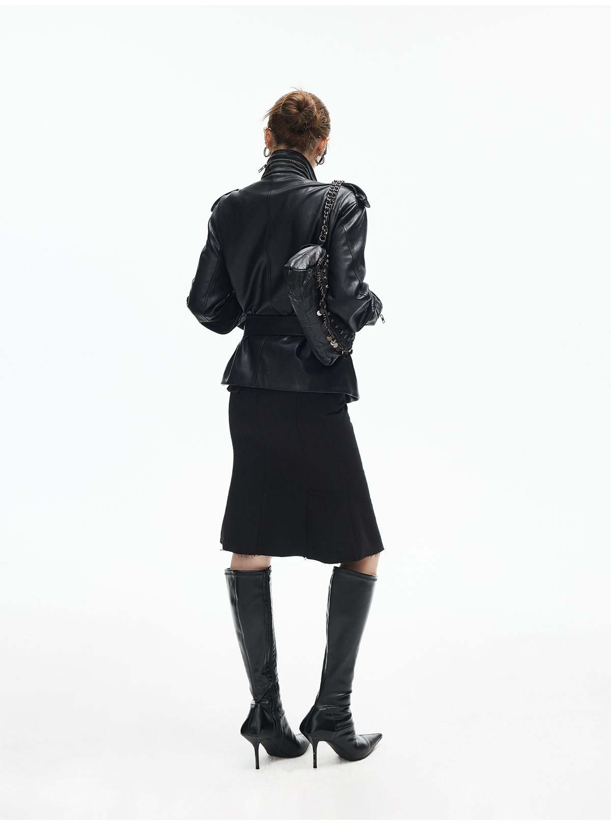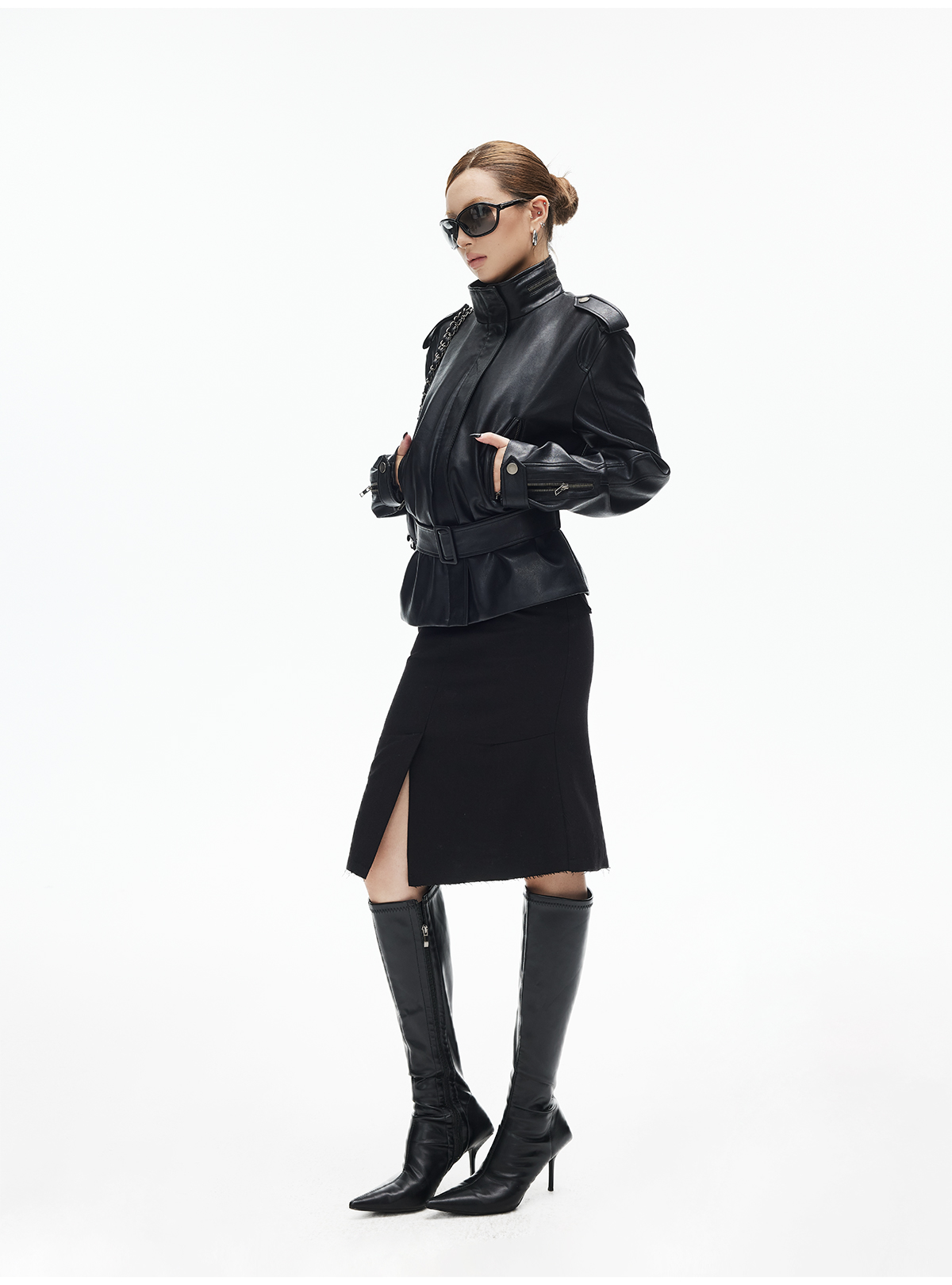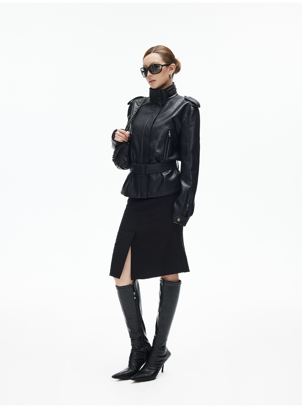 Iamxiaa* Soft Matte Black Pu Leather Stand Collar Epaulet Belt Waist-Cinching Functional Style Short Wide Leather Jacket