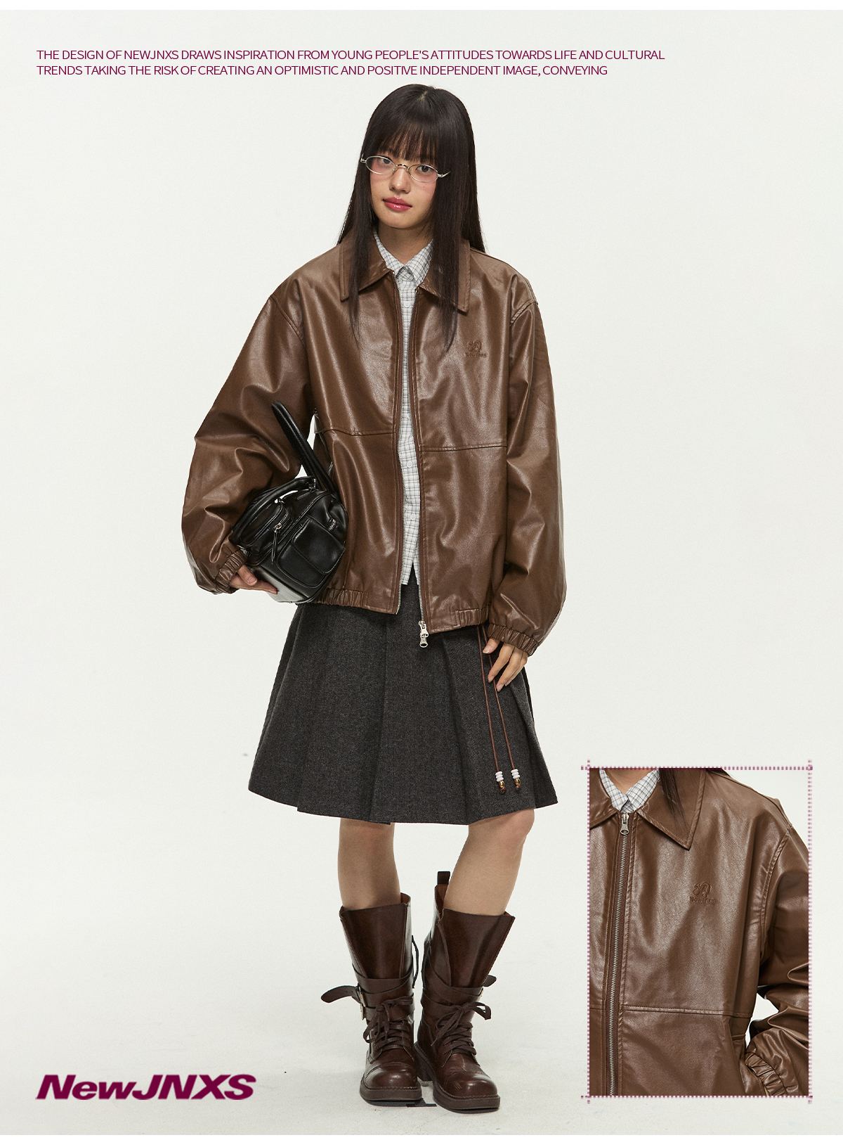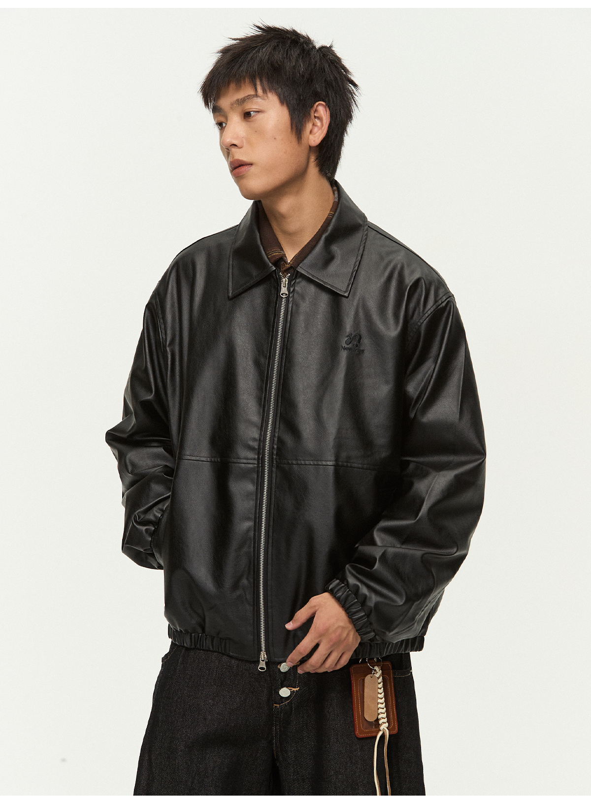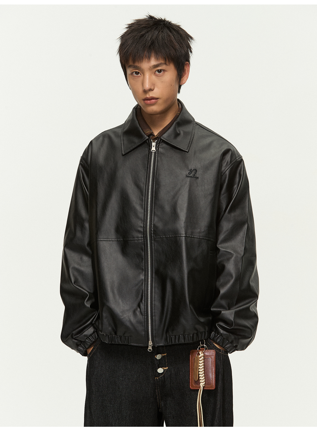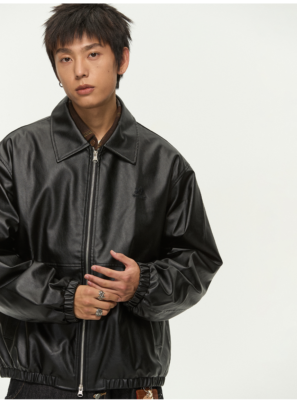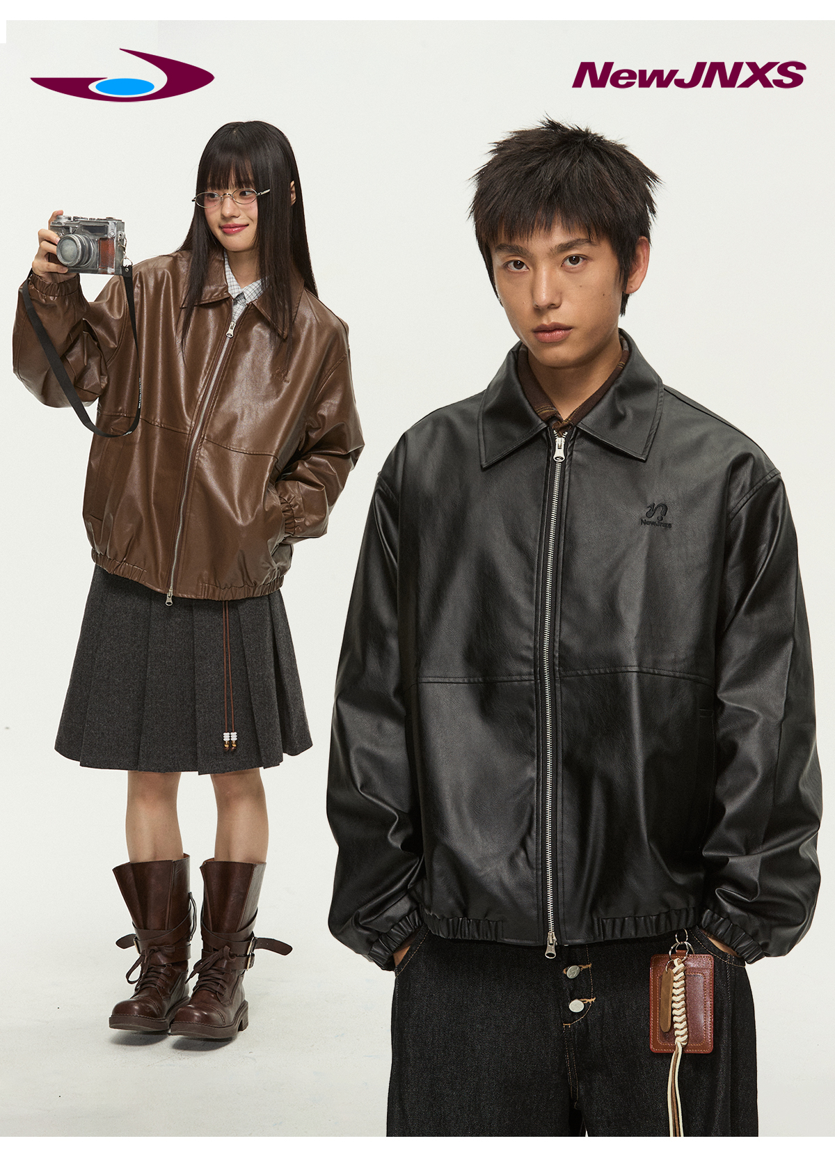 Mr. Jiangnan Newjnxs Retro Lapel Double Zipper Leather Jacket Unisex Casual Logo Embroidered Coat