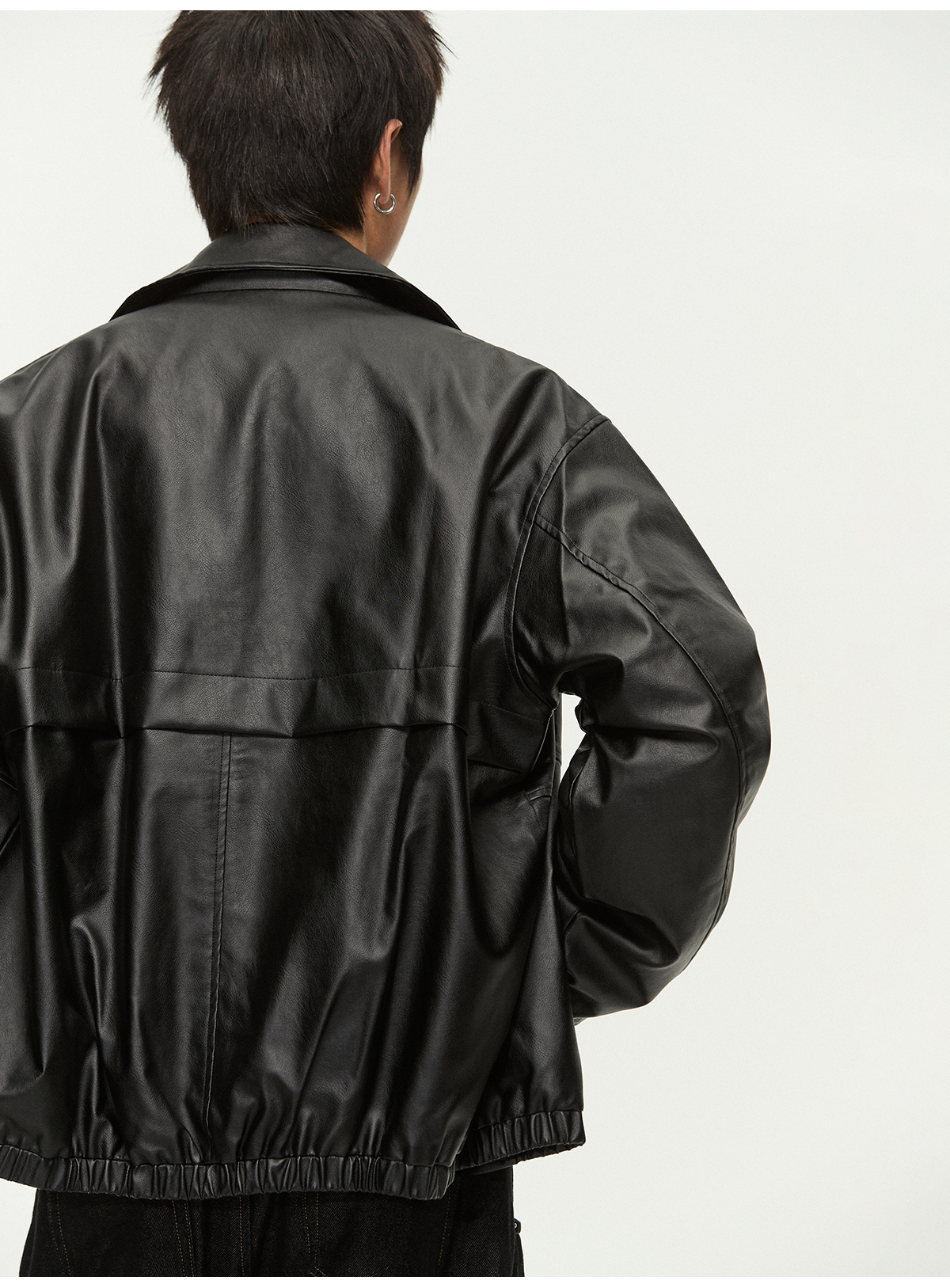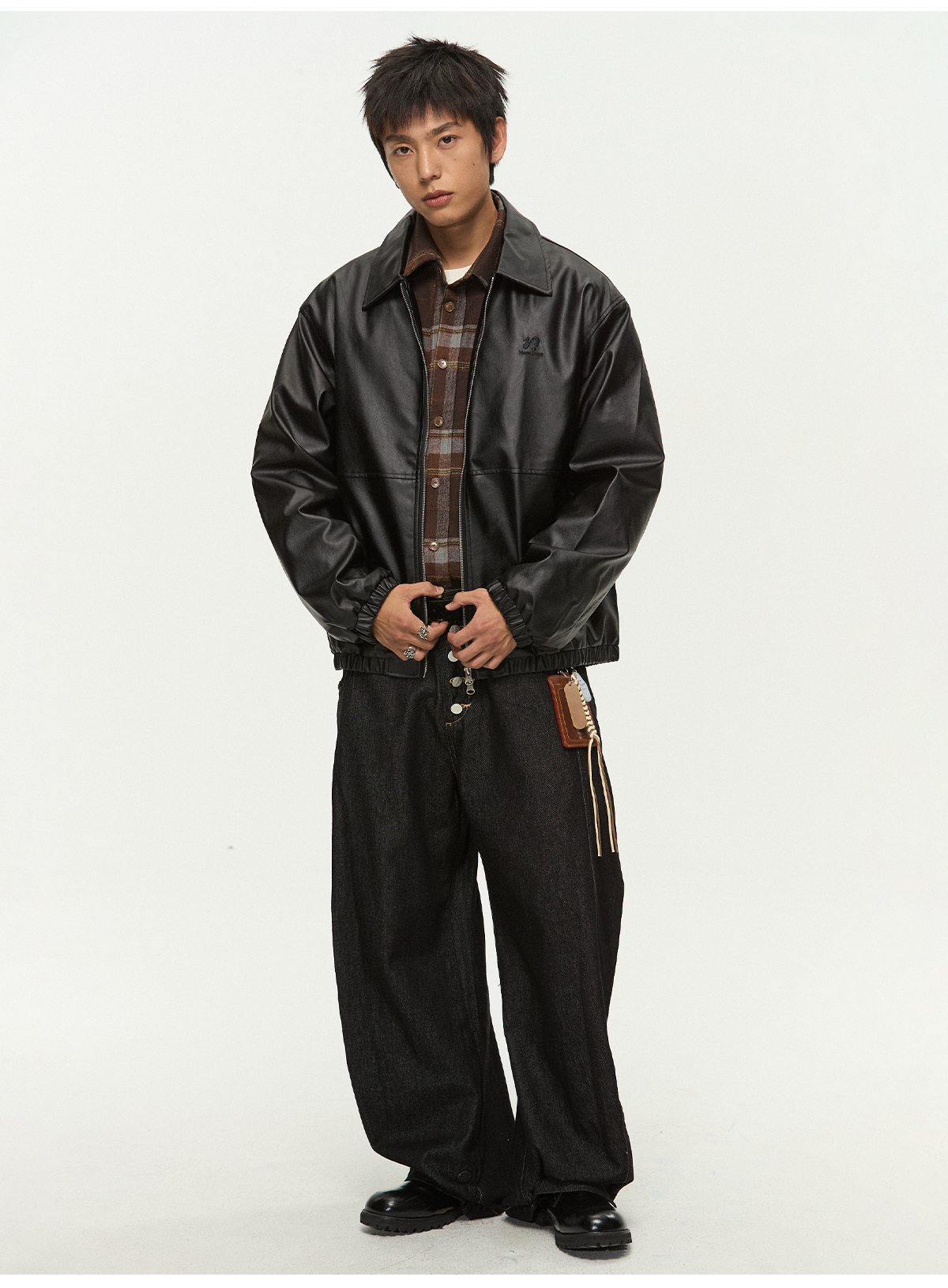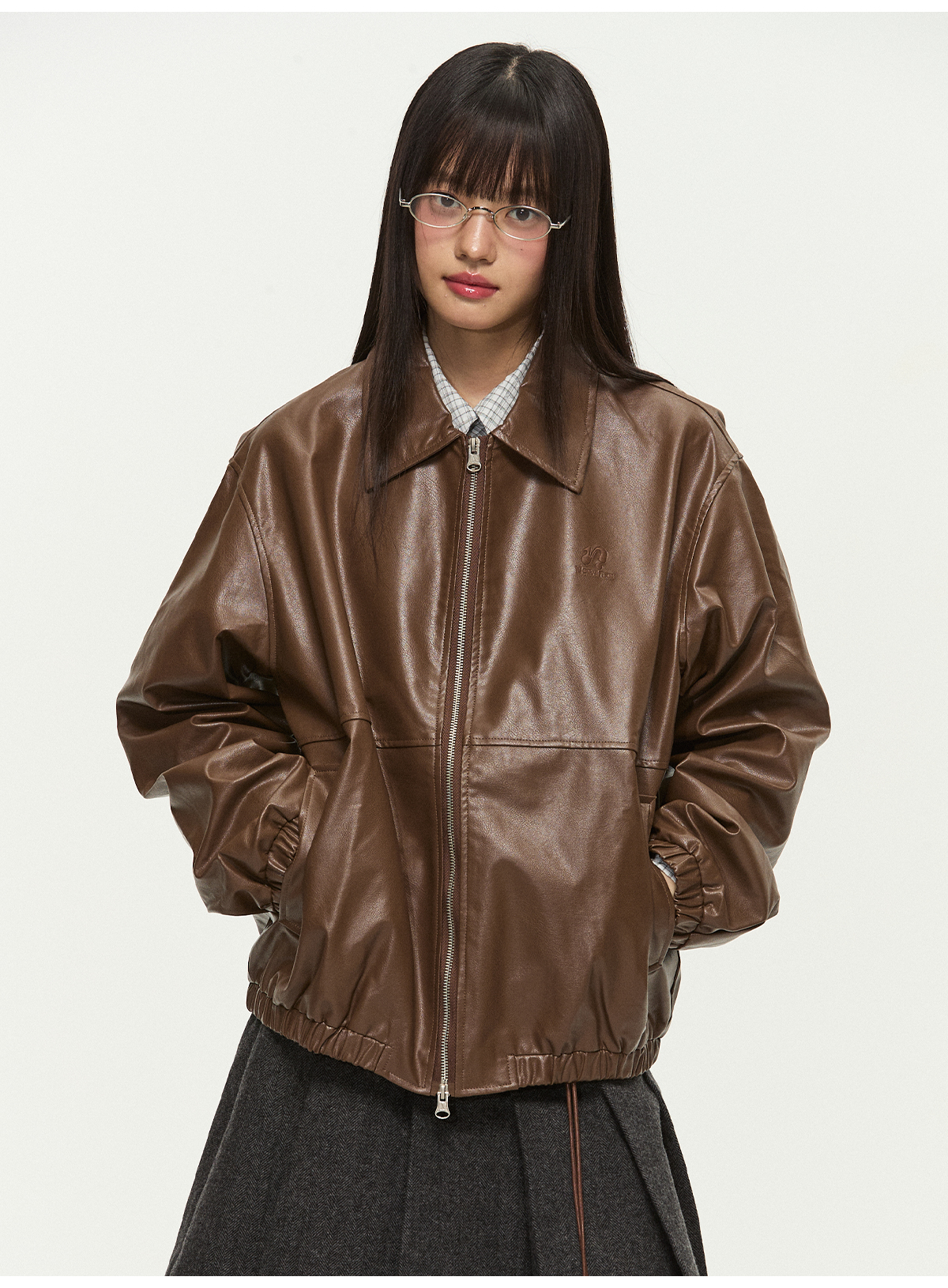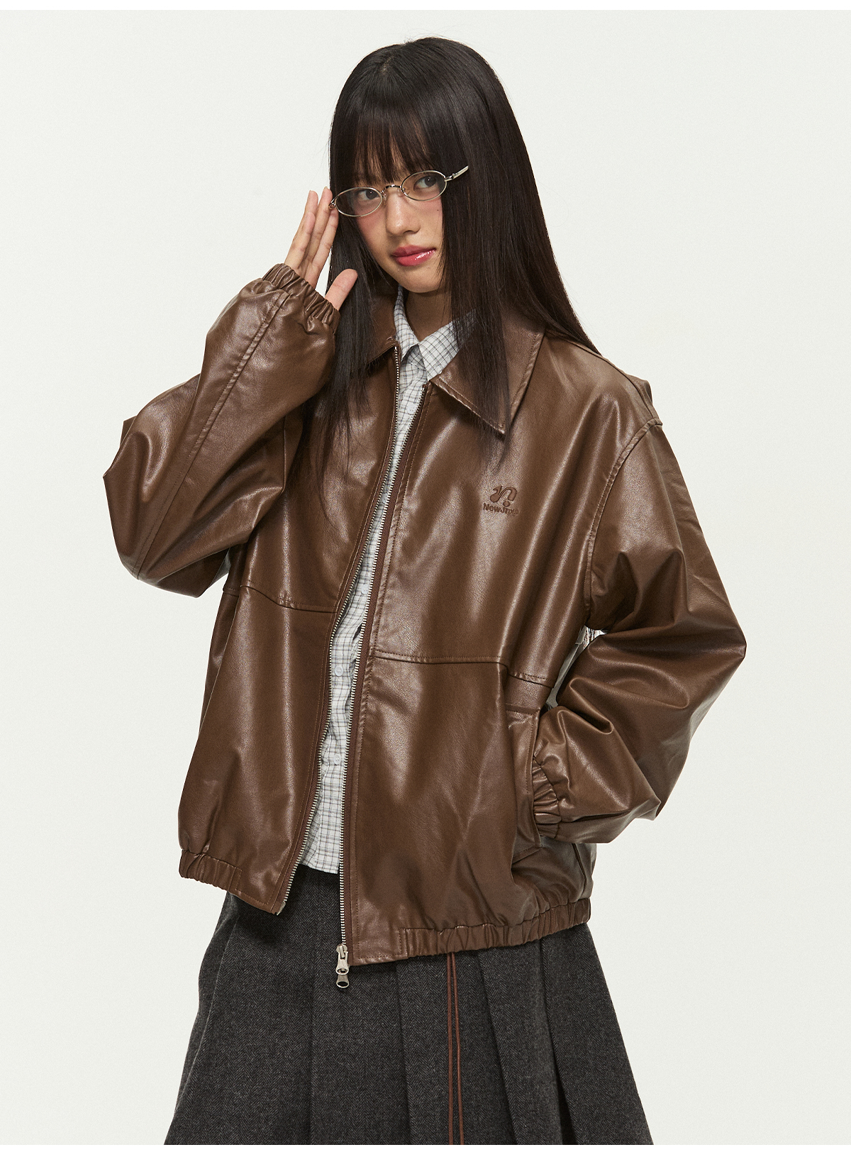 Mr. Jiangnan Newjnxs Retro Lapel Double Zipper Leather Jacket Unisex Casual Logo Embroidered Coat