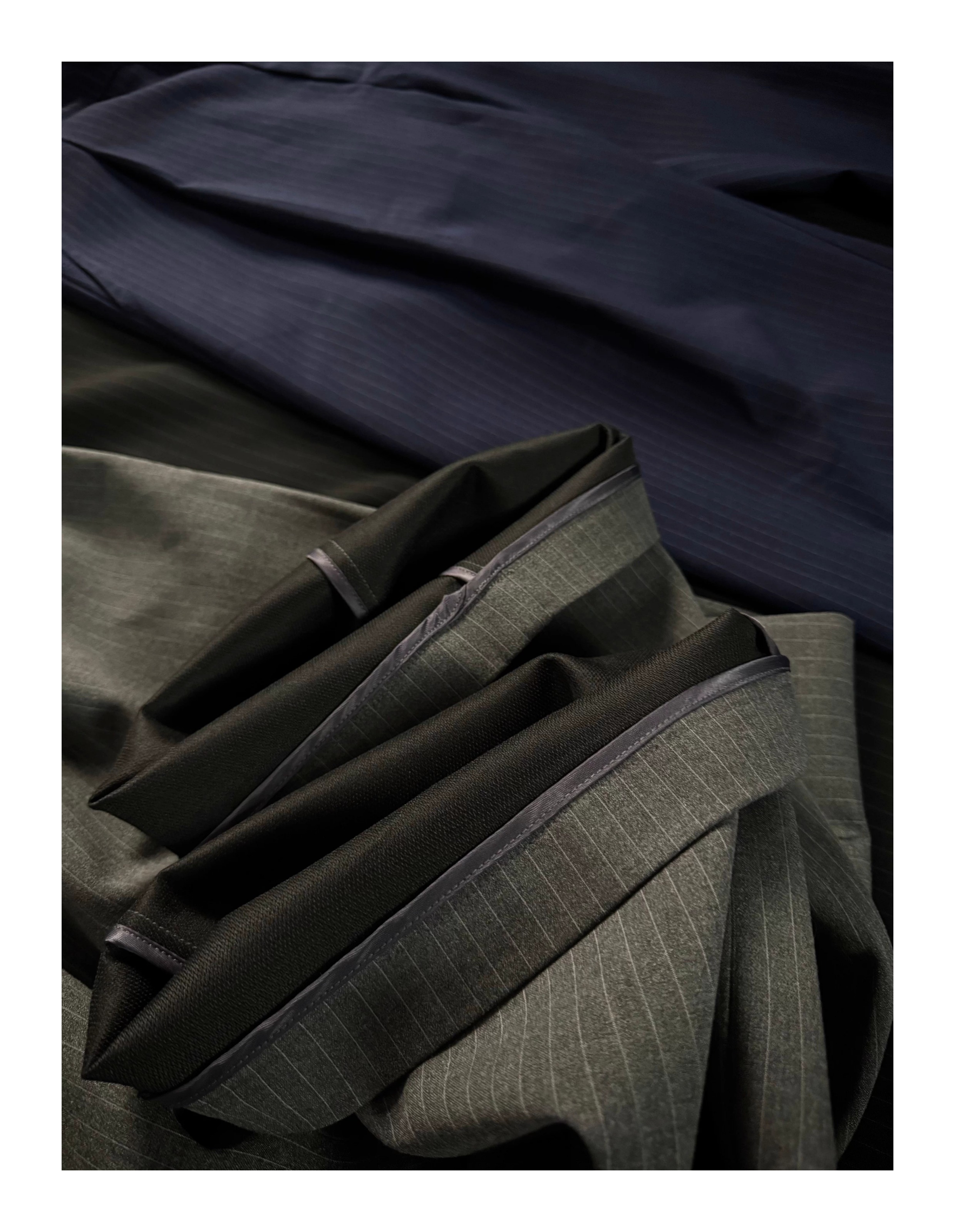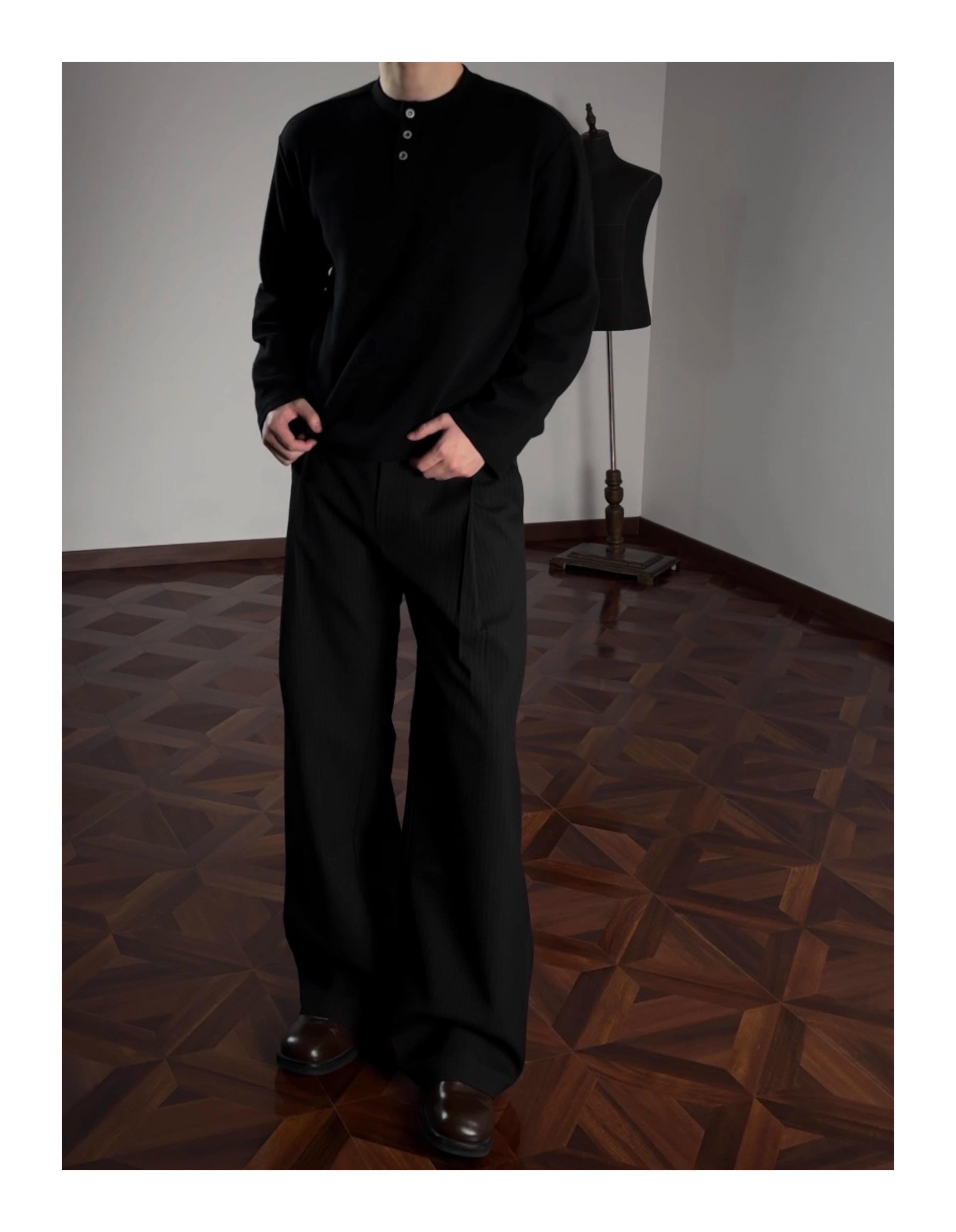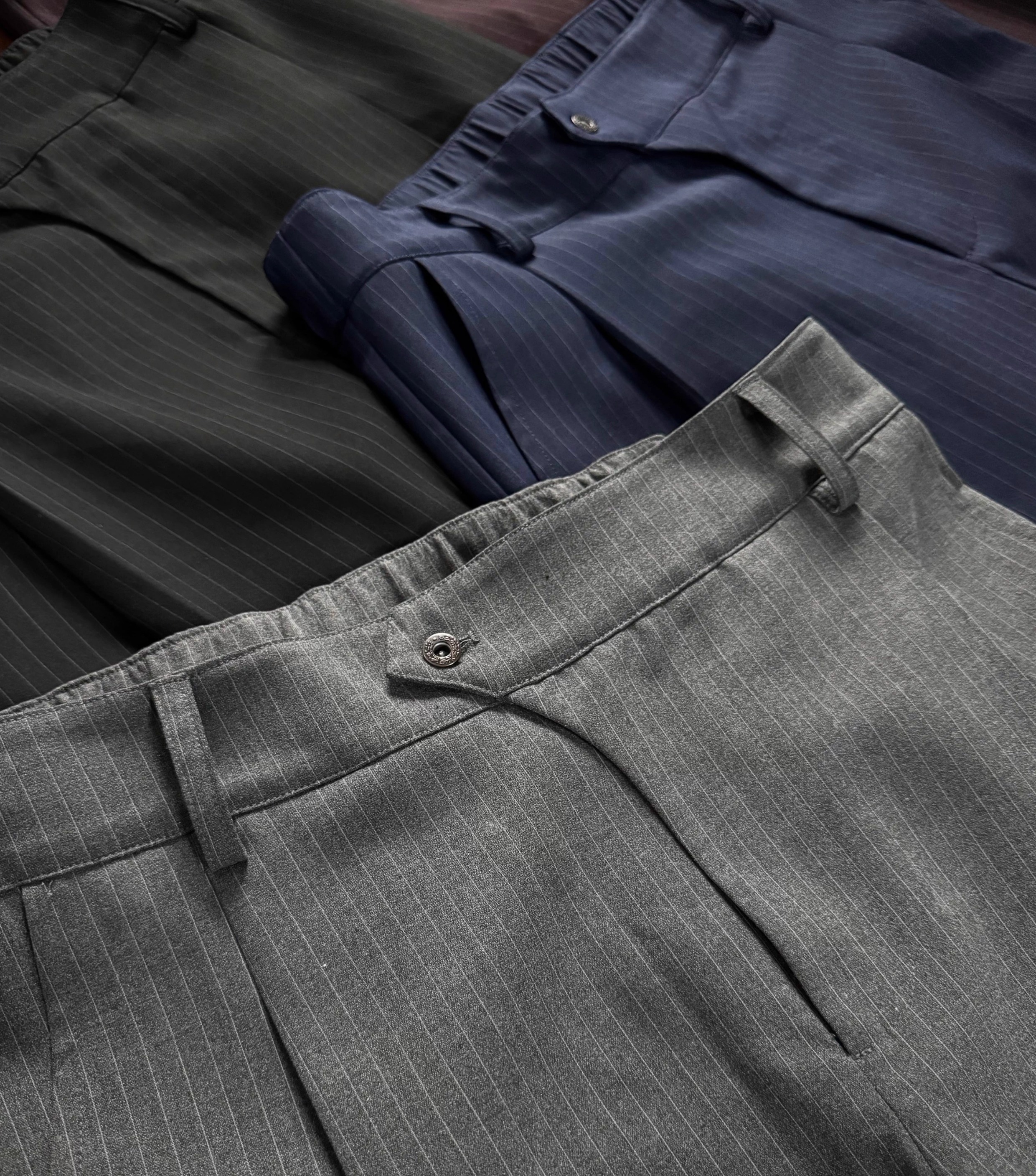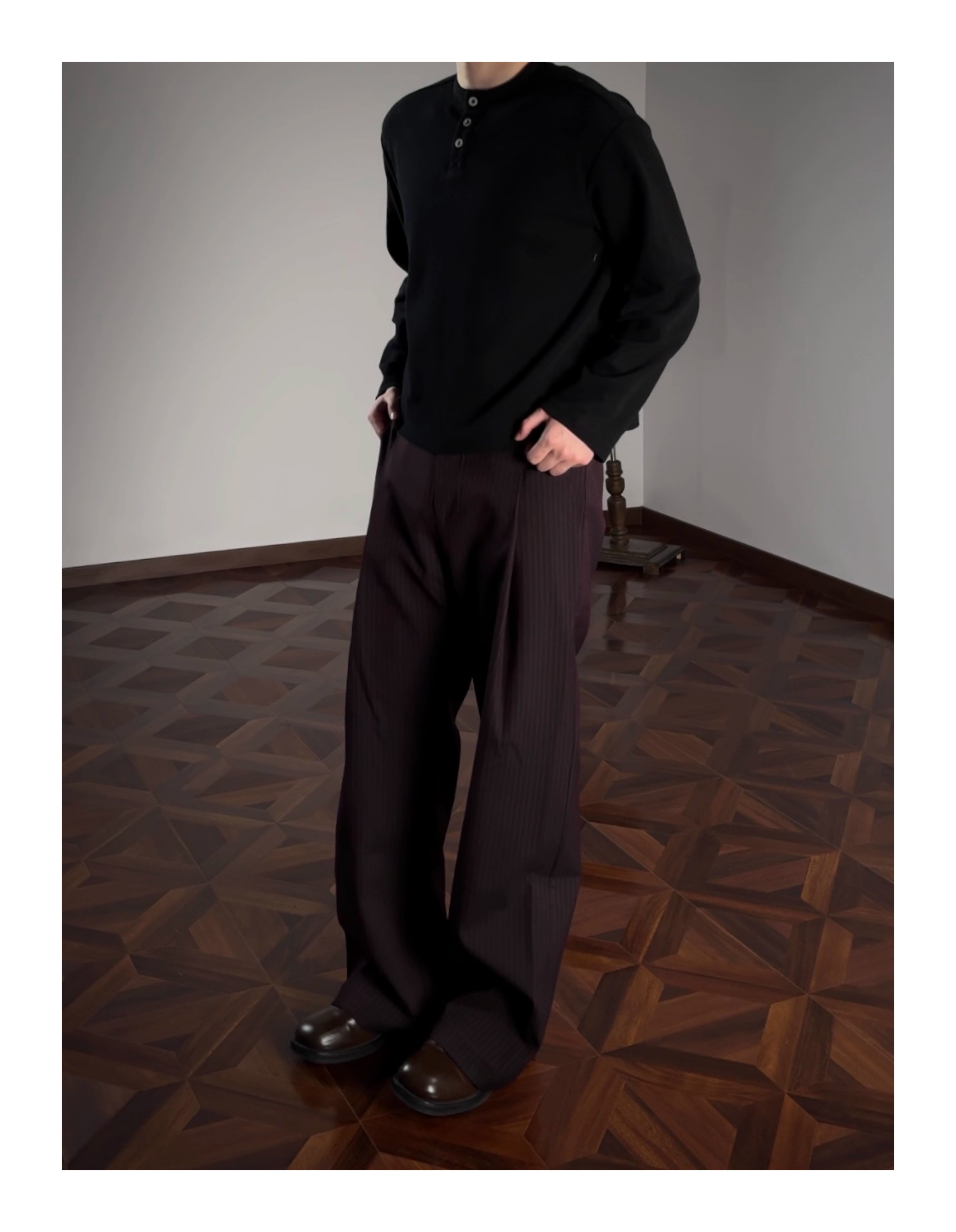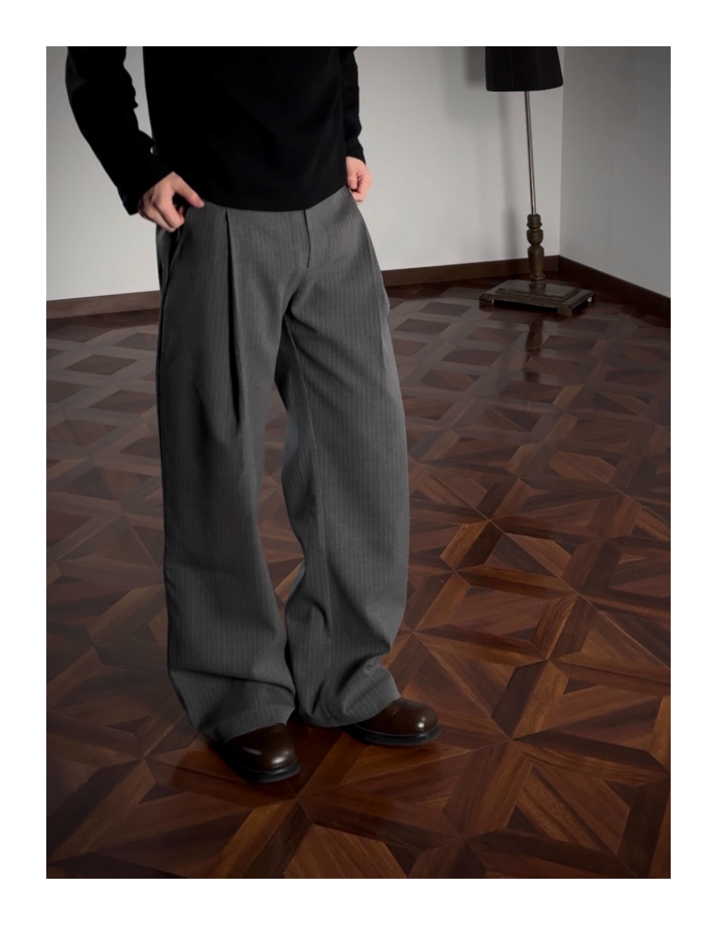 Oclin Diagonal Placket A-Line Straight Pleated Trousers with Striped Texture, Full Hemming, High-Rise Commuter Suit