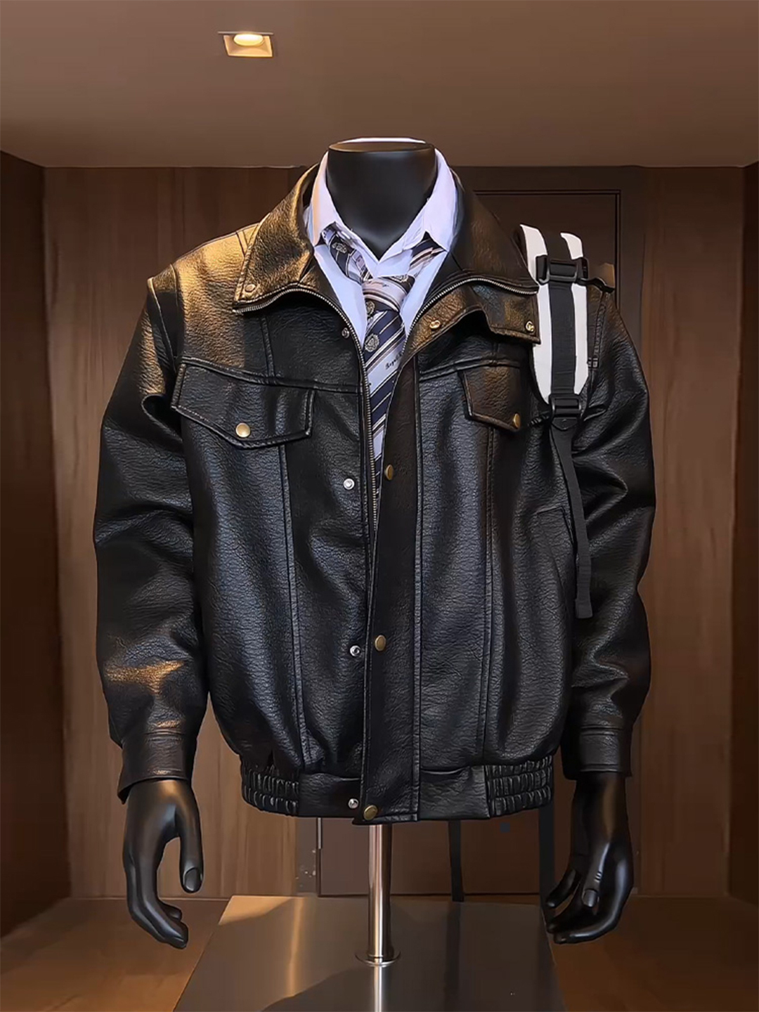 American-Style Bomber Silhouette Flight Jacket for Men, Autumn Short Leather Jacket with Regular Shoulders, High-End Vintage Motorcycle Jacket