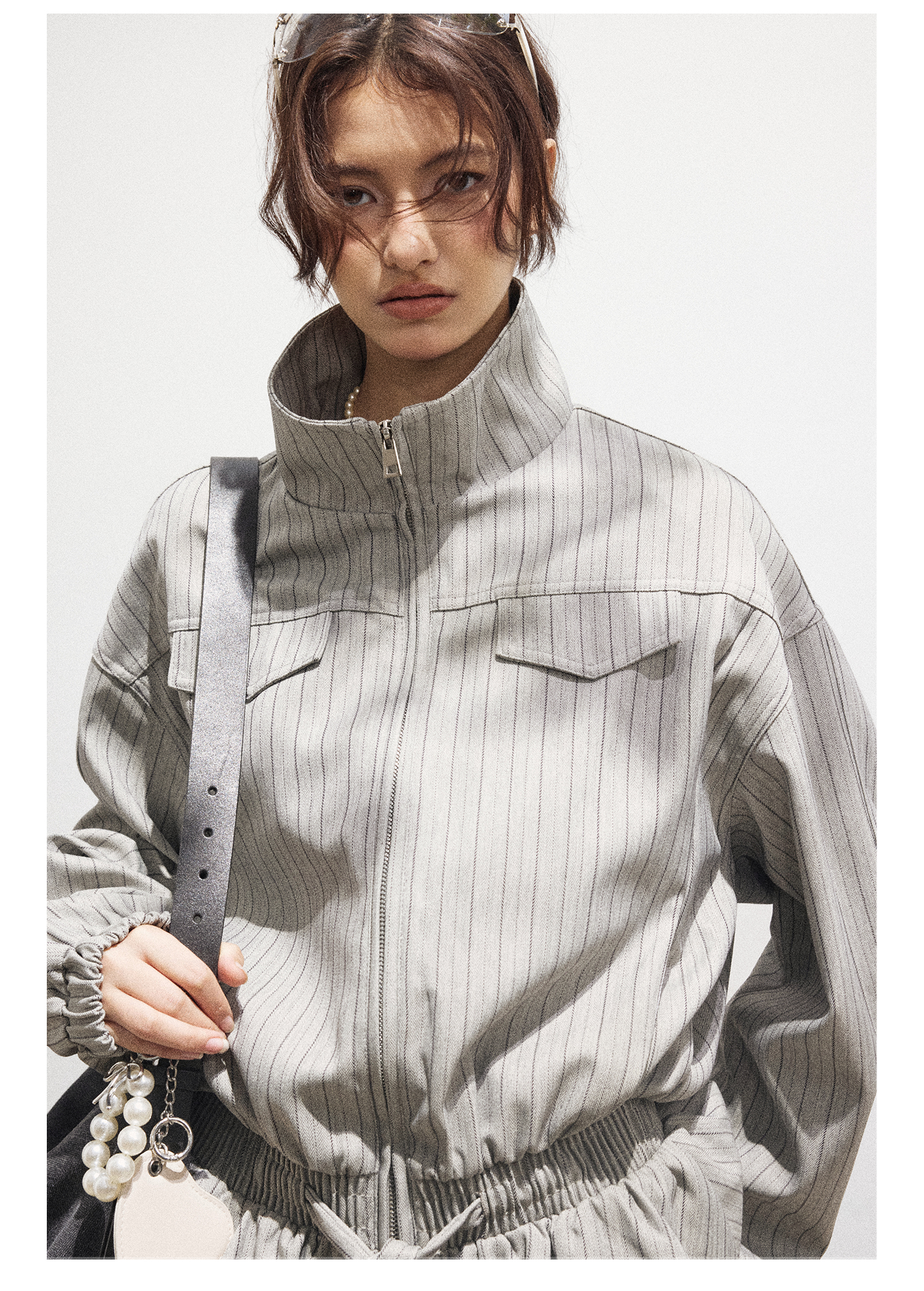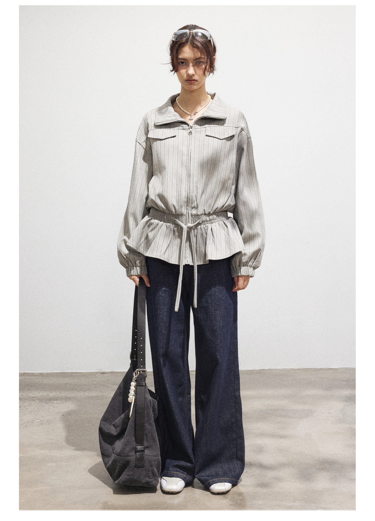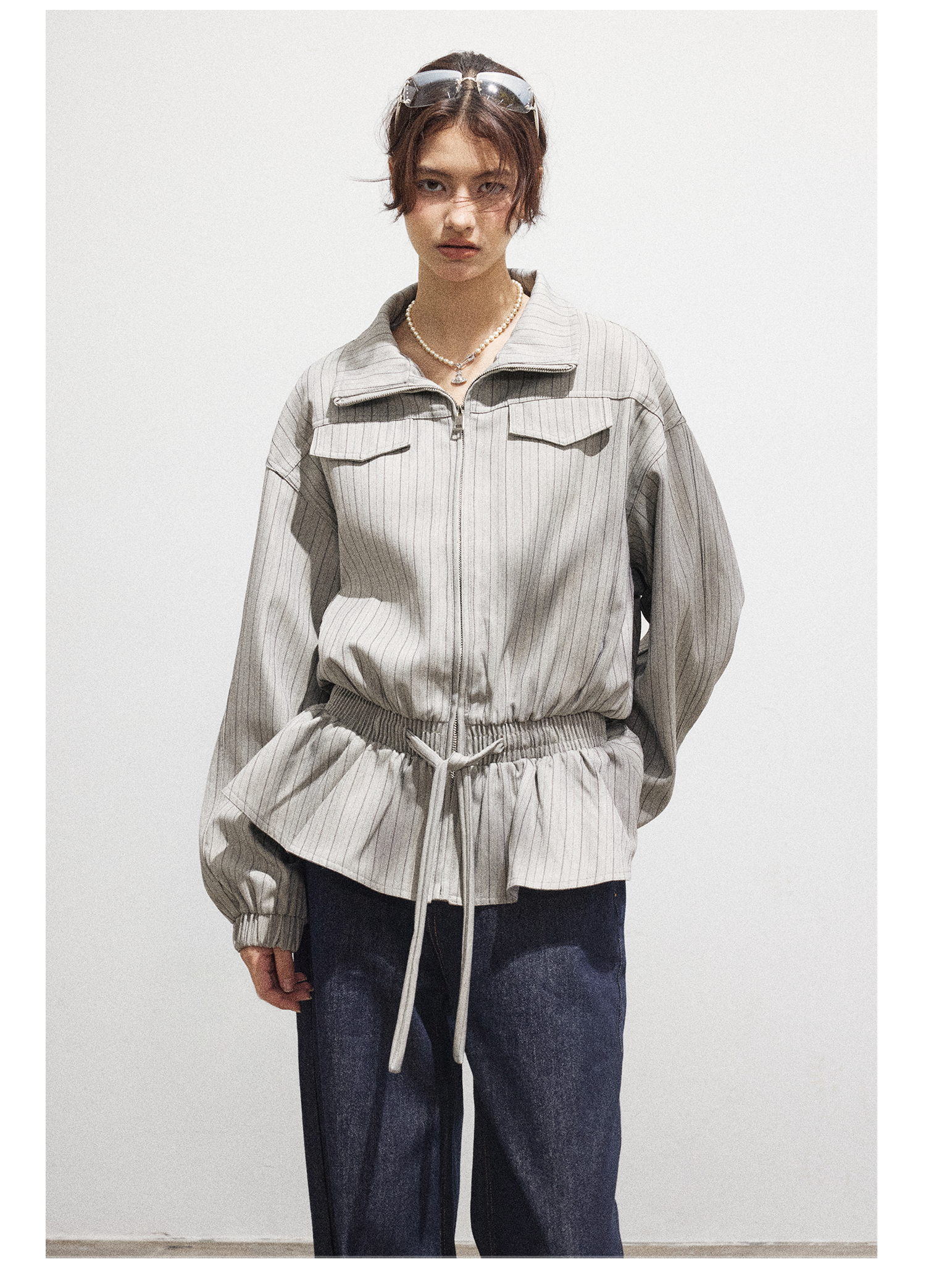 Besober Original Striped Lapel Drawstring Waist Jacket Stand Collar Zipper Casual Commuter Top for Autumn