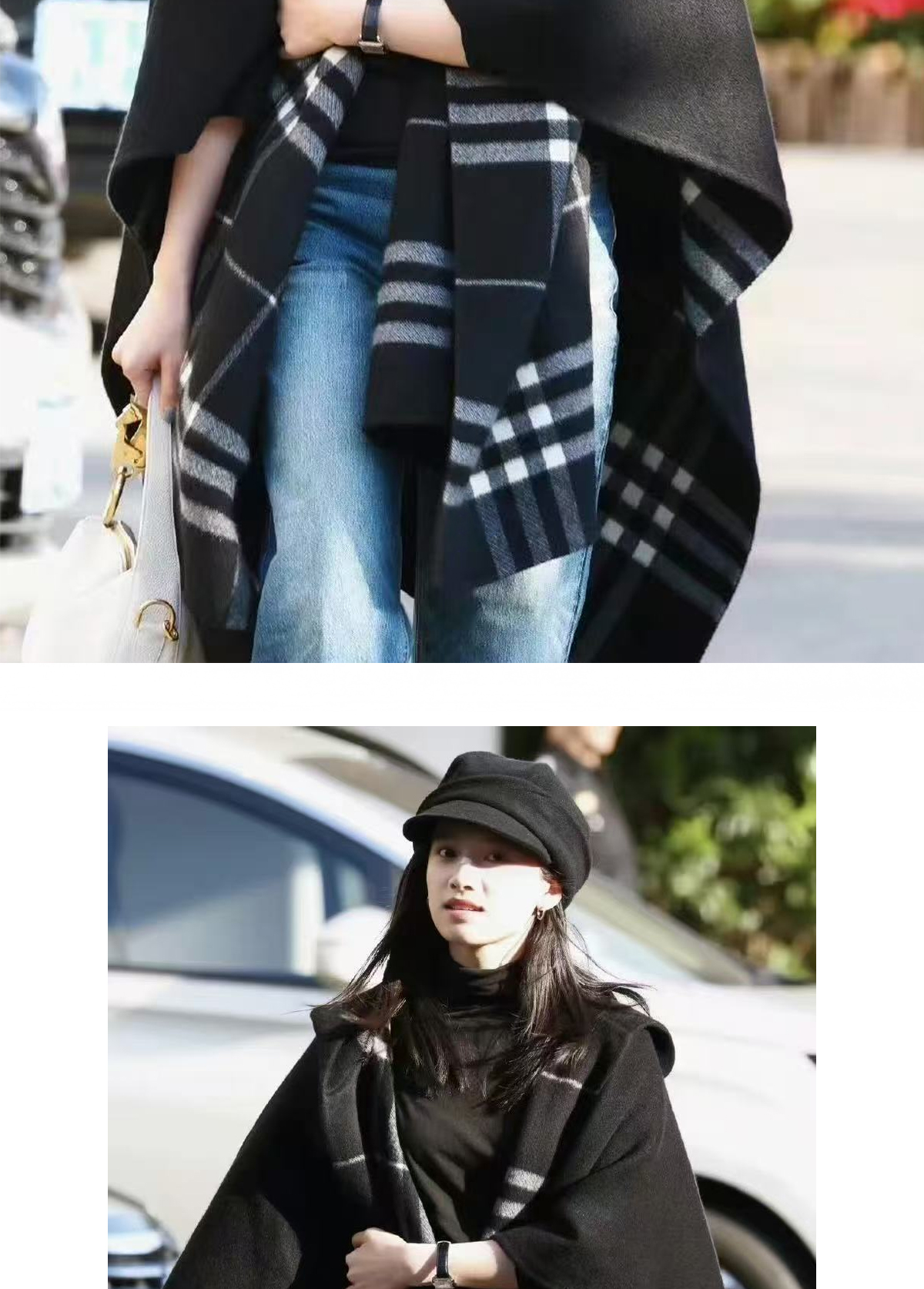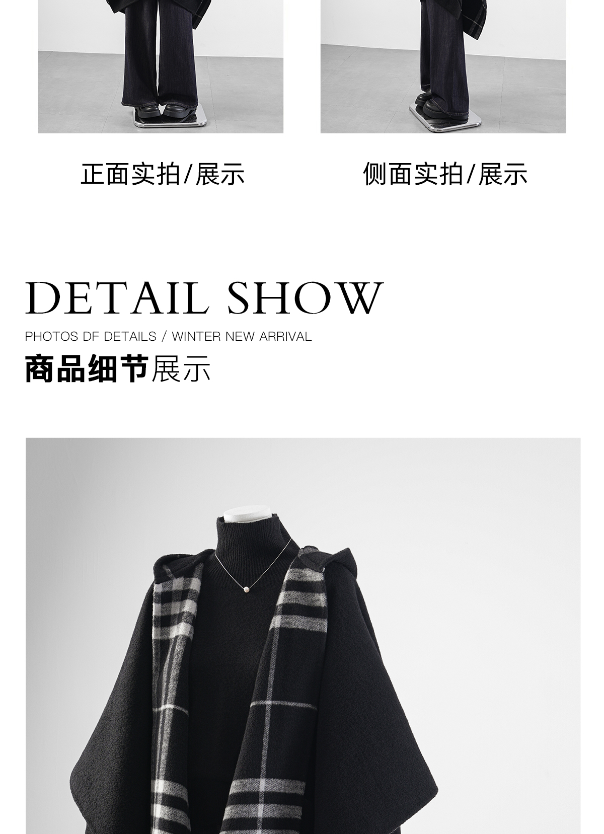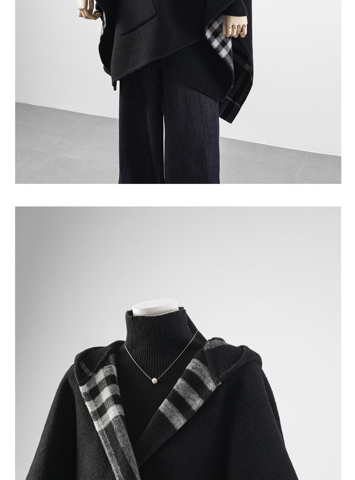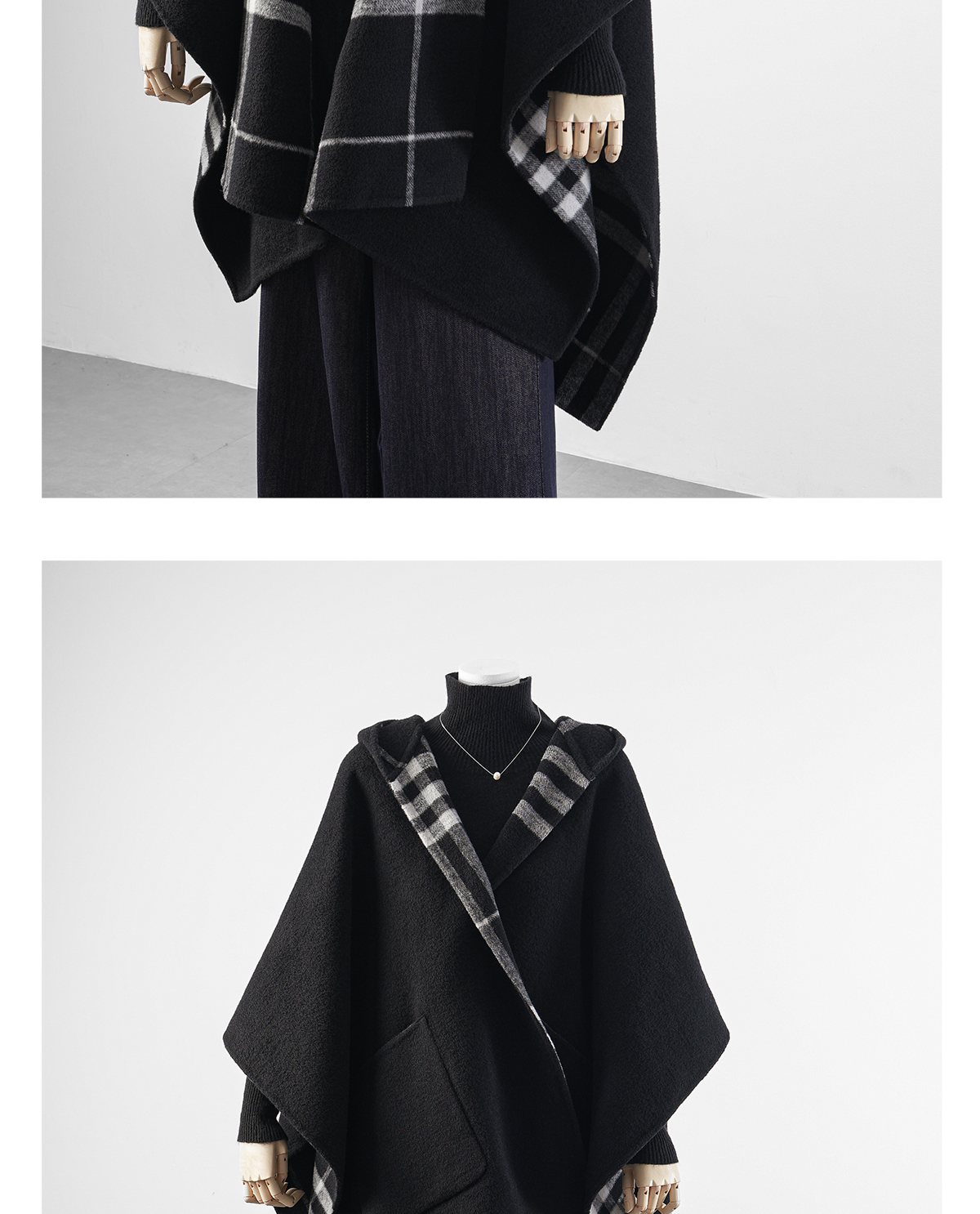 High-End Version ~ 100% Australian Wool Zhang Jingyi Style Black Plaid Shawl Cape Double-Sided Wool Hooded Coat