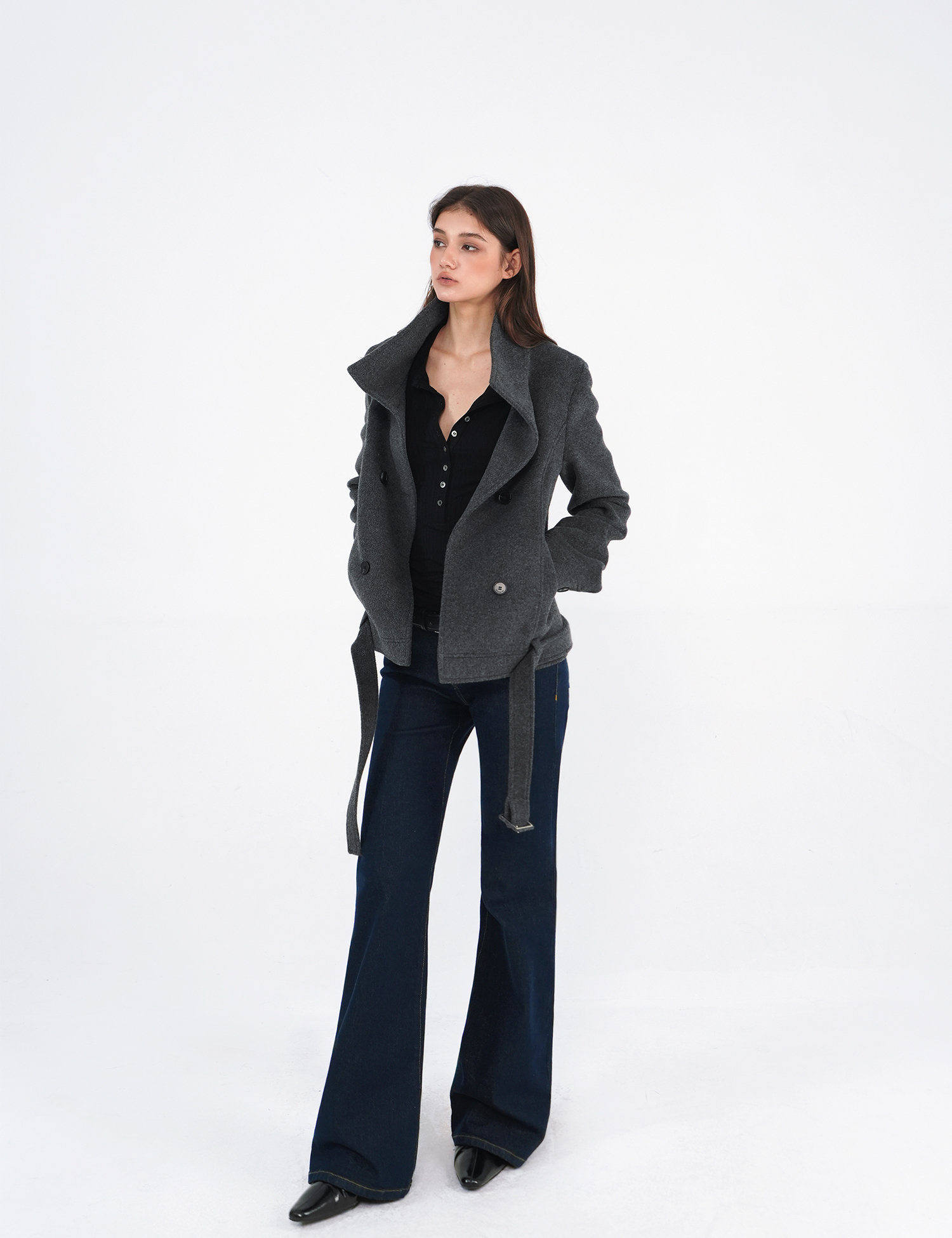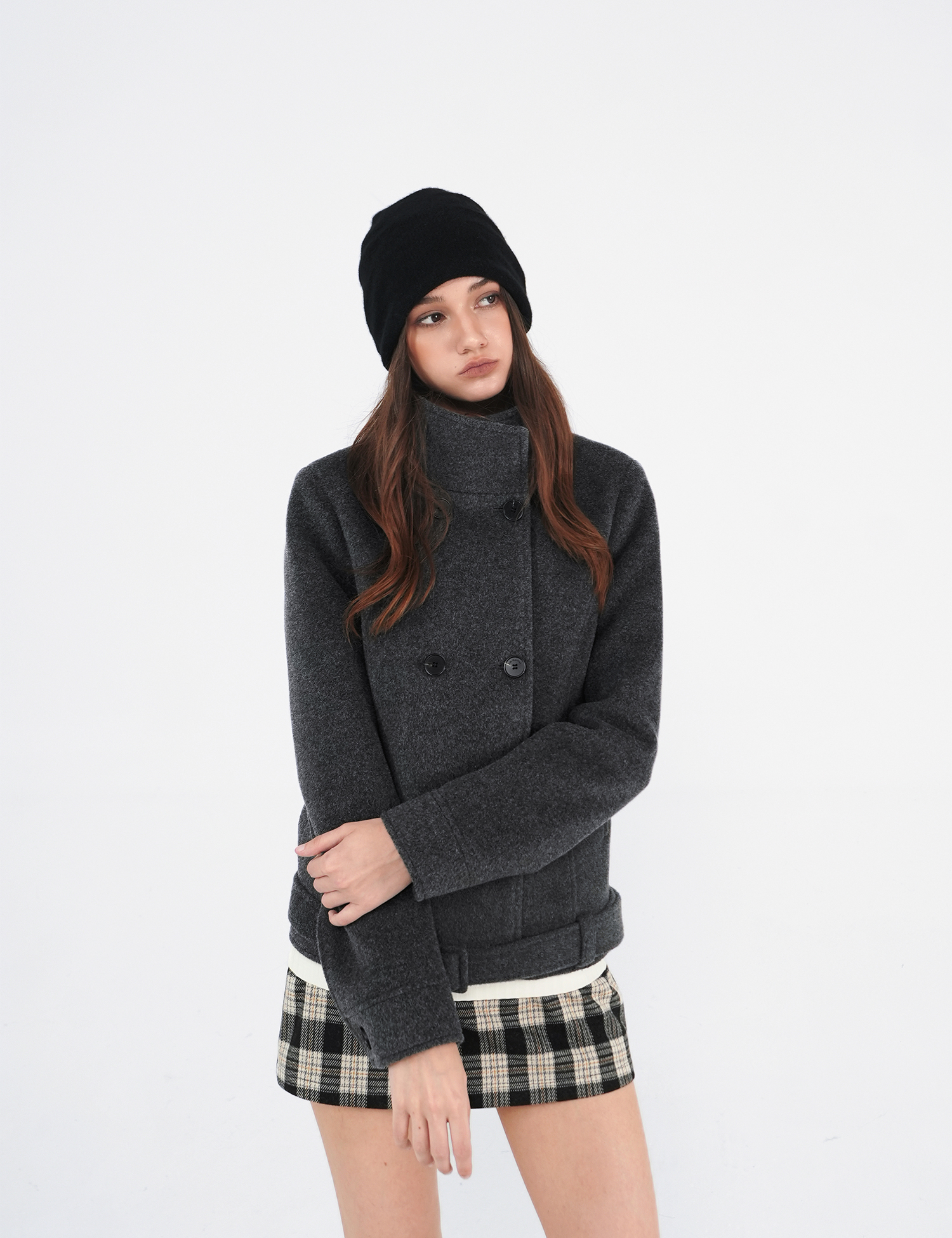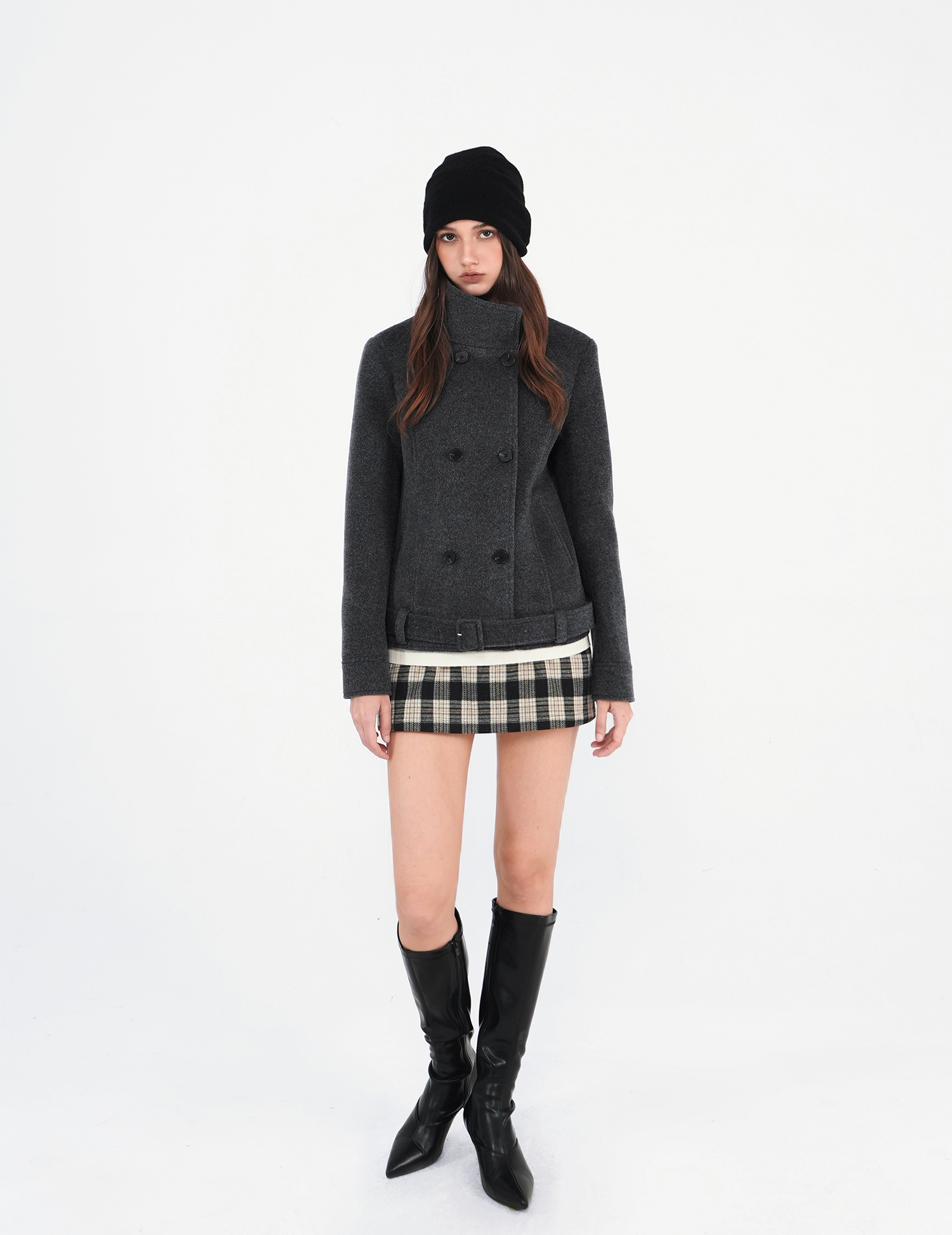 Jim Kennet All-Wool Stand-Up Collar Belted Short Double-Sided Woolen Coat