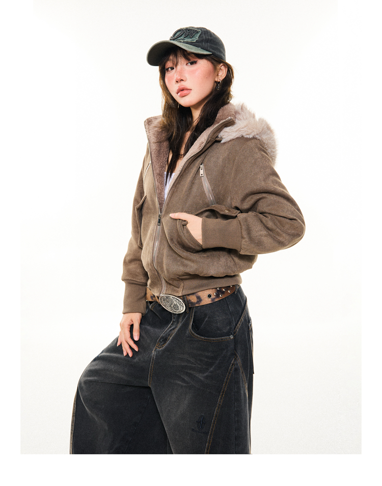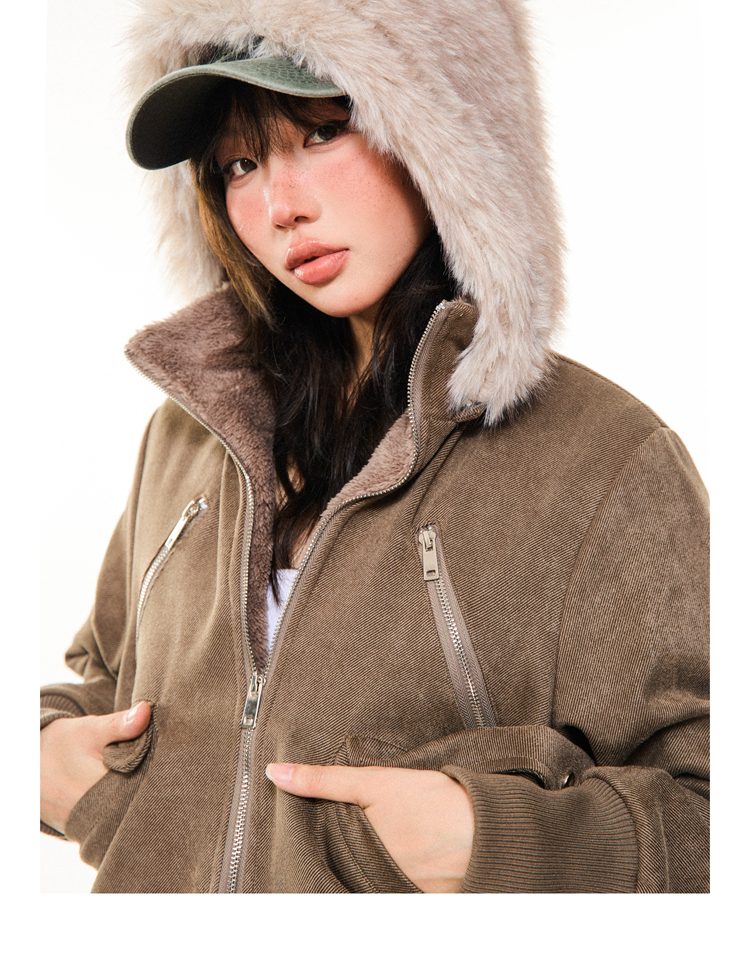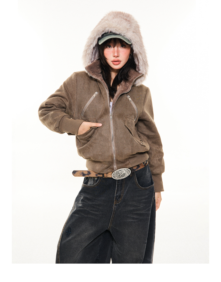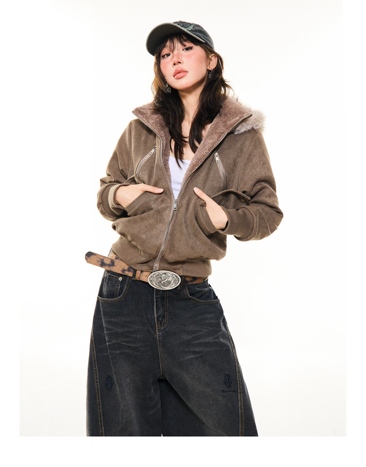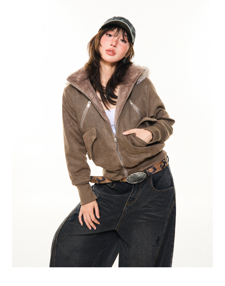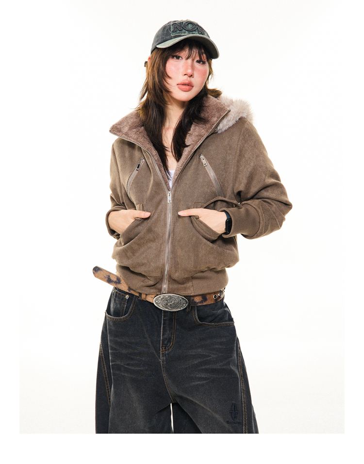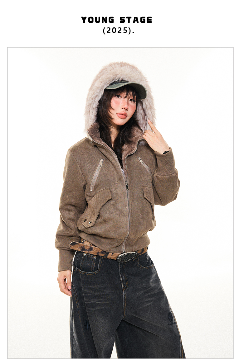 Young Stage Original American Retro Sexy Slim Fit Jacket for Women Winter Thickeneded Plush Lining Short Jacket
