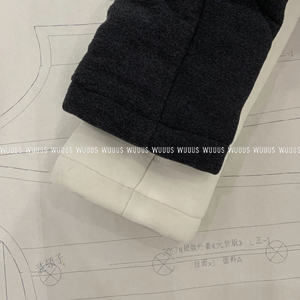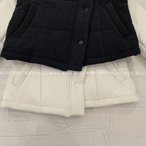 衣身采用规整方块绗缝工艺和分割拼接结合 上身效果更加挺括有型