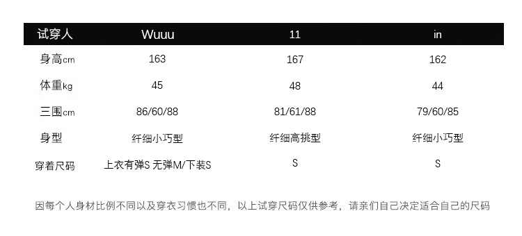 提醒:平面测量CM,因测量方法不同,存在2-3cm误差属于正常范围。试穿表格 仅供参考