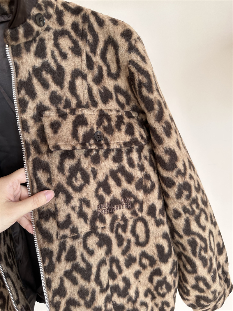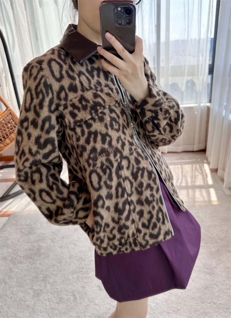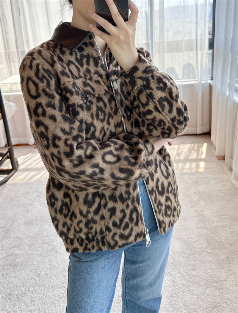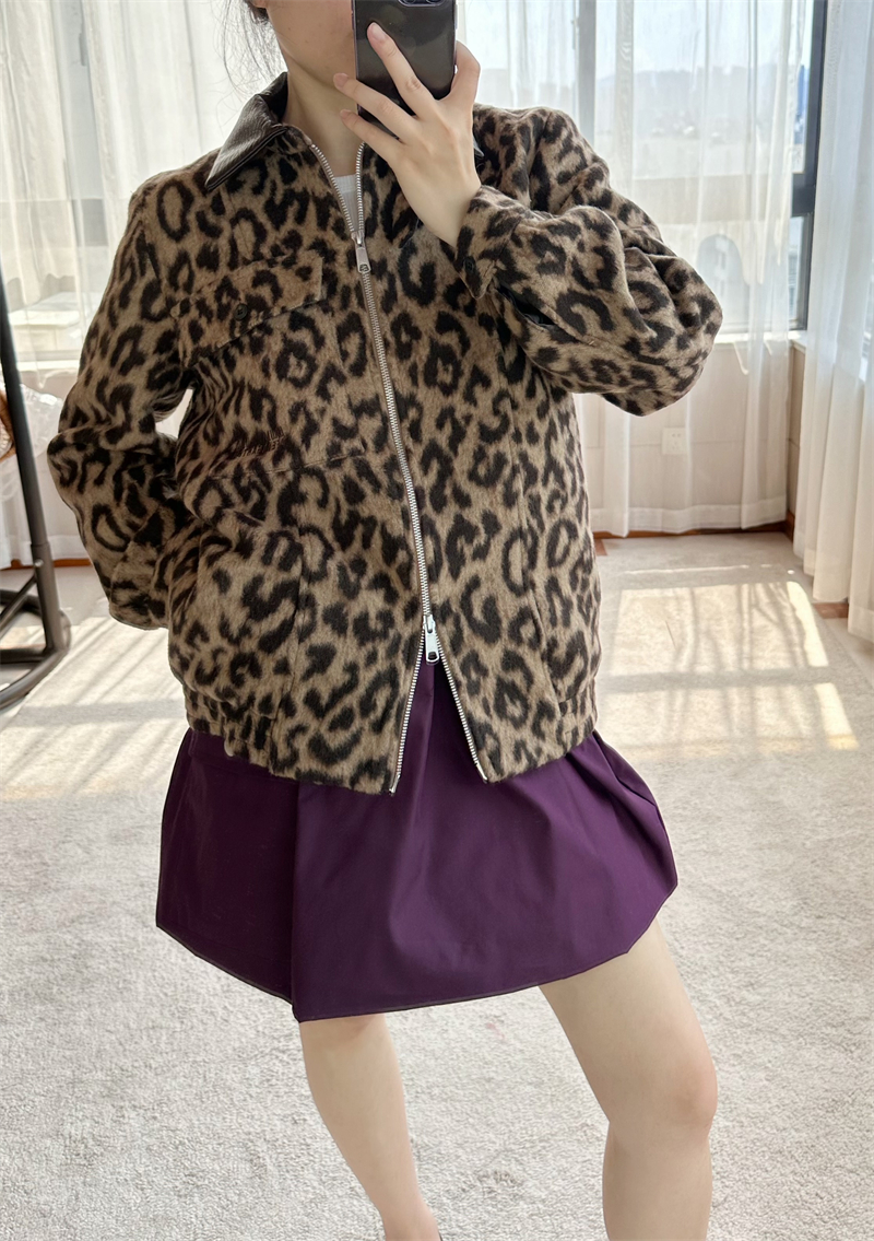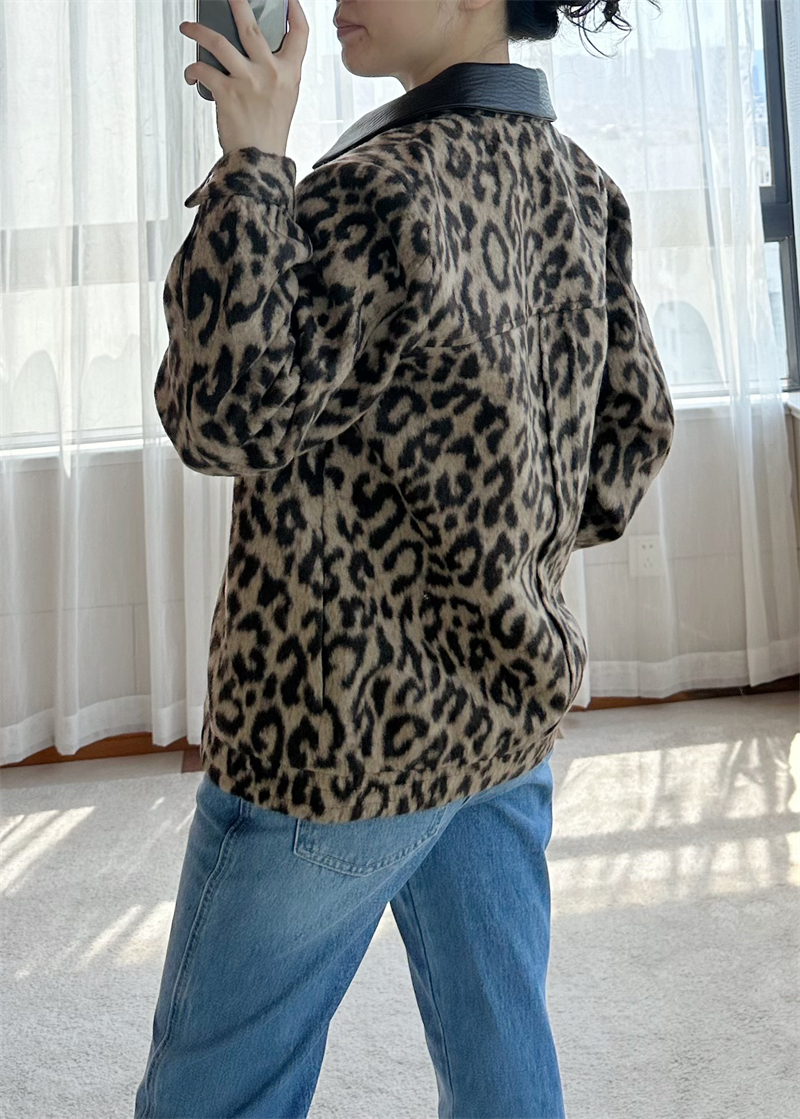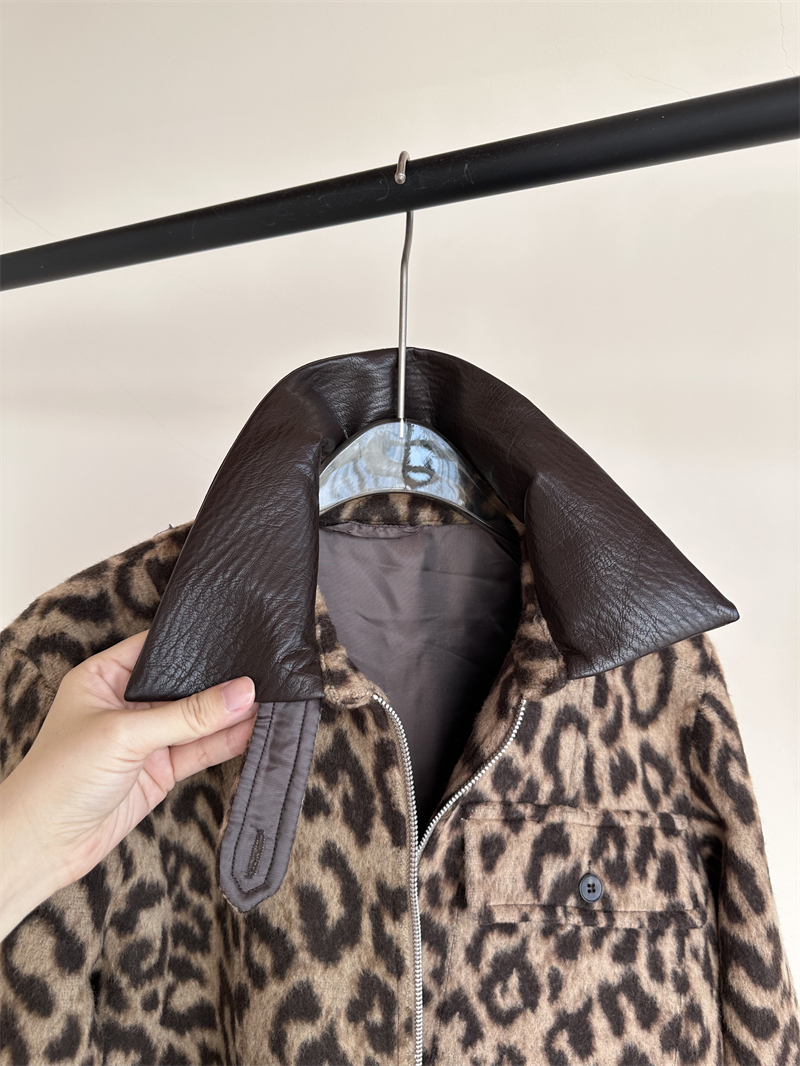 Trendy Aunt Nordic Bup Leopard Print Woolen Leather Patchwork Zipper Jacket/Double-Breasted Coat