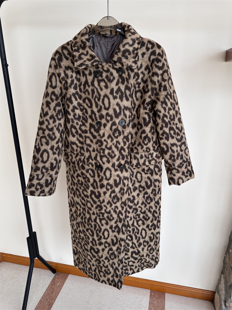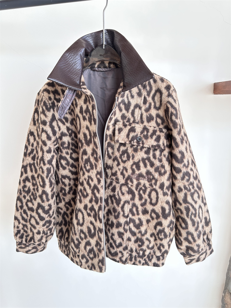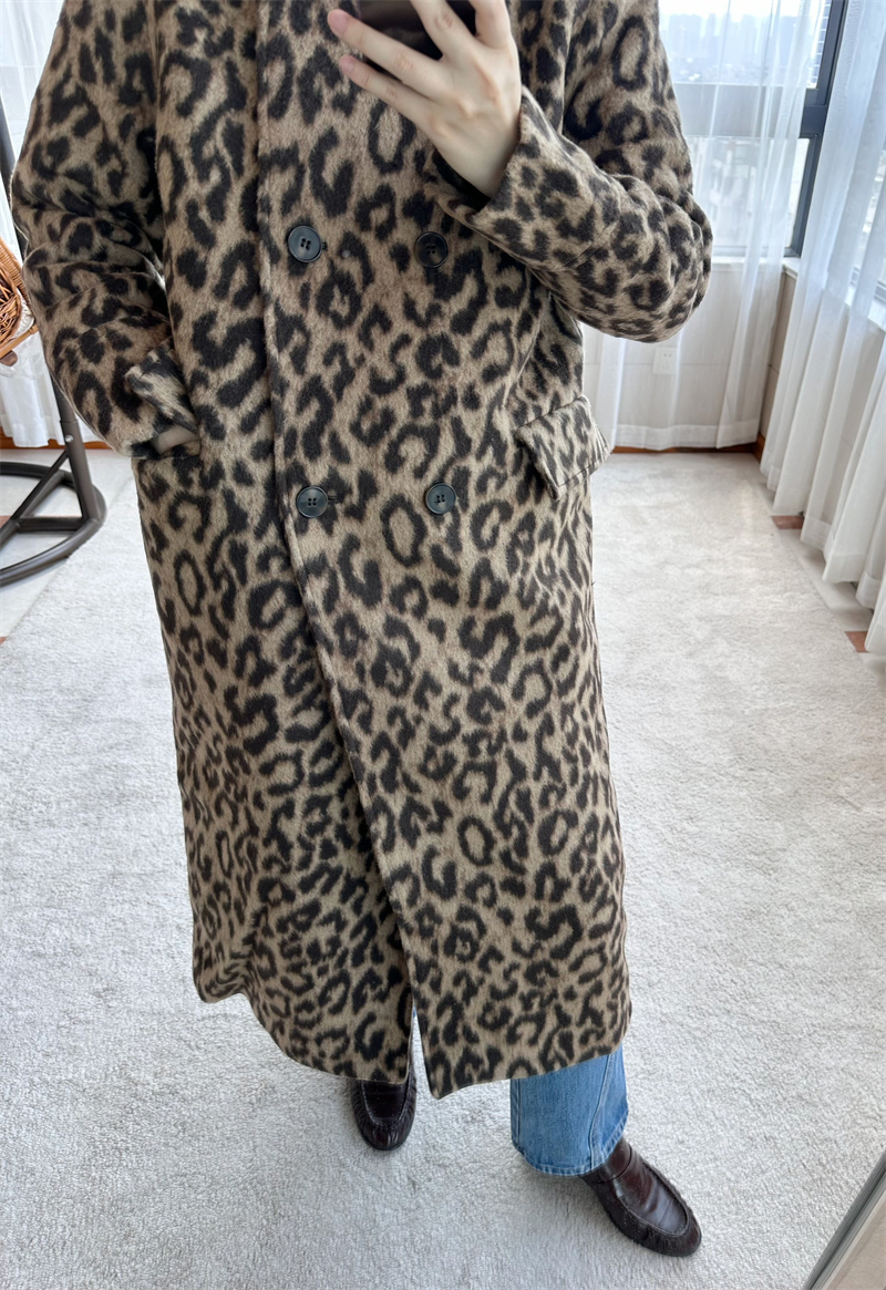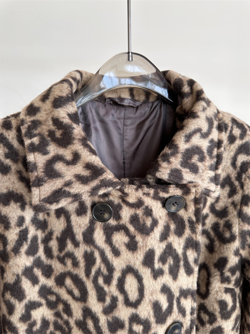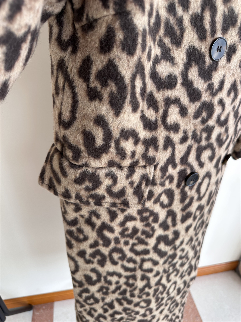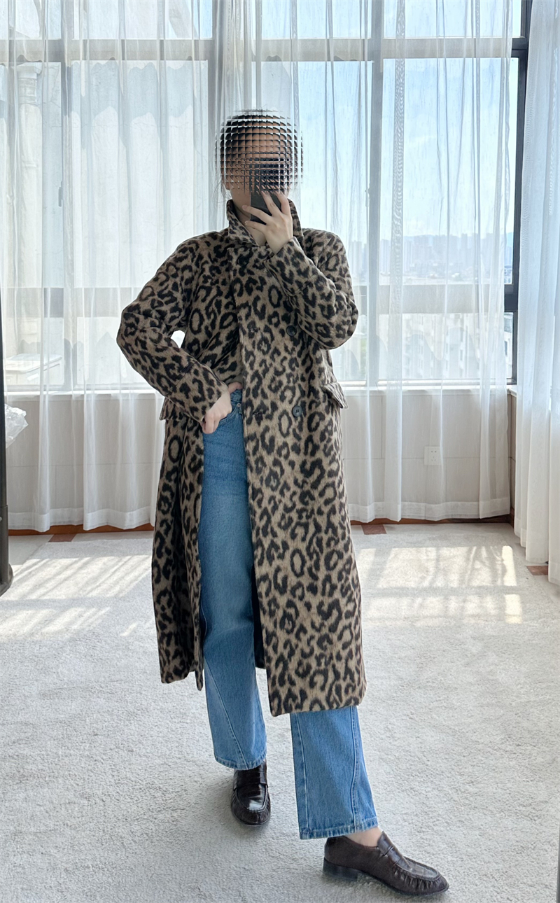 Trendy Aunt Nordic Bup Leopard Print Woolen Leather Patchwork Zipper Jacket/Double-Breasted Coat