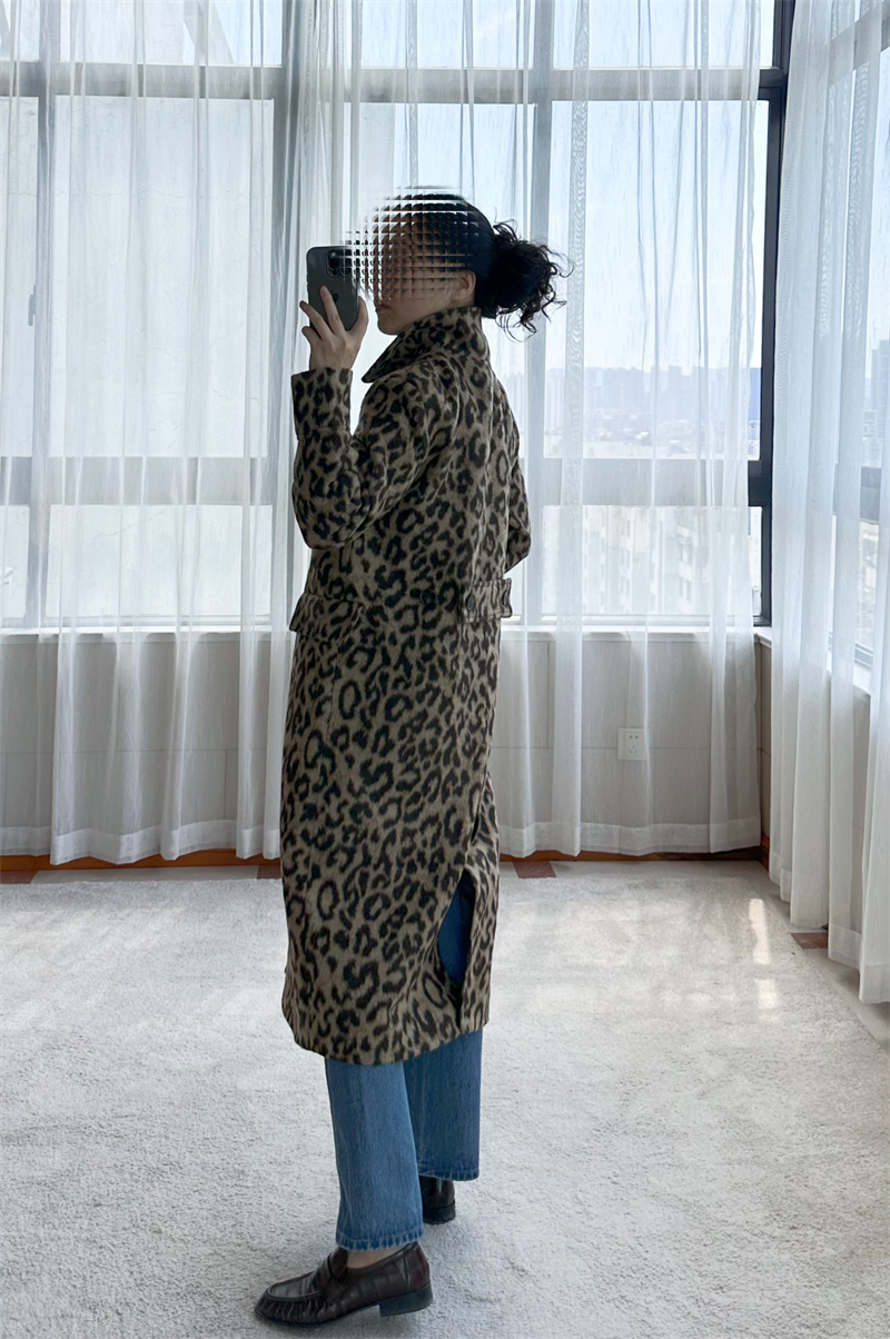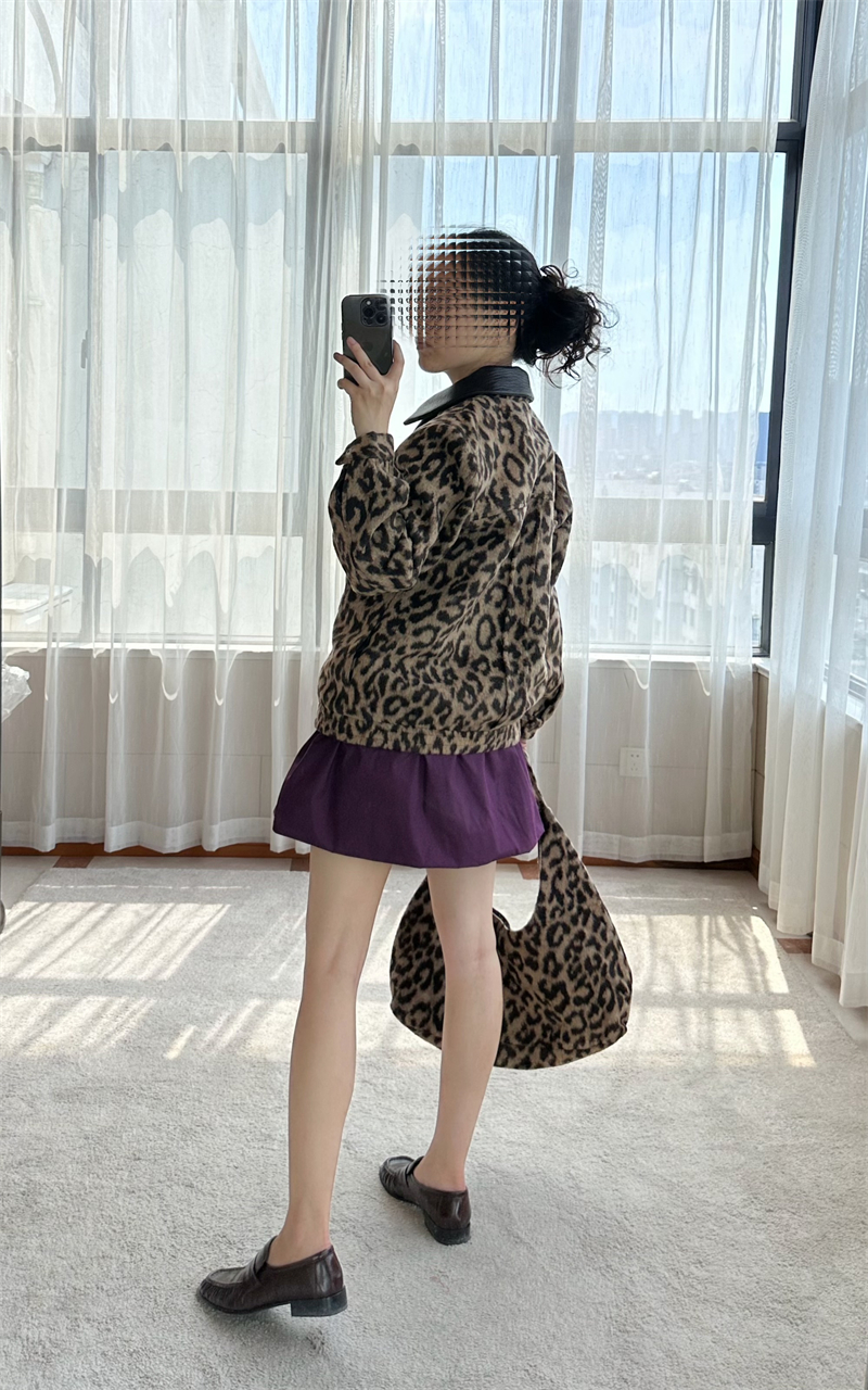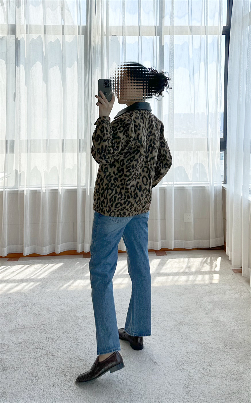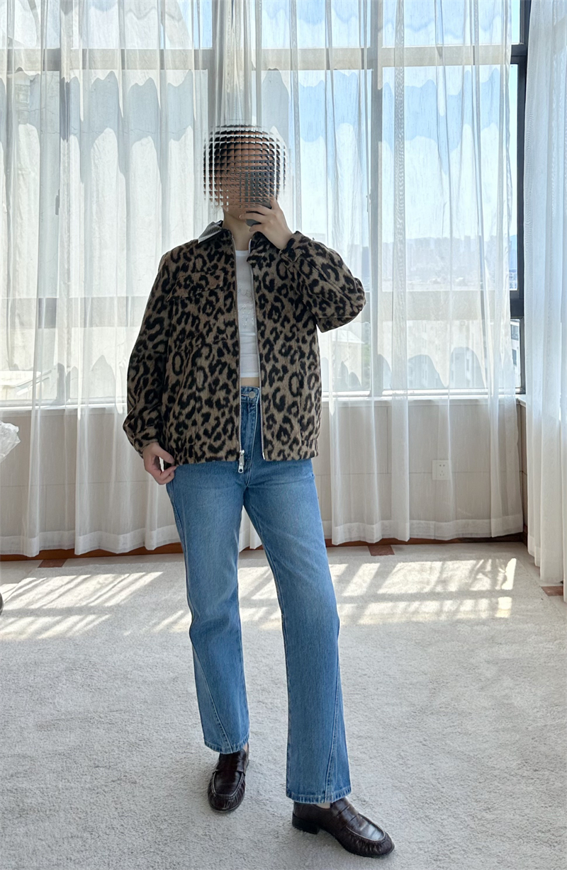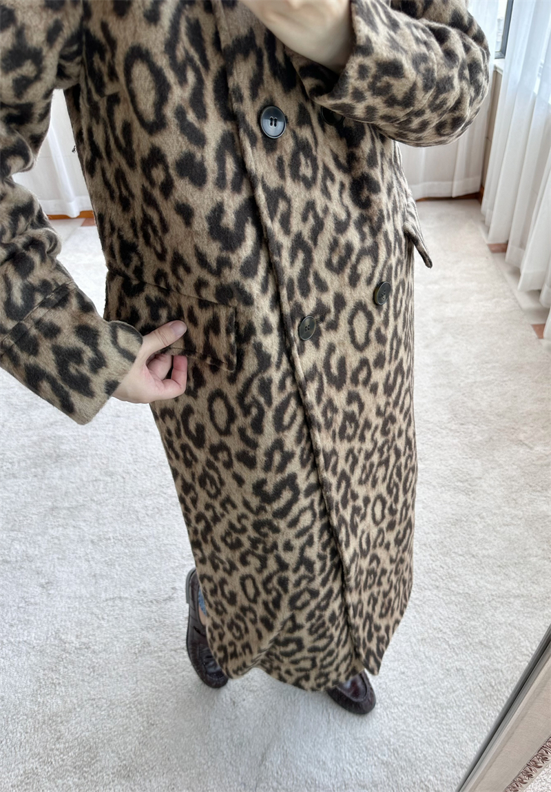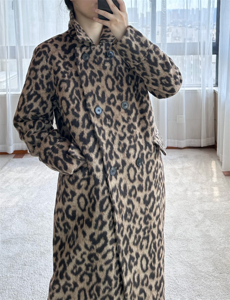 Trendy Aunt Nordic Bup Leopard Print Woolen Leather Patchwork Zipper Jacket/Double-Breasted Coat