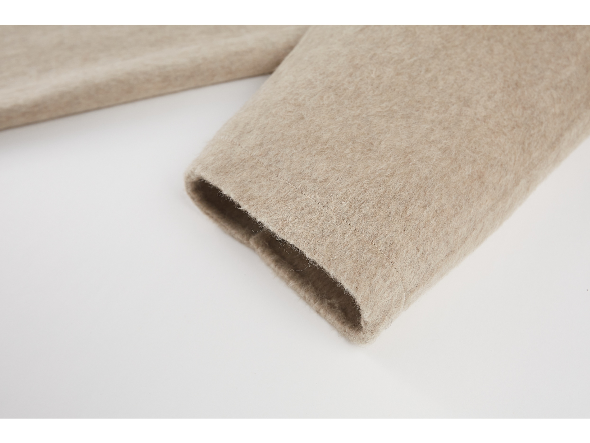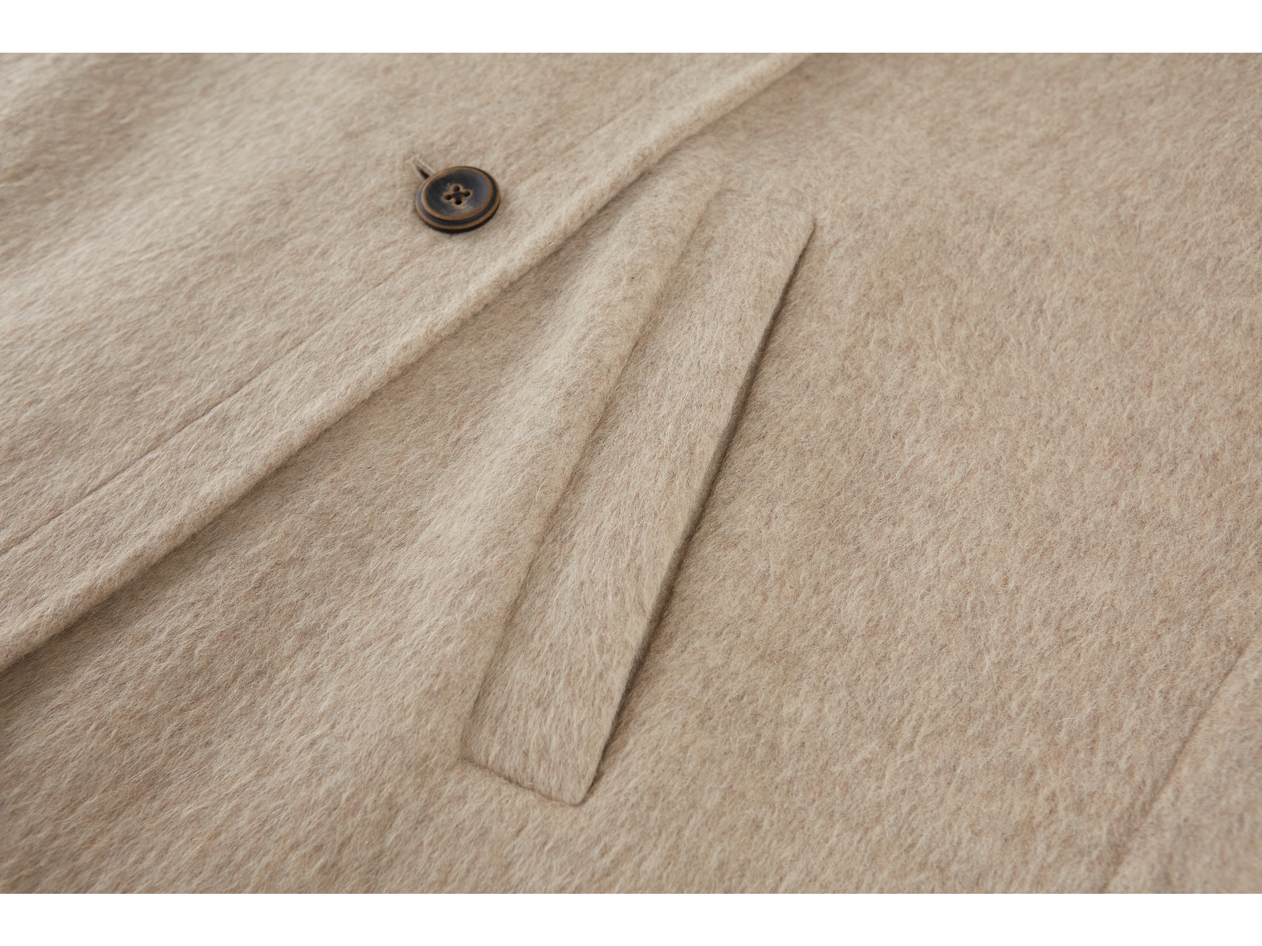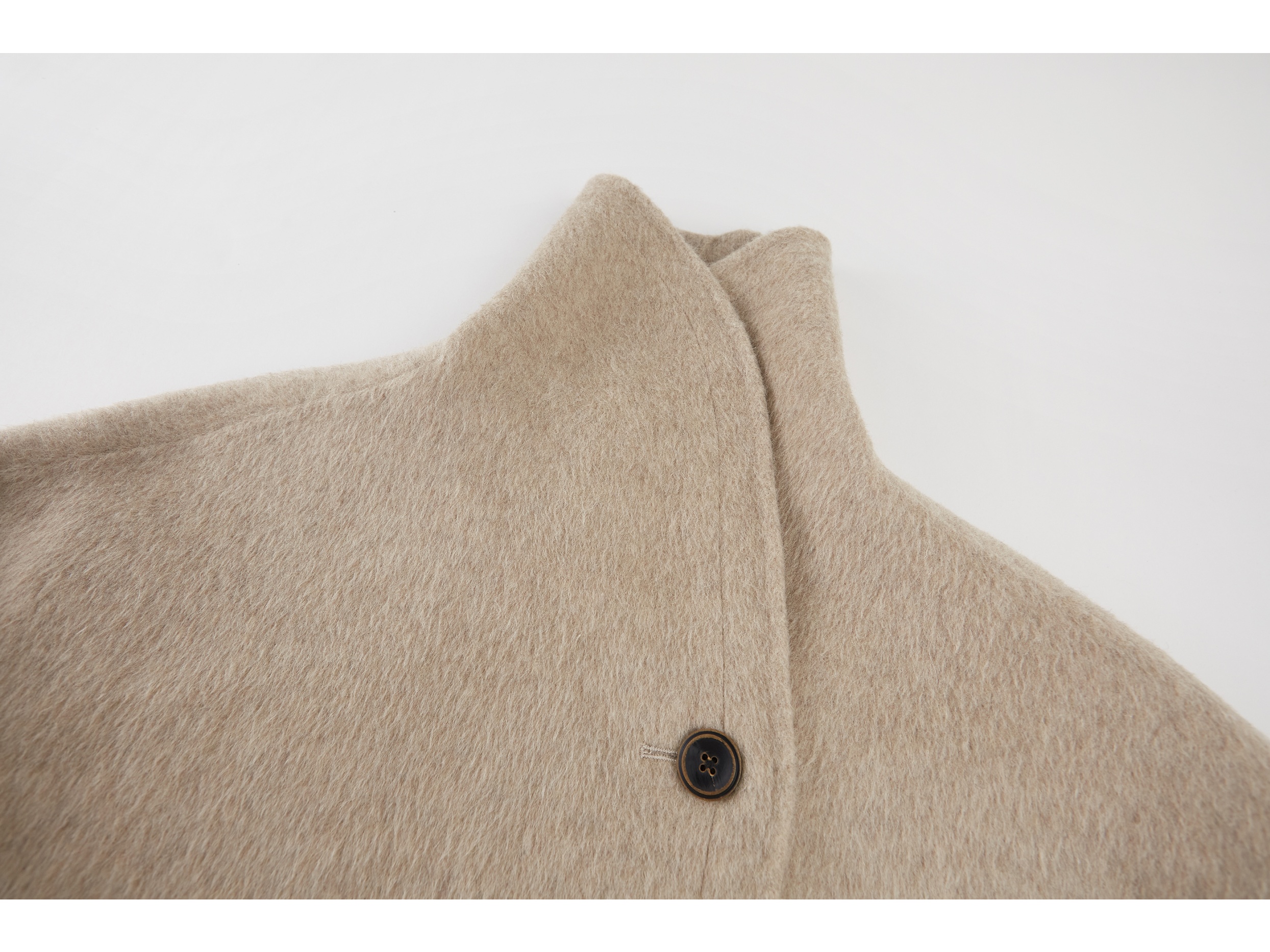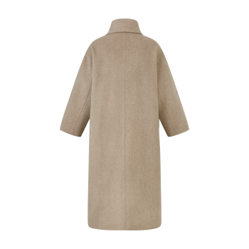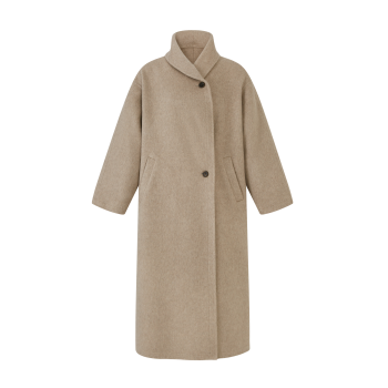 本款大衣采用70支羊毛蚕丝骆驼绒混纺双面呢料