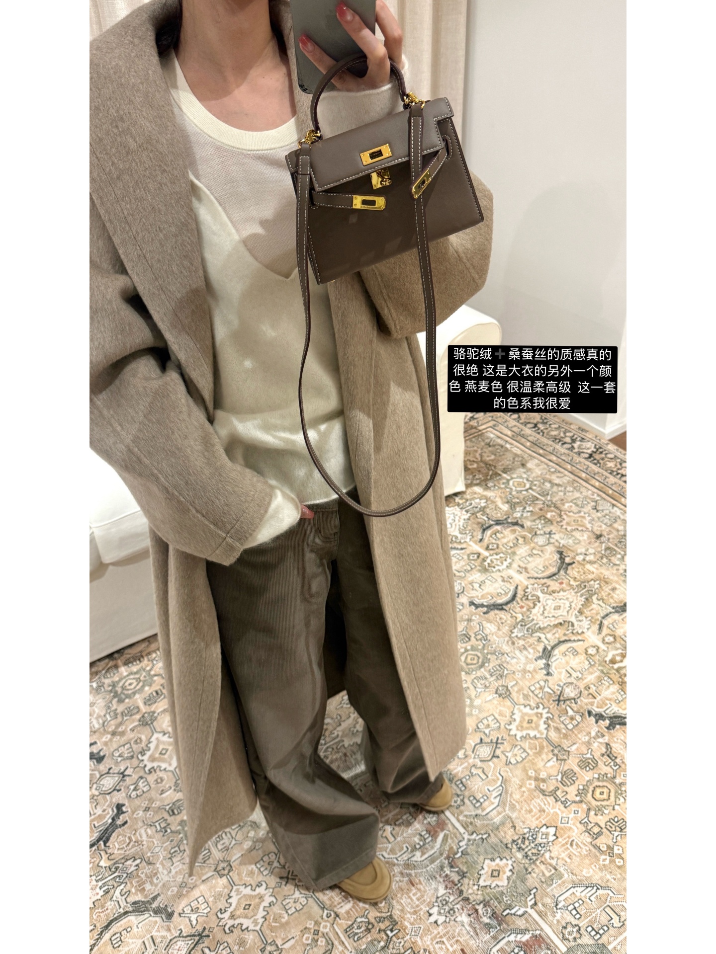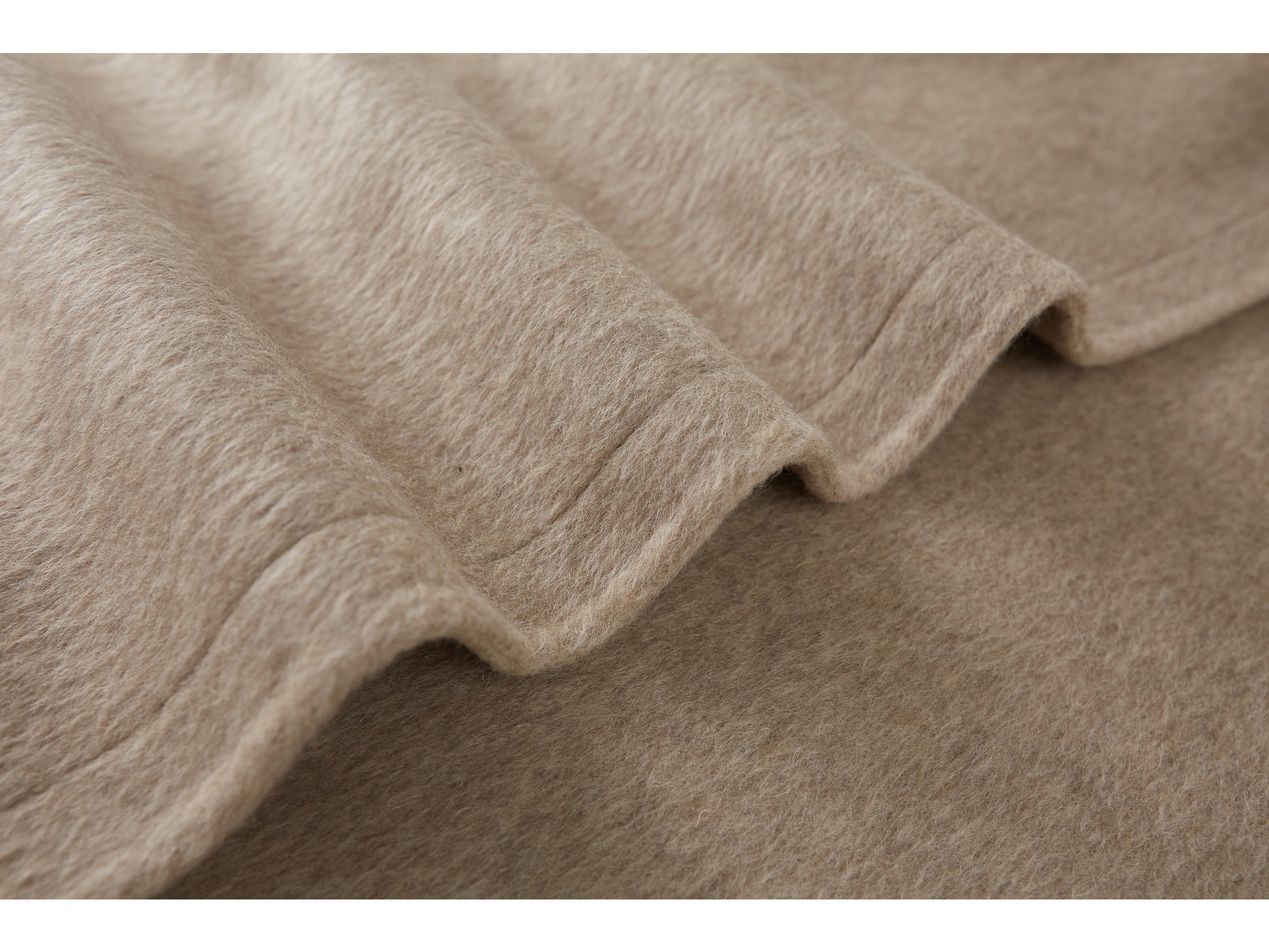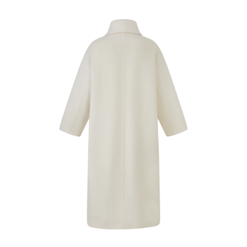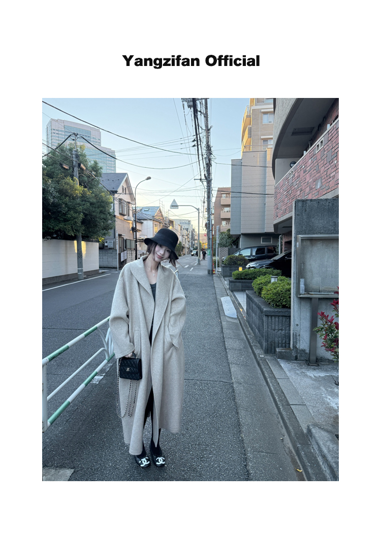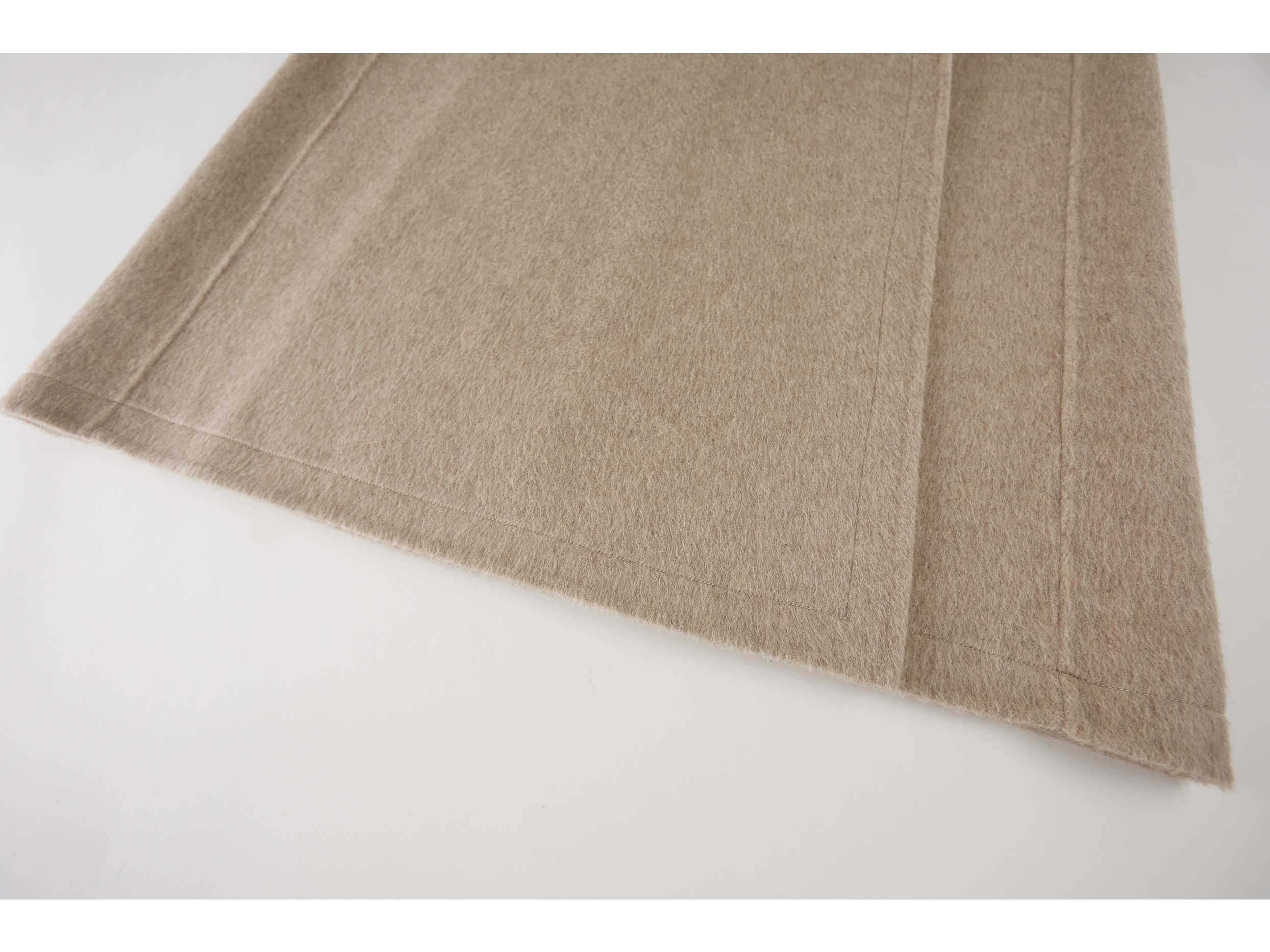 本款大衣采用70支羊毛蚕丝骆驼绒混纺双面呢料